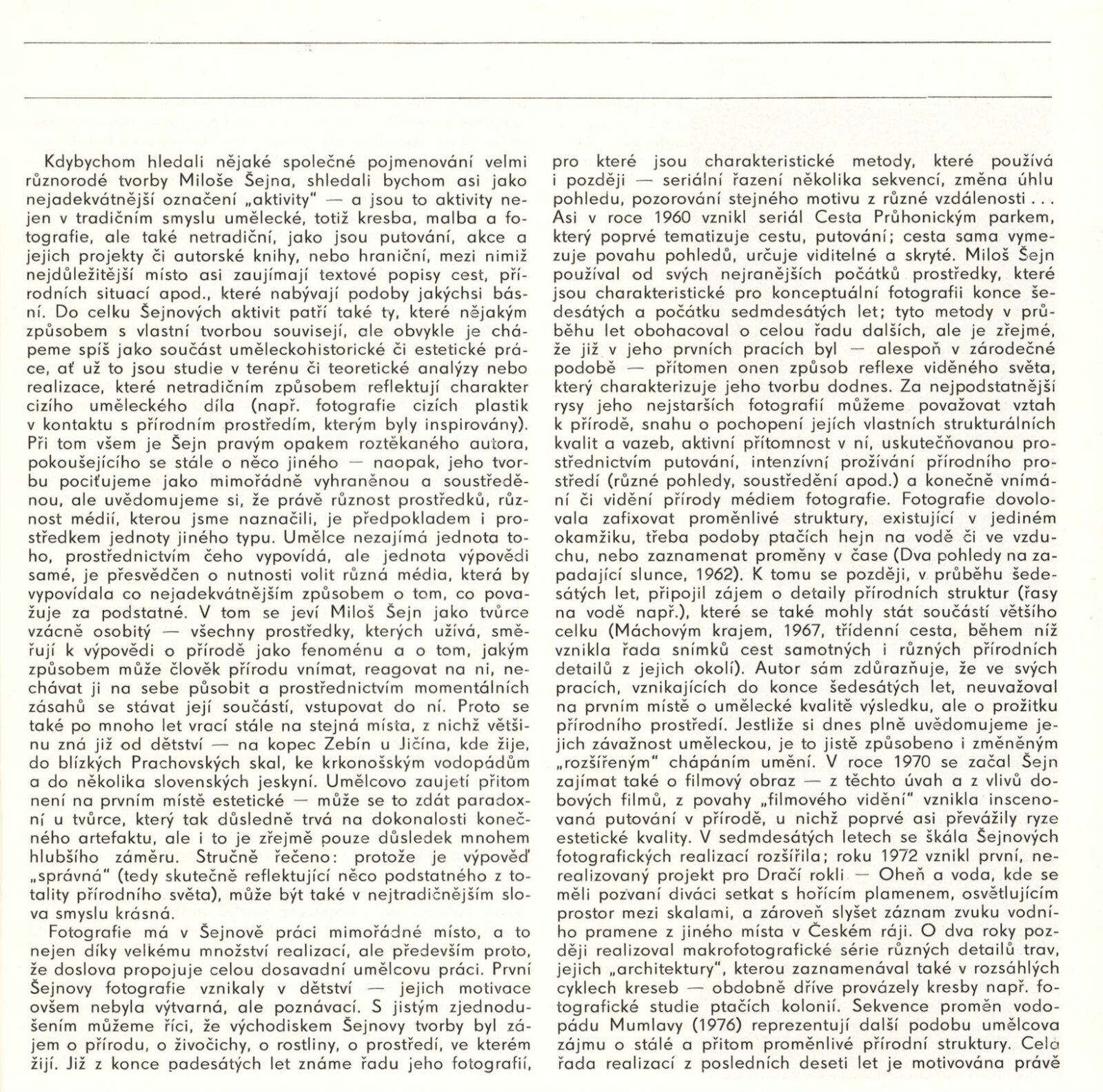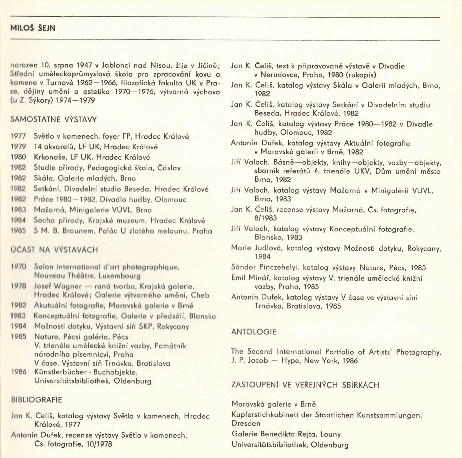 Miloš Šejn. Fotografie, kresby, knihy: Dům umění / Dům pánů z Kunštátu, Kabinet fotografie Jaromíra Funka, 8. 4. – 18. 5. 1986 / Texty: Antonín Dufek, Jiří Valoch. – Brno: DUmB, 1986. – [29] s., obr., životní data, výstavy, zastoupení ve sbírkách, bibliografie, DPK 868. – MZK; MG; MMB
