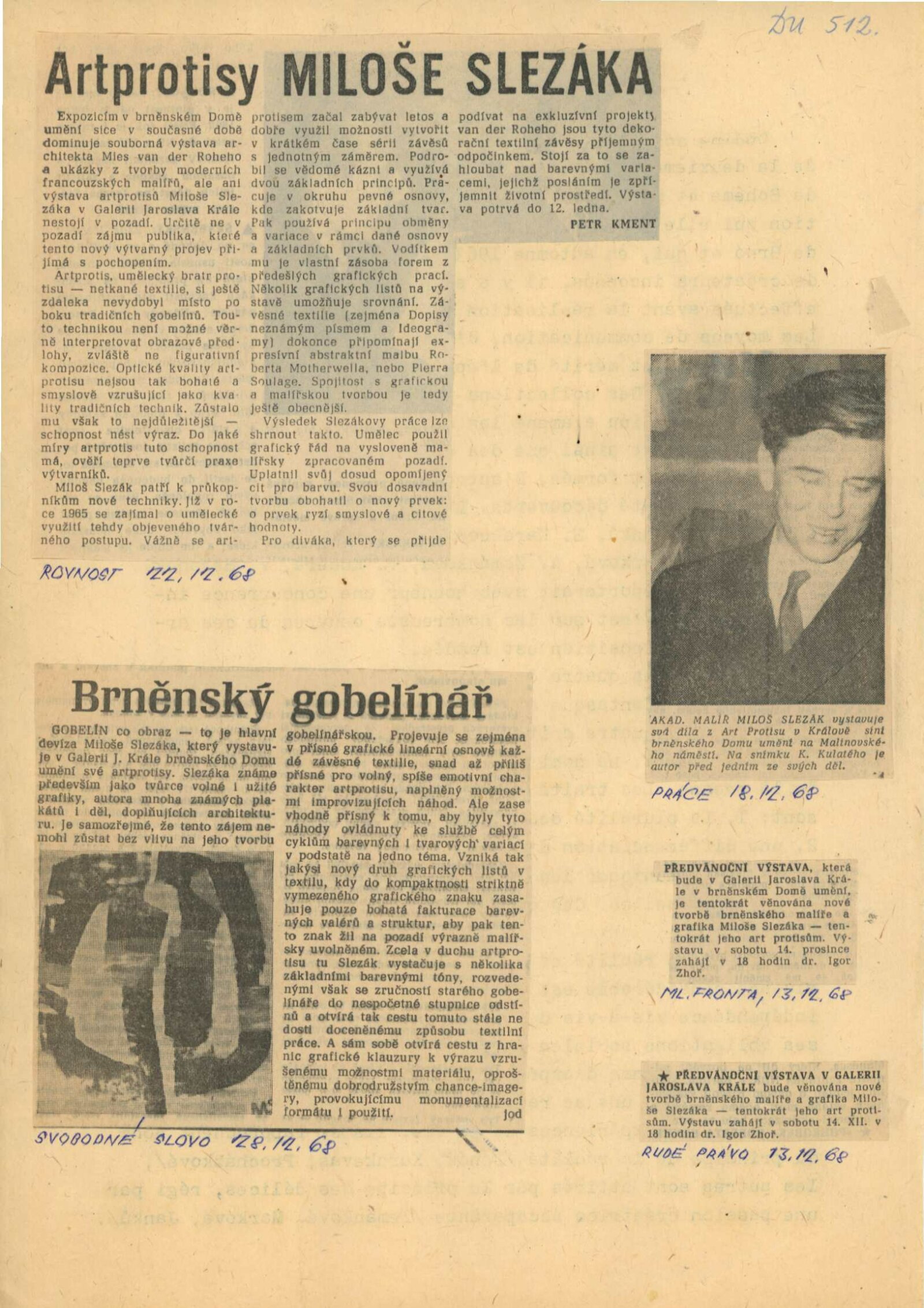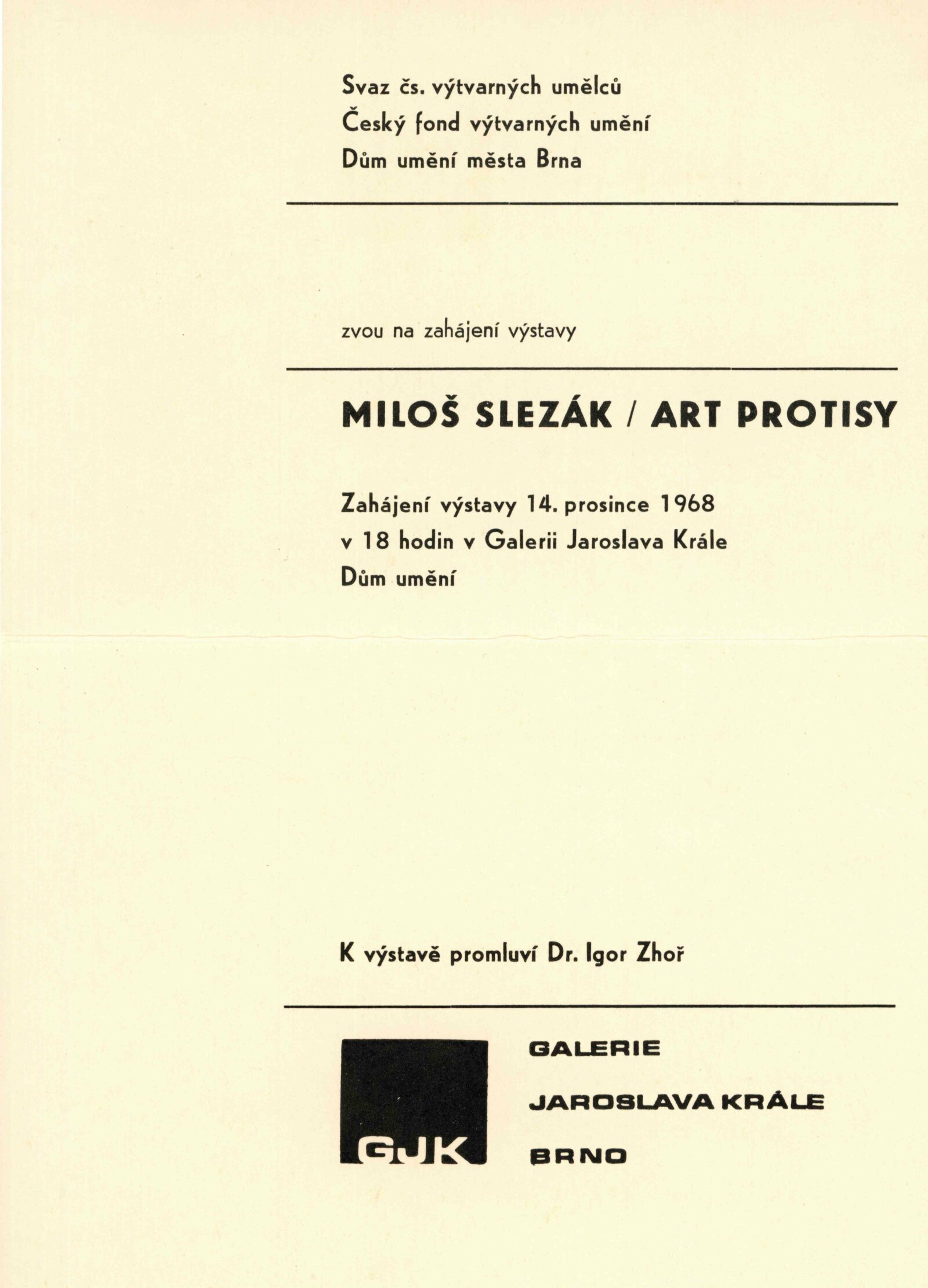 Miloš Slezák. Artprotis: Dům umění, 21. výstava v Galerii Jaroslava Krále, 14. 12. 1968 – 12. 1. 1969 / Text: Igor Zhoř. – Brno: ČFVU, 1968. – 10 s., obr., portrét, životopis, DU 512. – MZK; MG