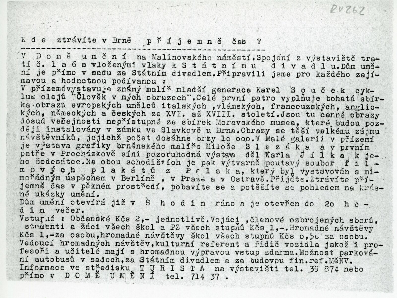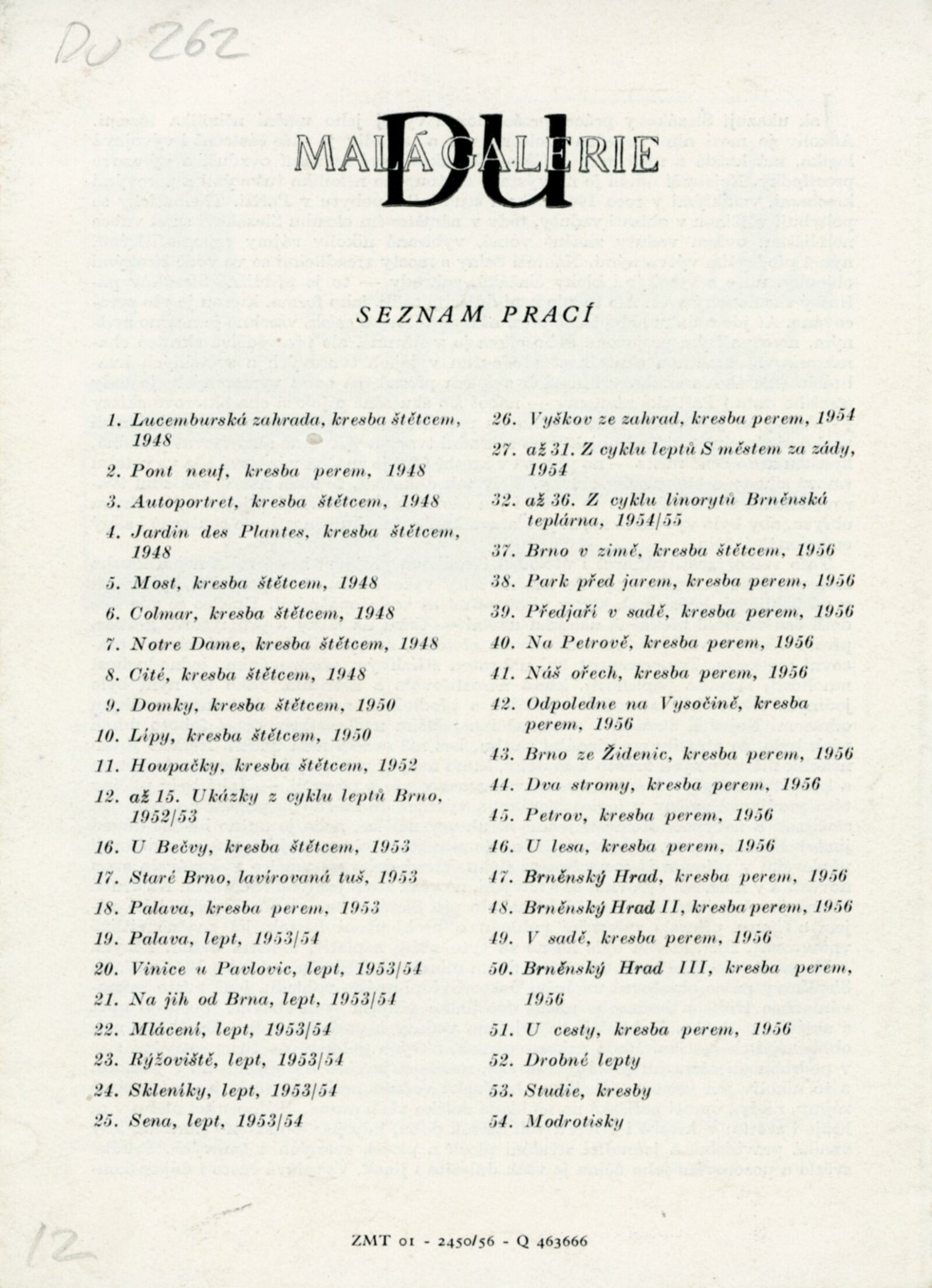 pozvánka, katalog s básní Jana Skácela a textem Zdeňka Kudělky, seznam prací, text pro média „Kde strávíte v Brně příjemně čas“ (pozvánka na výstavy DU 260–264)