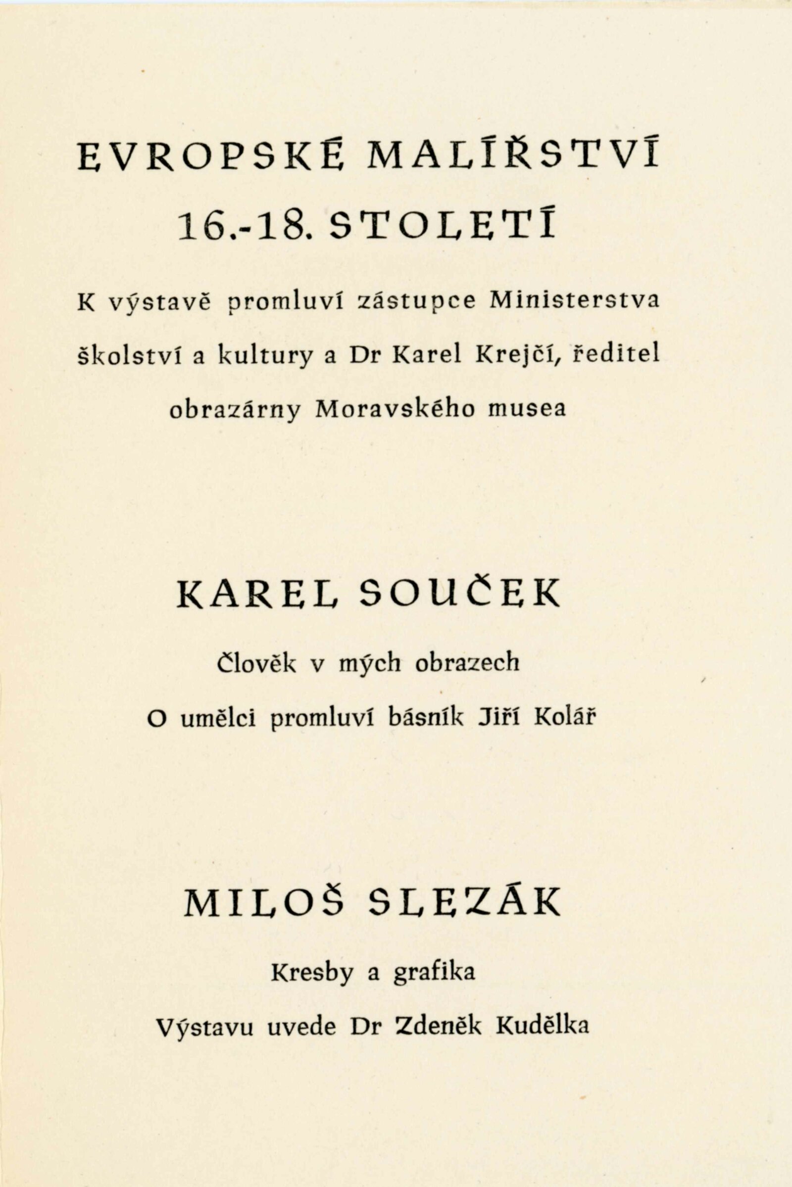 Miloš Slezák. Kresby a grafika: Dům umění, Malá galerie, 9. 9. – 20. 10. 1956 / Text: Zdeněk Kudělka. – Brno: DUmB, 1956. – skládačka, 6 s., obr., báseň Jana Skácela, DU 262