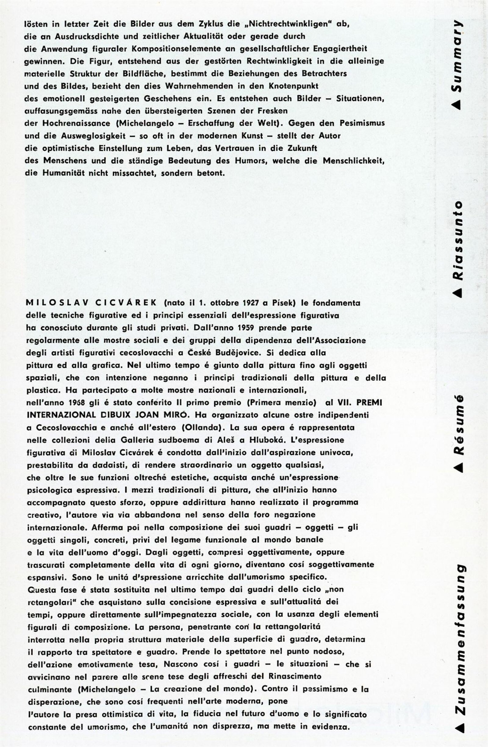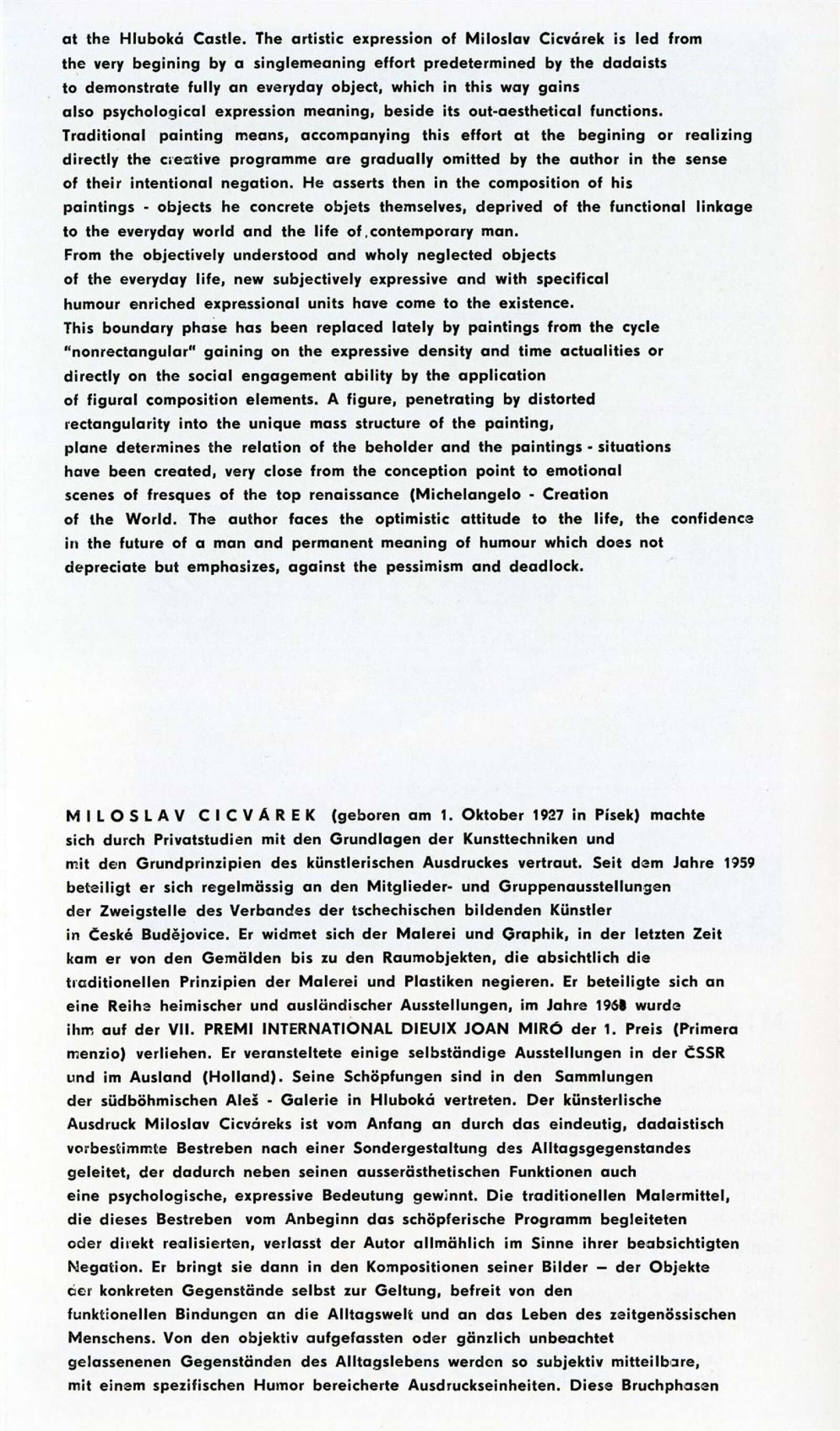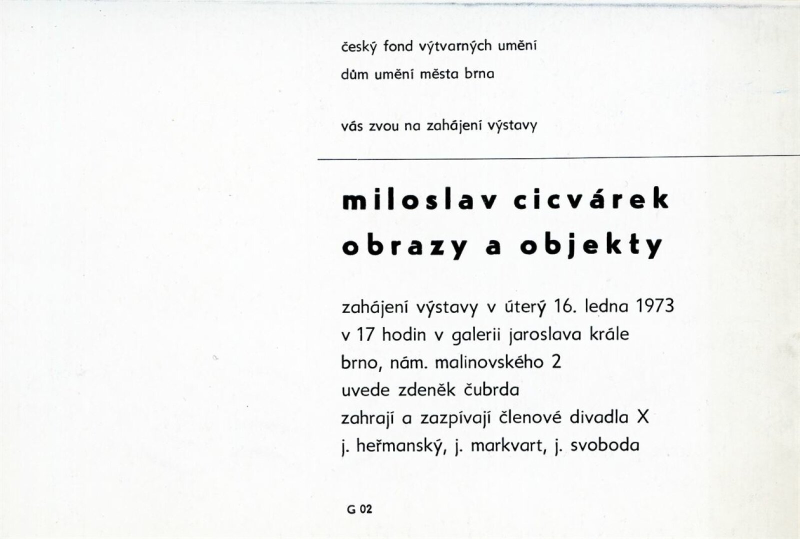 Miloslav Cicvarek. Obrazy a objekty: 51. výstava v Galerii Jaroslava Krále 16. 1. – 18. 2. 1973 / Text: Zdeněk Čubrda. – Brno: ČFVU, 1973. – 10 s., obr. Portrét, životní data, výstavy, ceny. – DU 585; MG