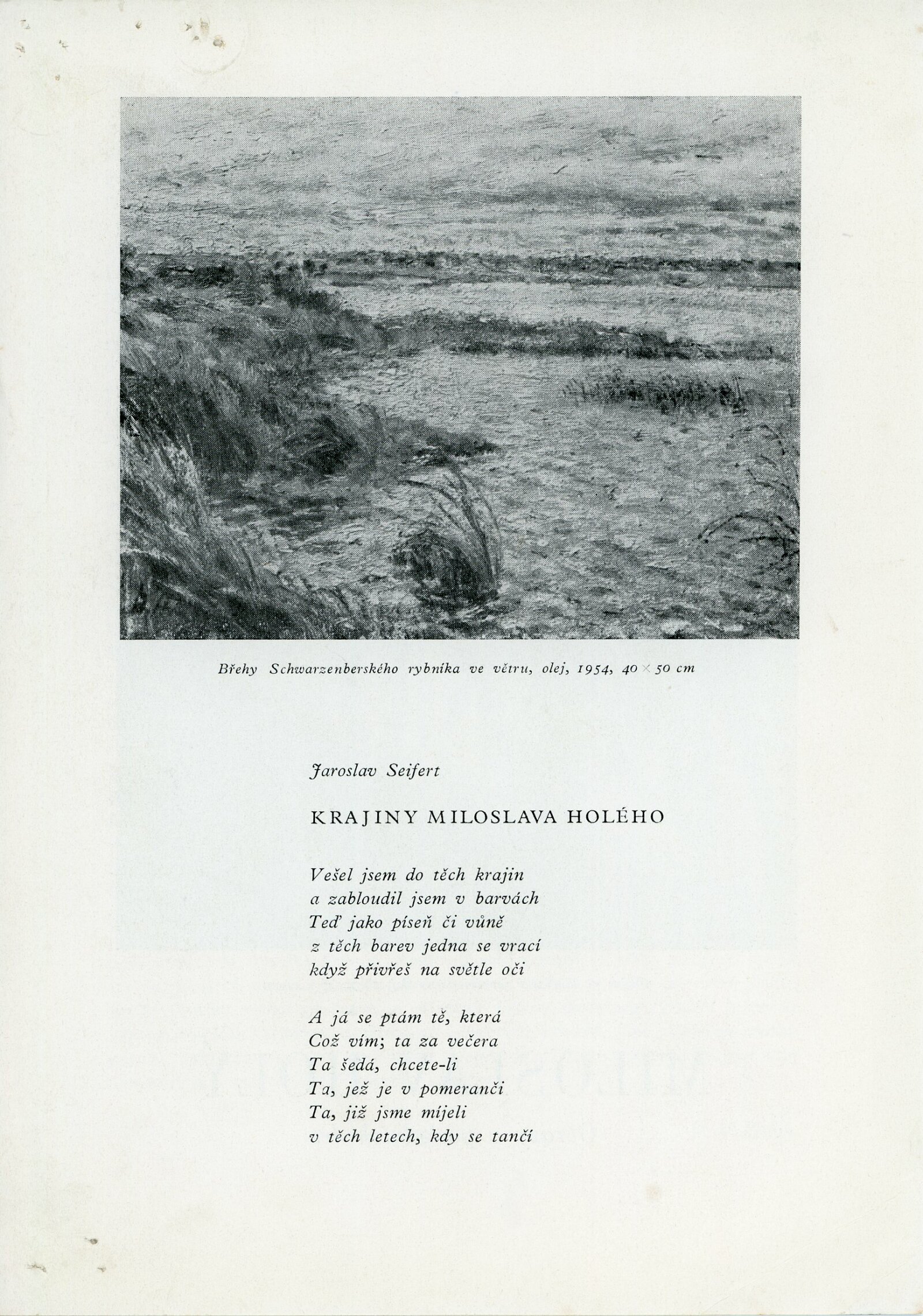 Miloslav Holý. Obrazy z posledních let: Dům umění města Brna, 27. 5. – 17. 6. 1956 / Text: V. V. Štech. – Brno: DUmB, 1956. – skládačka, 6 s., obr., báseň Jaroslava Seiferta, životopis, DU 255. – MG; MMB
