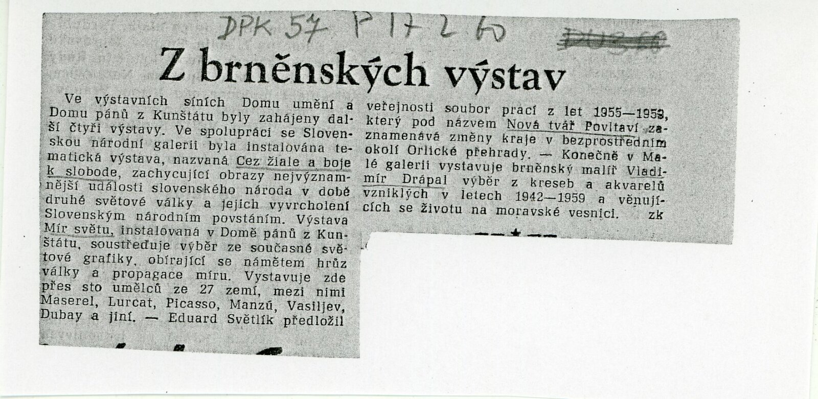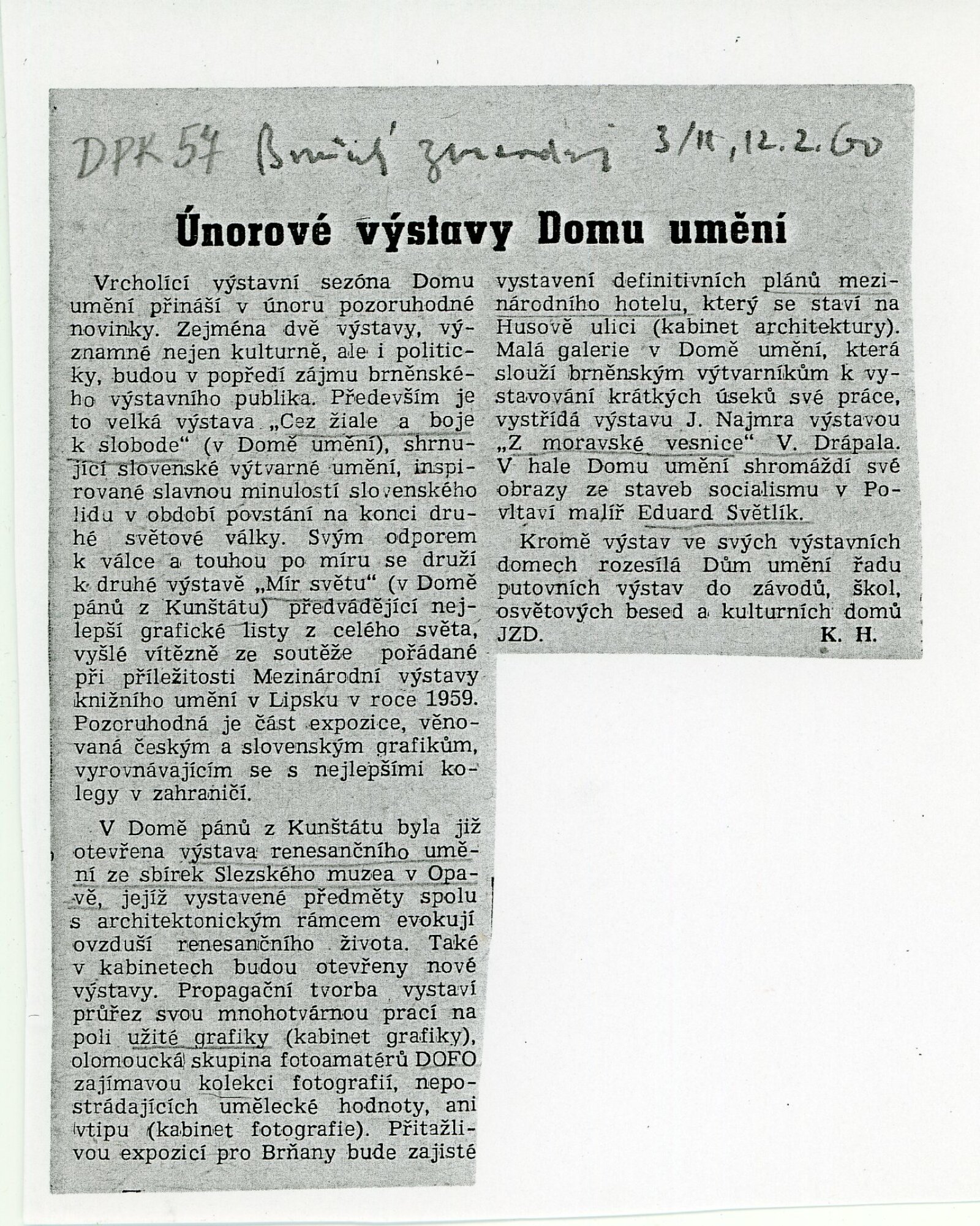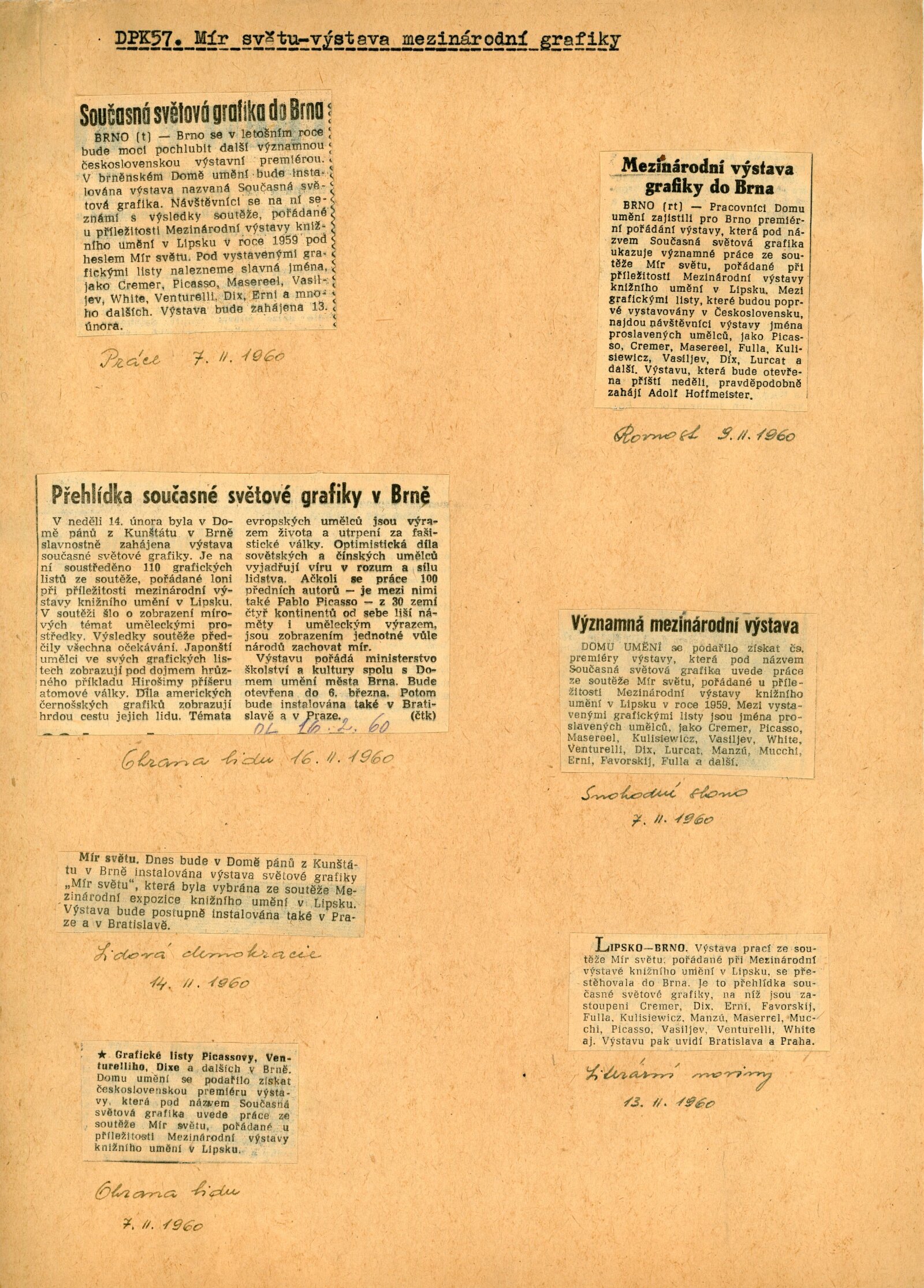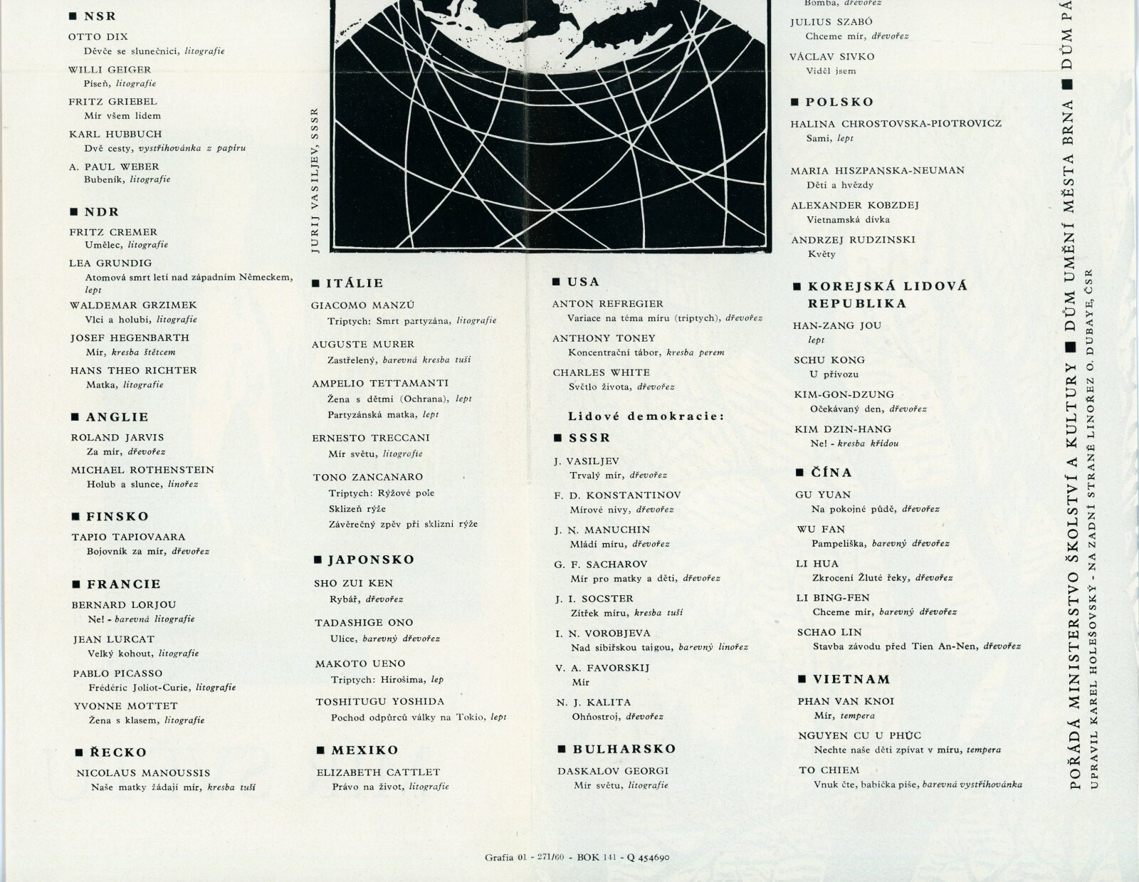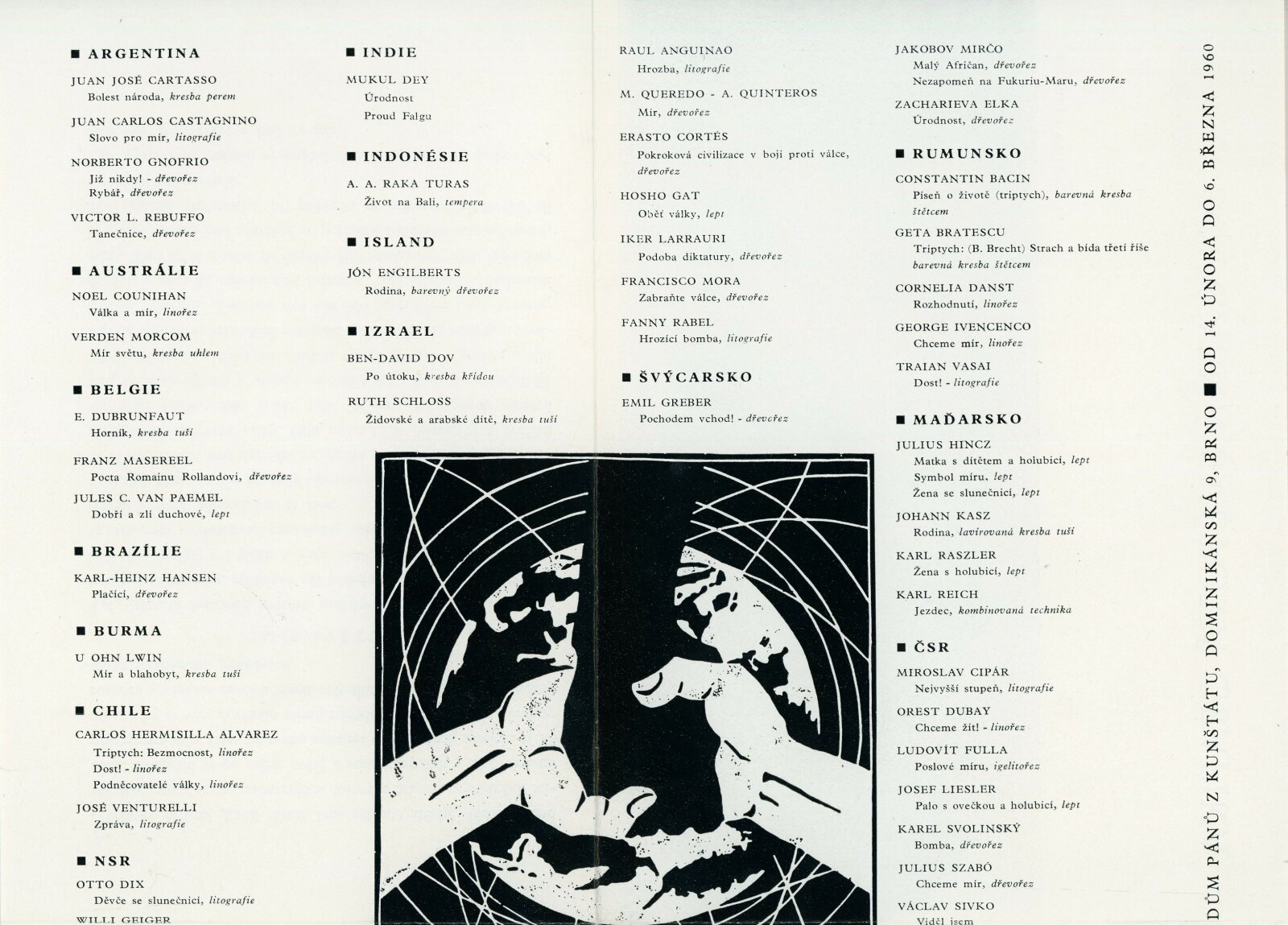 Mír světu. Současná světová grafika: Dům umění města Brna / Dům pánů z Kunštátu, 14. 2. – 6. 3. 1960 / Brno: DUmB, 1960. – složený list, obr., DPK 57. – MZK; MG; MMB