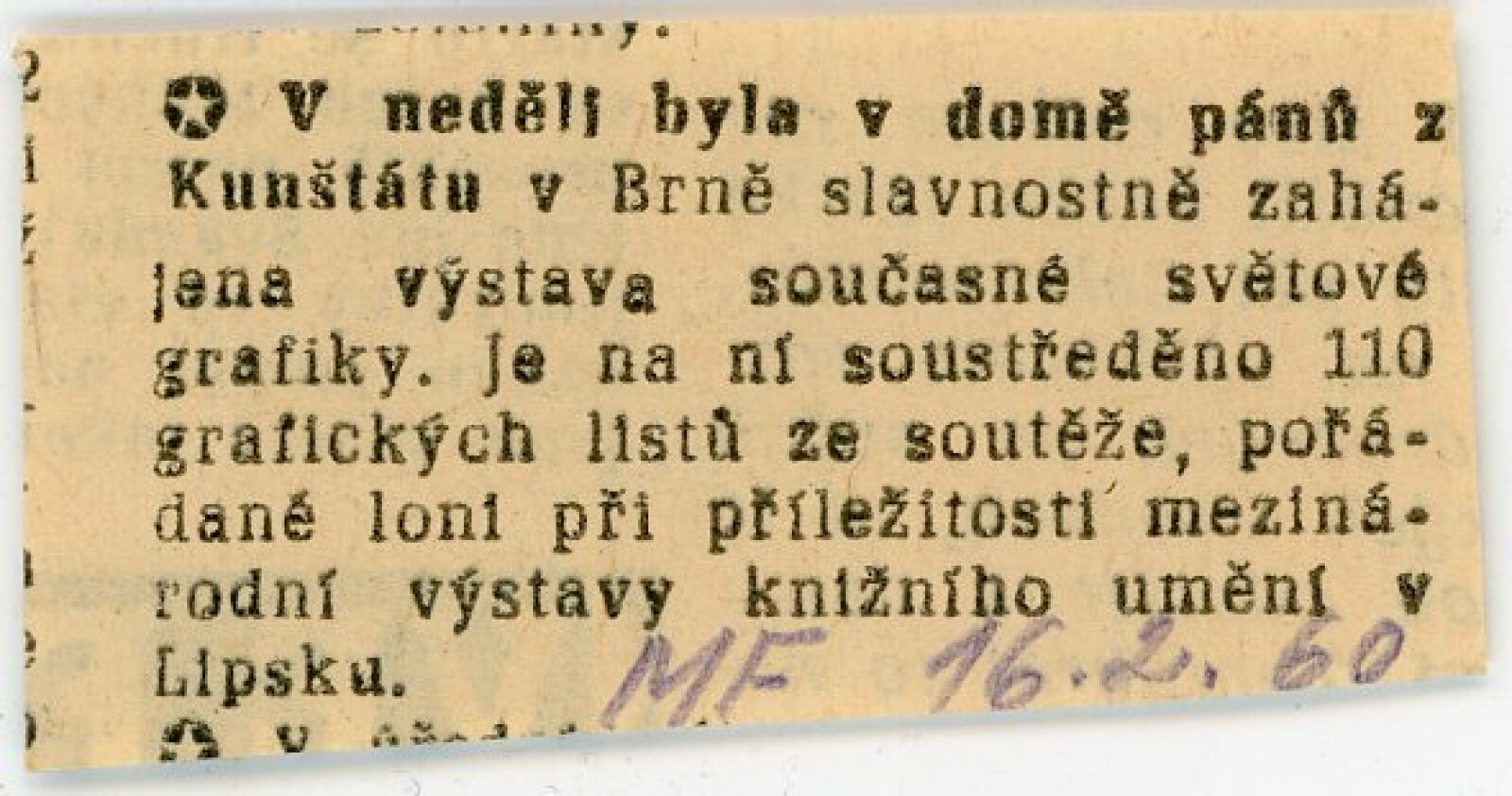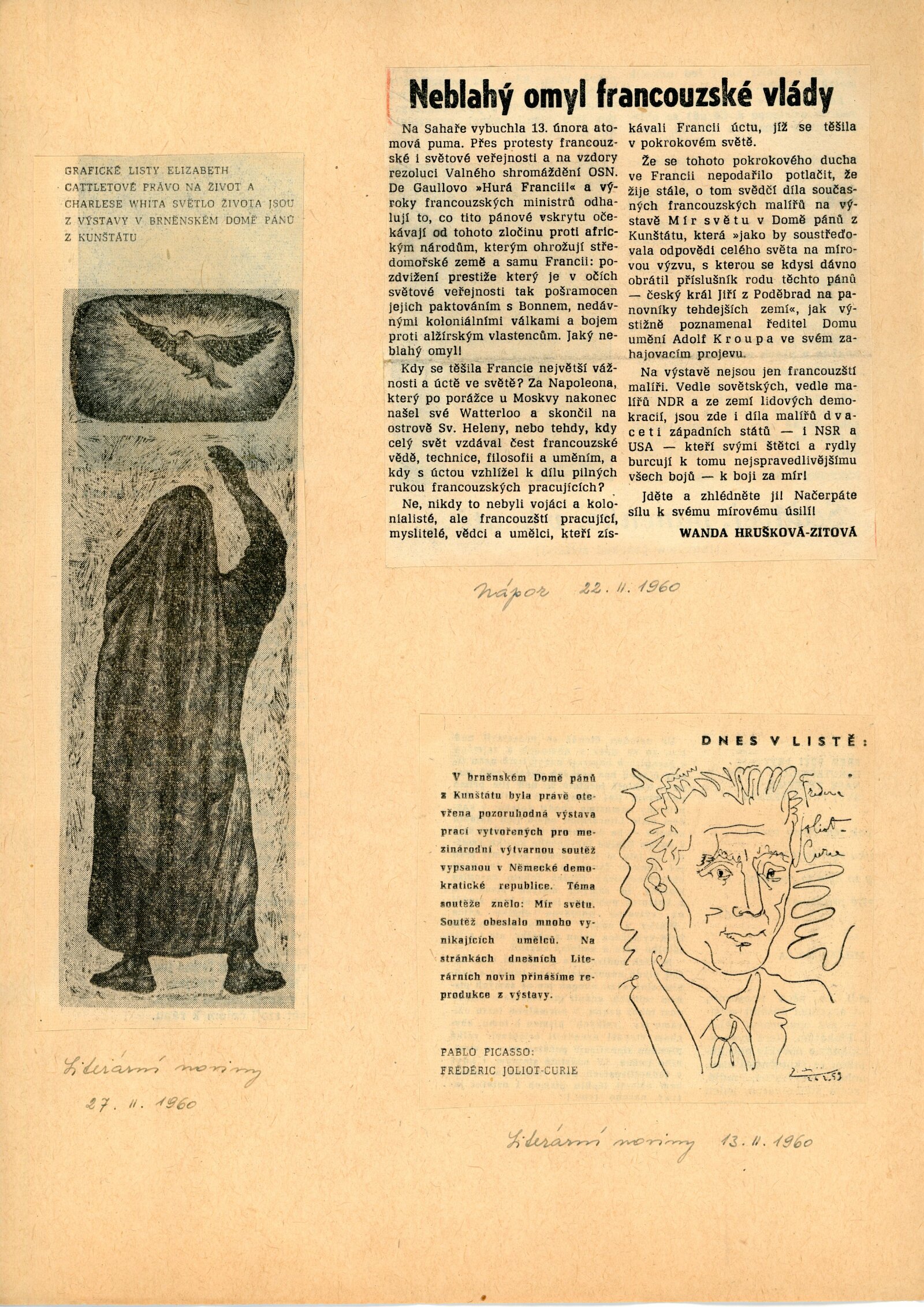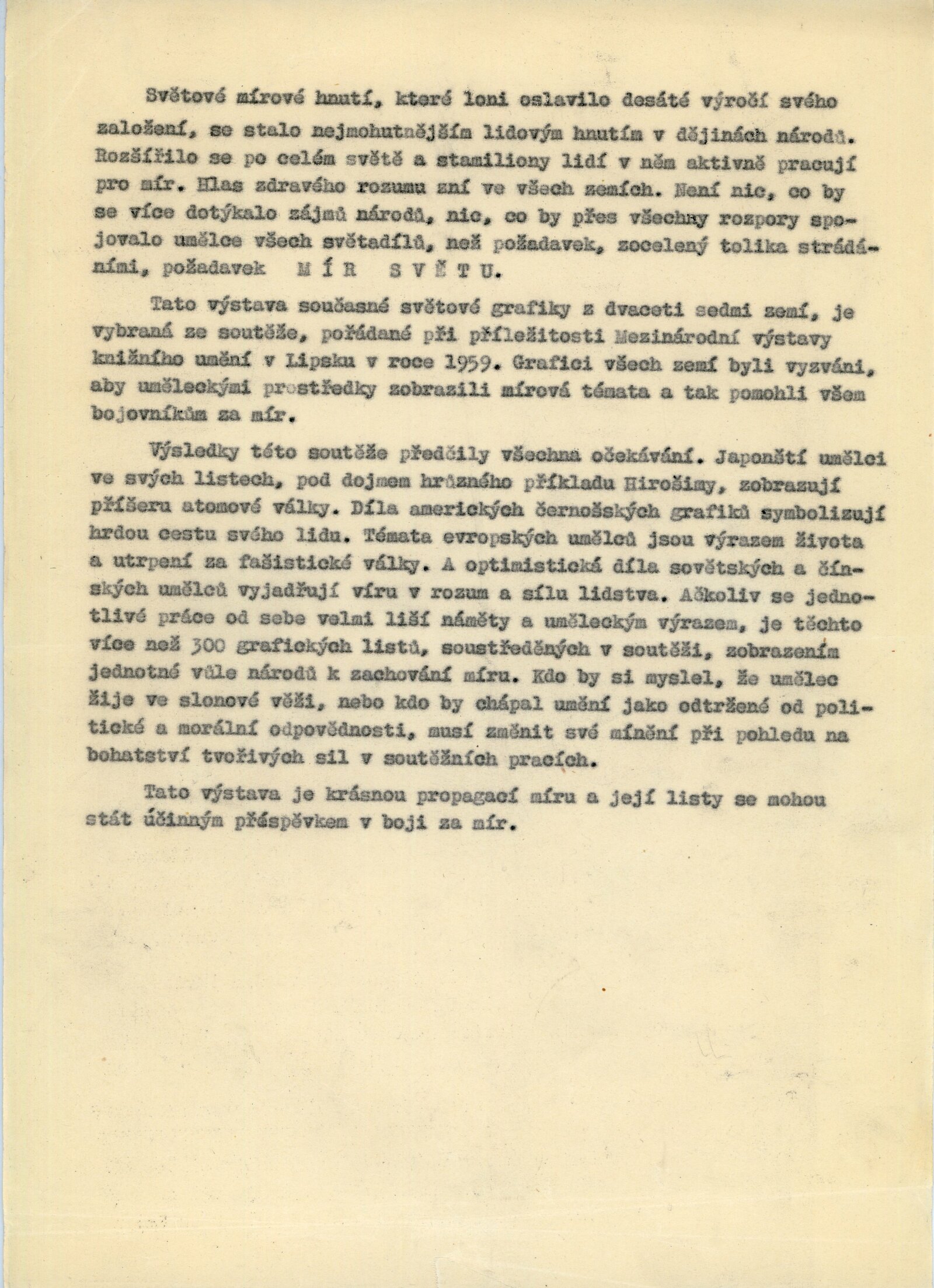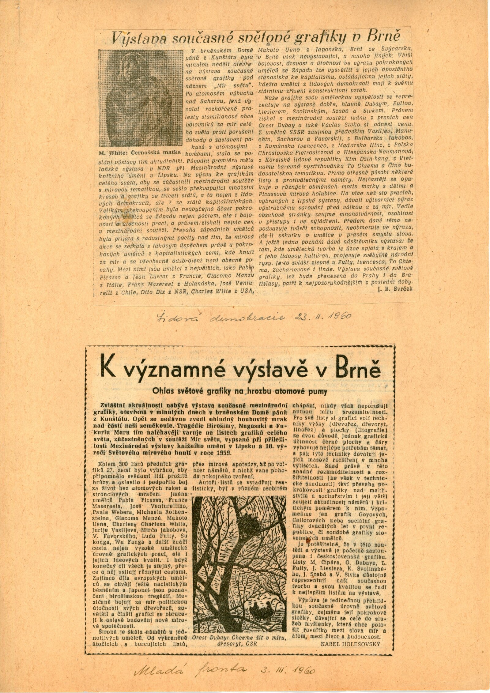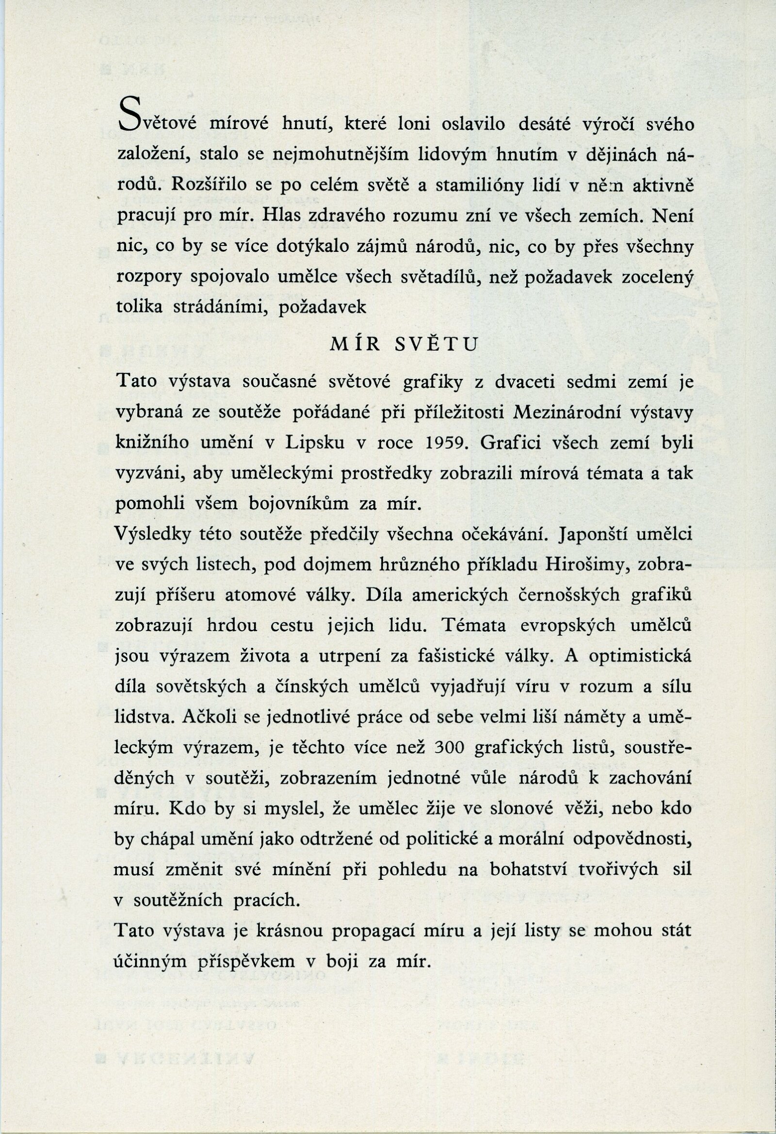 Mír světu. Současná světová grafika: Dům umění města Brna / Dům pánů z Kunštátu, 14. 2. – 6. 3. 1960 / Brno: DUmB, 1960. – složený list, obr., DPK 57. – MZK; MG; MMB