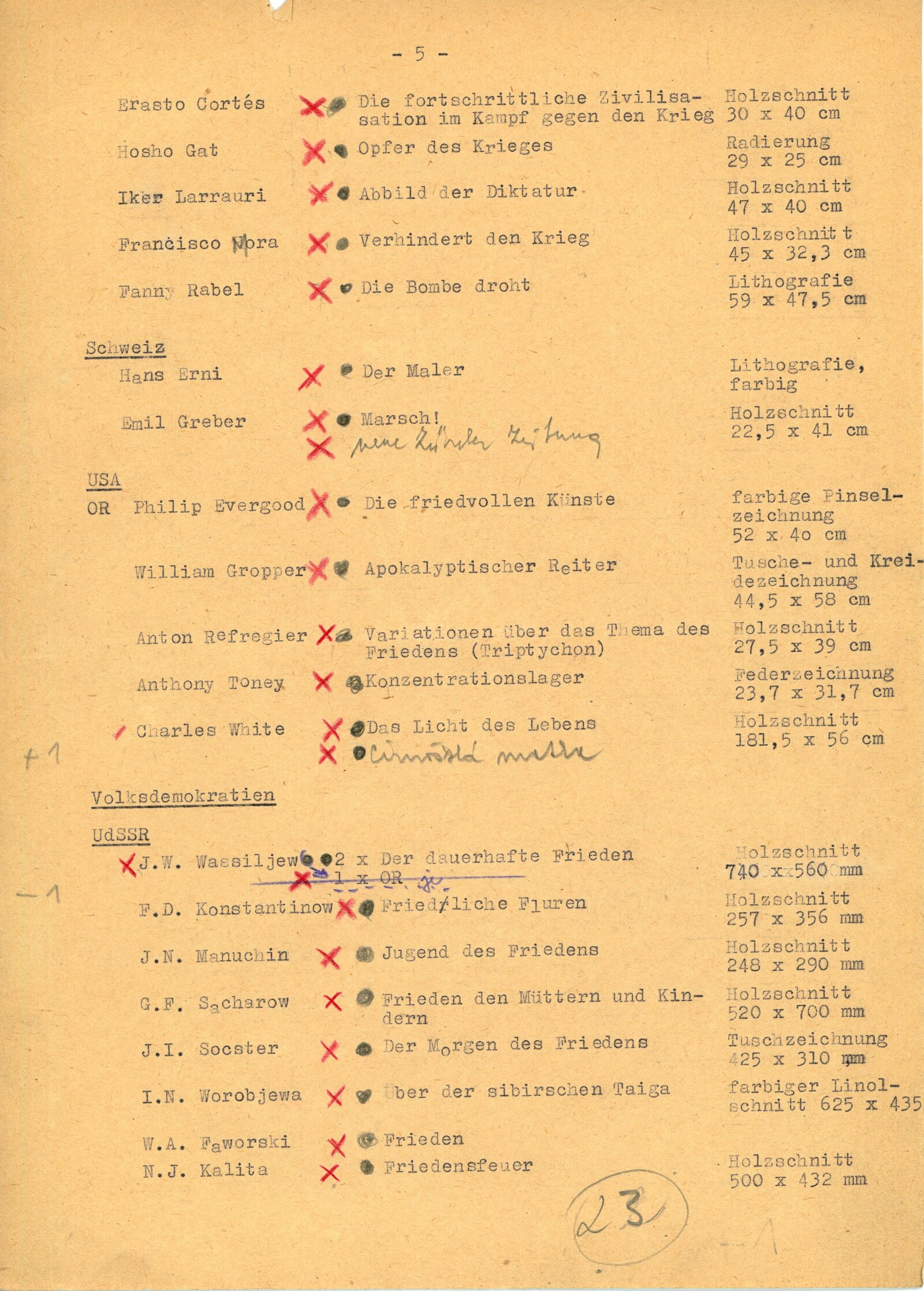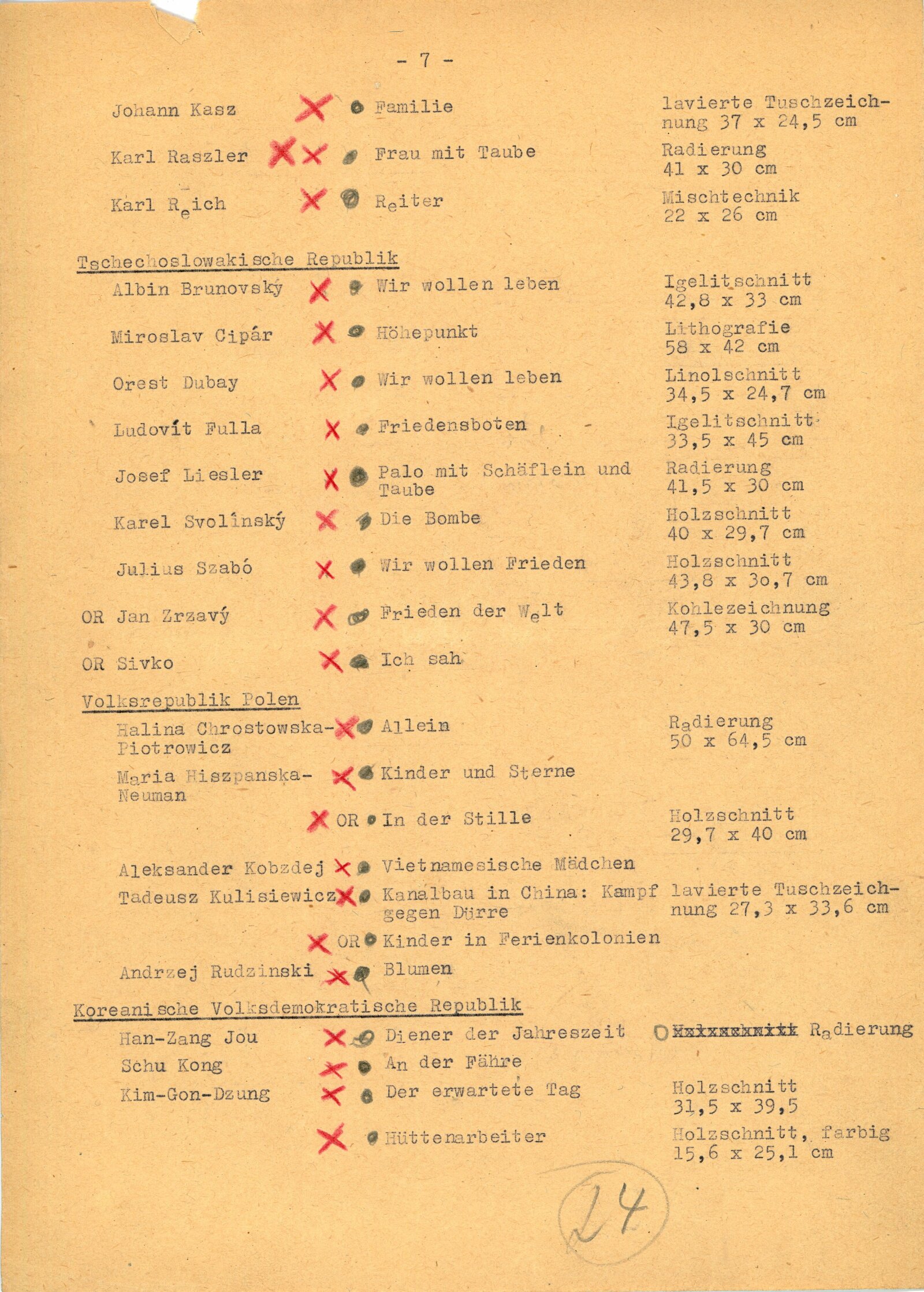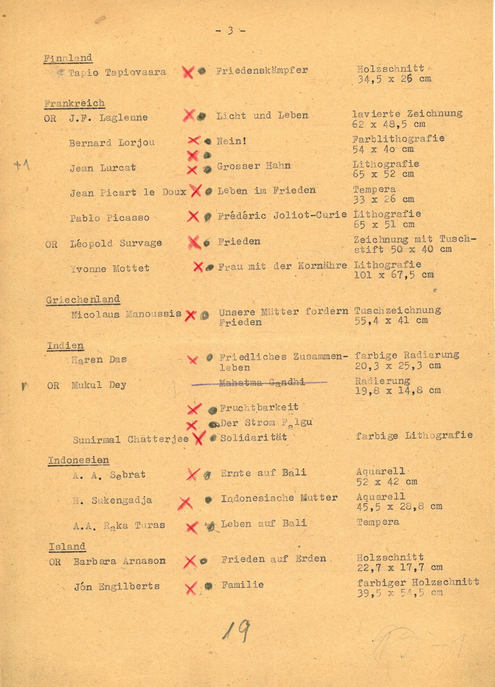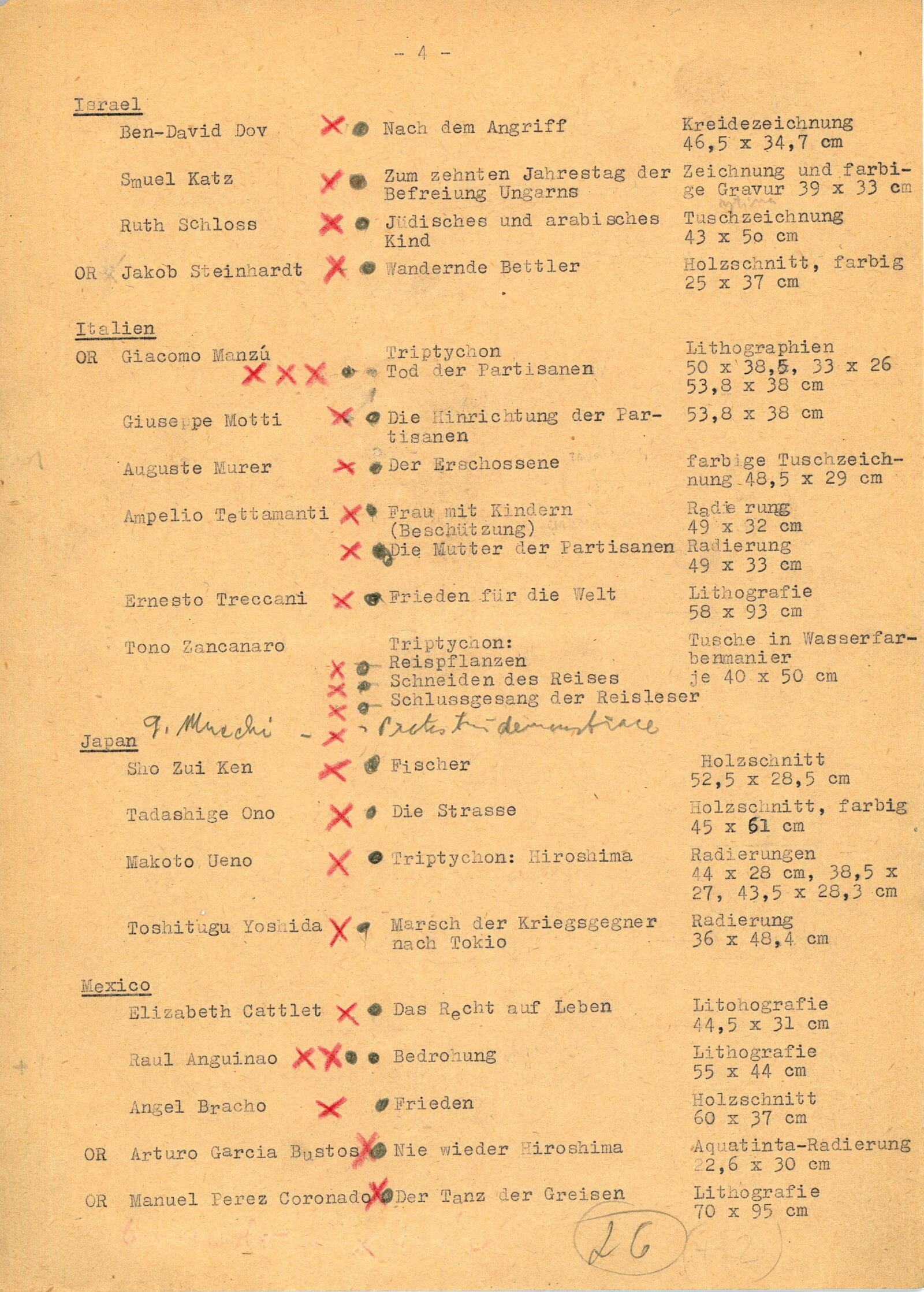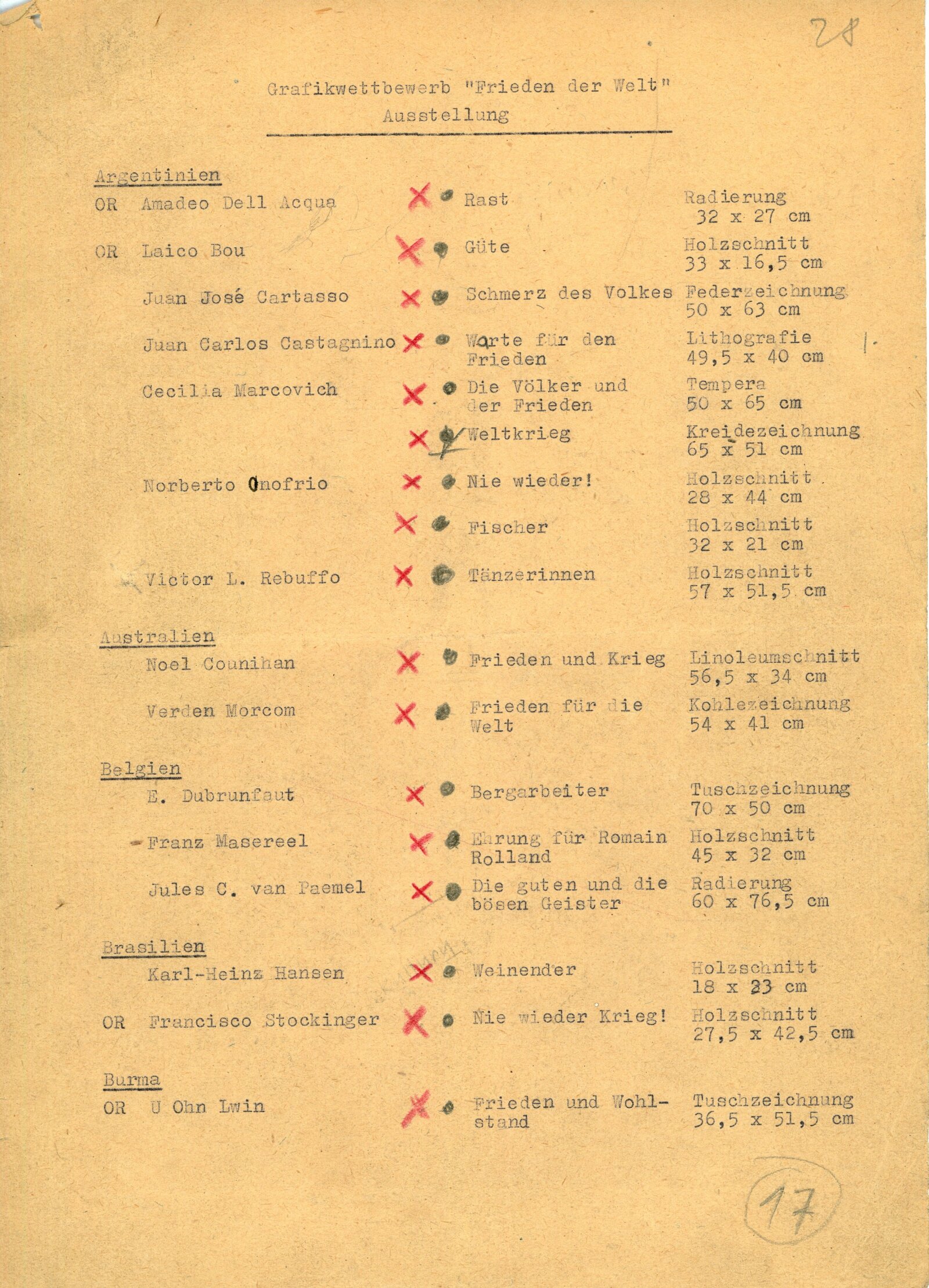 Juan José Cartasso, Juan Carlos Castagnino, Norberto Gnofrio, Victor L. Rebuffo, Noel Counihan, Verden Morcom, Edmond Dubrunfaut, Franz Masereel, Jules C. van Paemel, Karl-Heinz Hansen, U Ohn Lwin, Carlos Hermisilla Alvarez, José Venturelli, Otto Dix, Fritz Griebel, Karl Hubbuch, A. Paul Weber, Fritz Cremer, Lea Grundig, Waldemar Grzimek, Josef Hegenbarth, Hans Theo Richter, Roland Jarvis, Michael Rothenstein, Tapio Tapiovaara, Bernard Lorjou, Jean Lurcat, Pablo Picasso, Yvonne Mottet, Nicolaus Manousis, Mukul Dey, A. A. Raka Turas, Jón Engilberts, Ben-David Dov, Ruth Schloss, Giacomo Manzů, Auguste Murer, Ampelio Tettamanti, Ernesto Trecanni, Tono Zancanaro, Sho Zui Ken, Tadashige Ono, Makoto Ueno, Toshitugu Yoshida, Elizabeth Cattlet, Raul Anguinao, M. Queredo, A. Quinteros, Erasto Cortés, Hosho Gat, Iker Larrauri, Francisco Mora, Fanny Rabel, Emil Greber, Anton Refregier, Anthony Toney, Charles White, Jurij Vasiljev, F. D. Konstantinov, J. N. Manuchin, G. F. Sacharov, J. I. Socster, I. N. Vorobjeva, V. A. Favorskij, N. J. Kalita, Daskalov Georgi, Jakobov Mirčo, Zacharieva Elka, Constantin Bacin, Geta Bratescu, Cornelia Danst, George Ivencenco, Traian Vasai, Julius Hincz, Johann Kasz, Karl Raszler, Karl Reich, Miroslav Cipár, Orest Dubay, Ludovít Fulla, Josef Liesler, Karel Svolinský, Julisu Szabó, Václav Sivko, Halina Chrostovska-Piotrovicz, Maria Hiszpanska-Neuman, Alexander Kobzdej, Andrzej Rudzinski, Han-Zang Jou, Schu Kong, Kim-Gon-Dzung, Kim Dzin-Hang, Gu Yuan, Wu Fan, Lu Hua, Li Bing-Fen, Schao Lin, Phan Van Knoi, Nguyen Cu U Phúc, To Chiem
