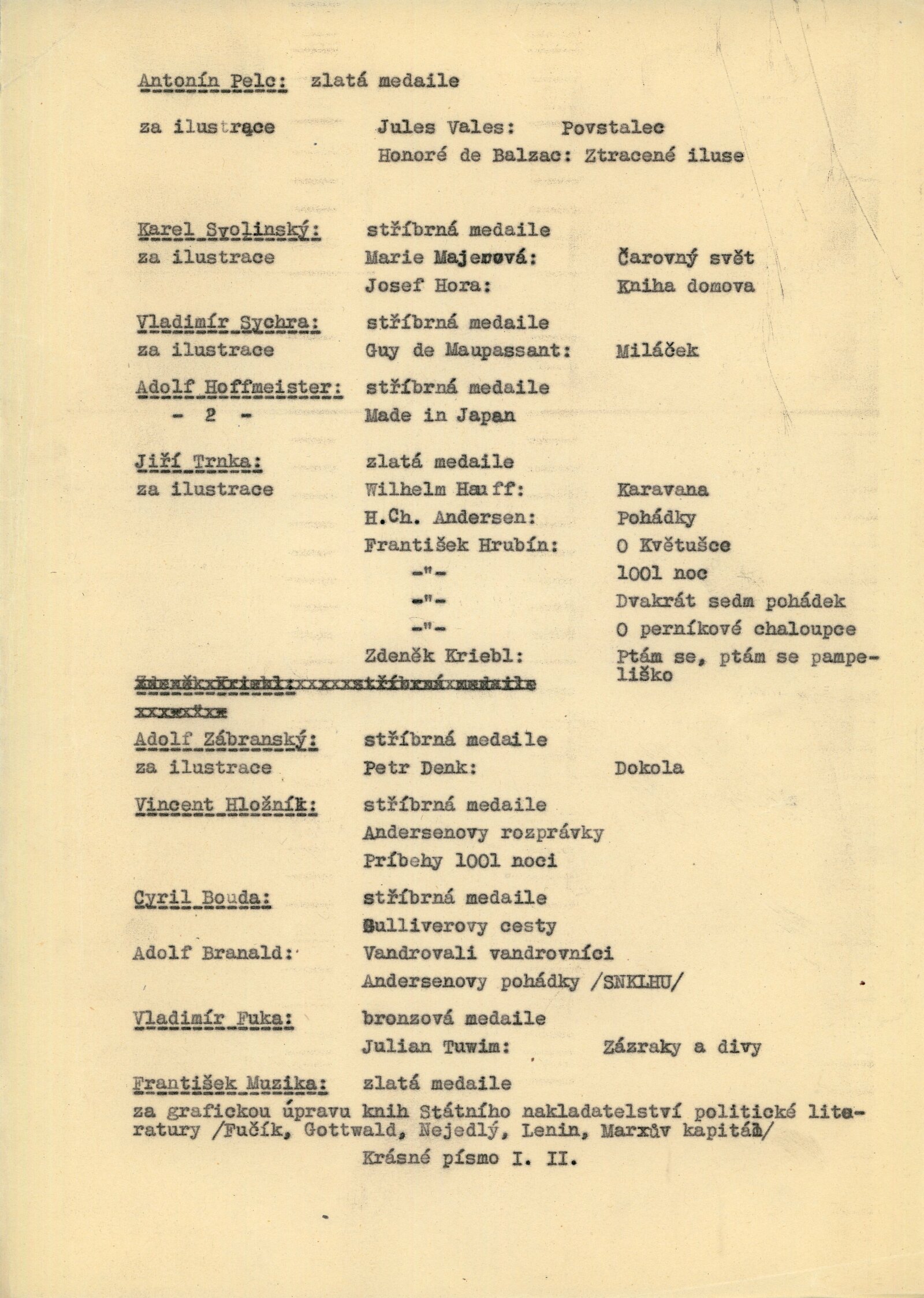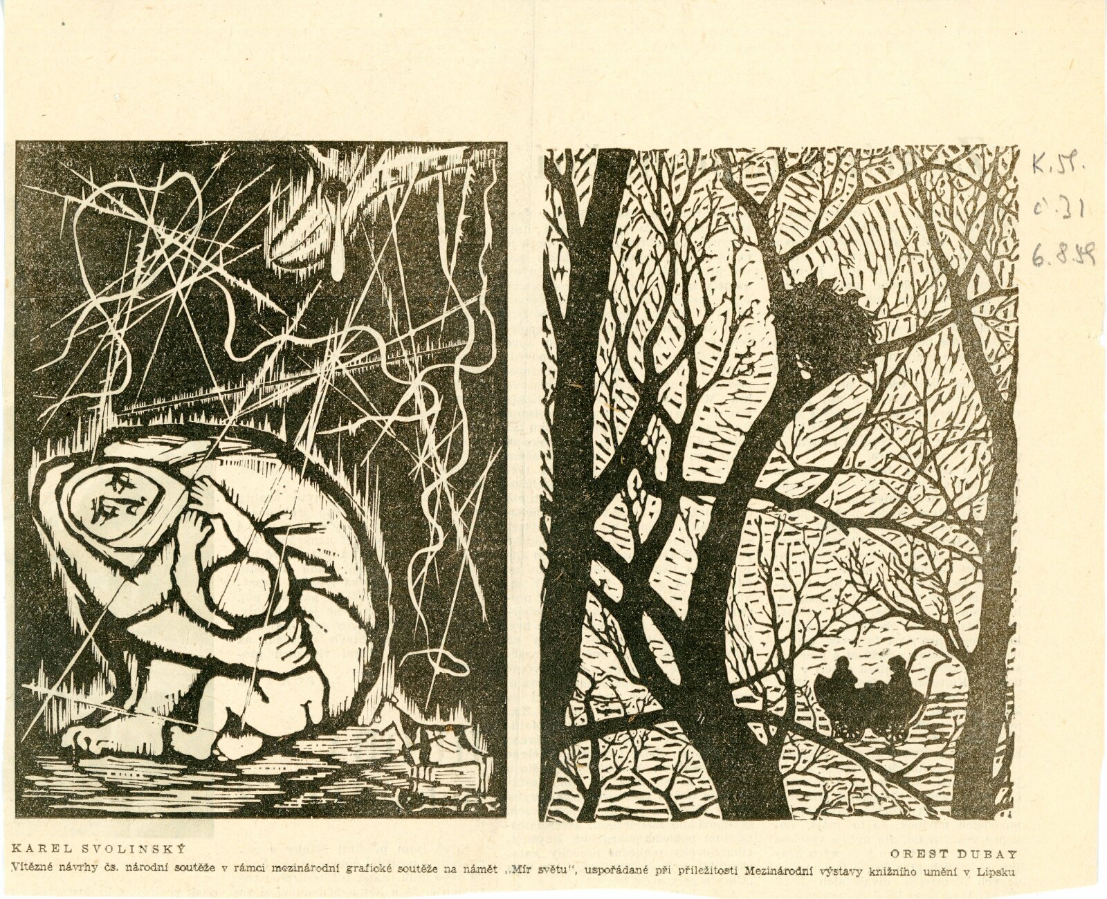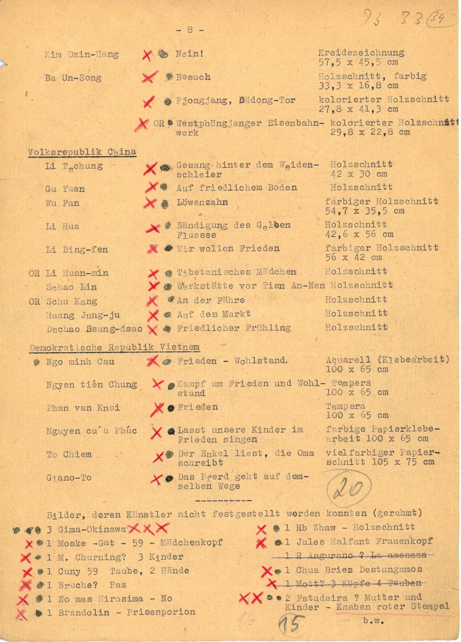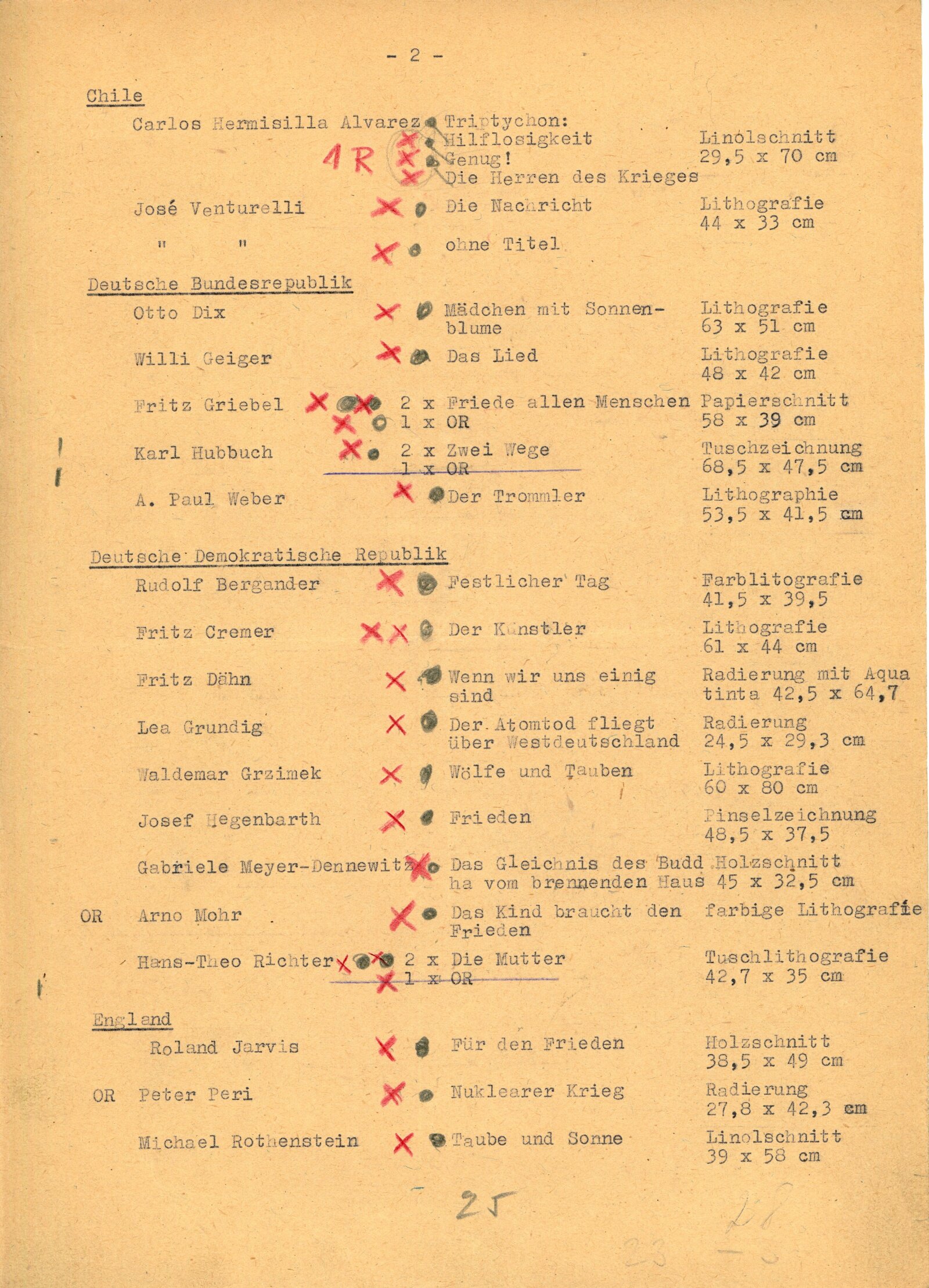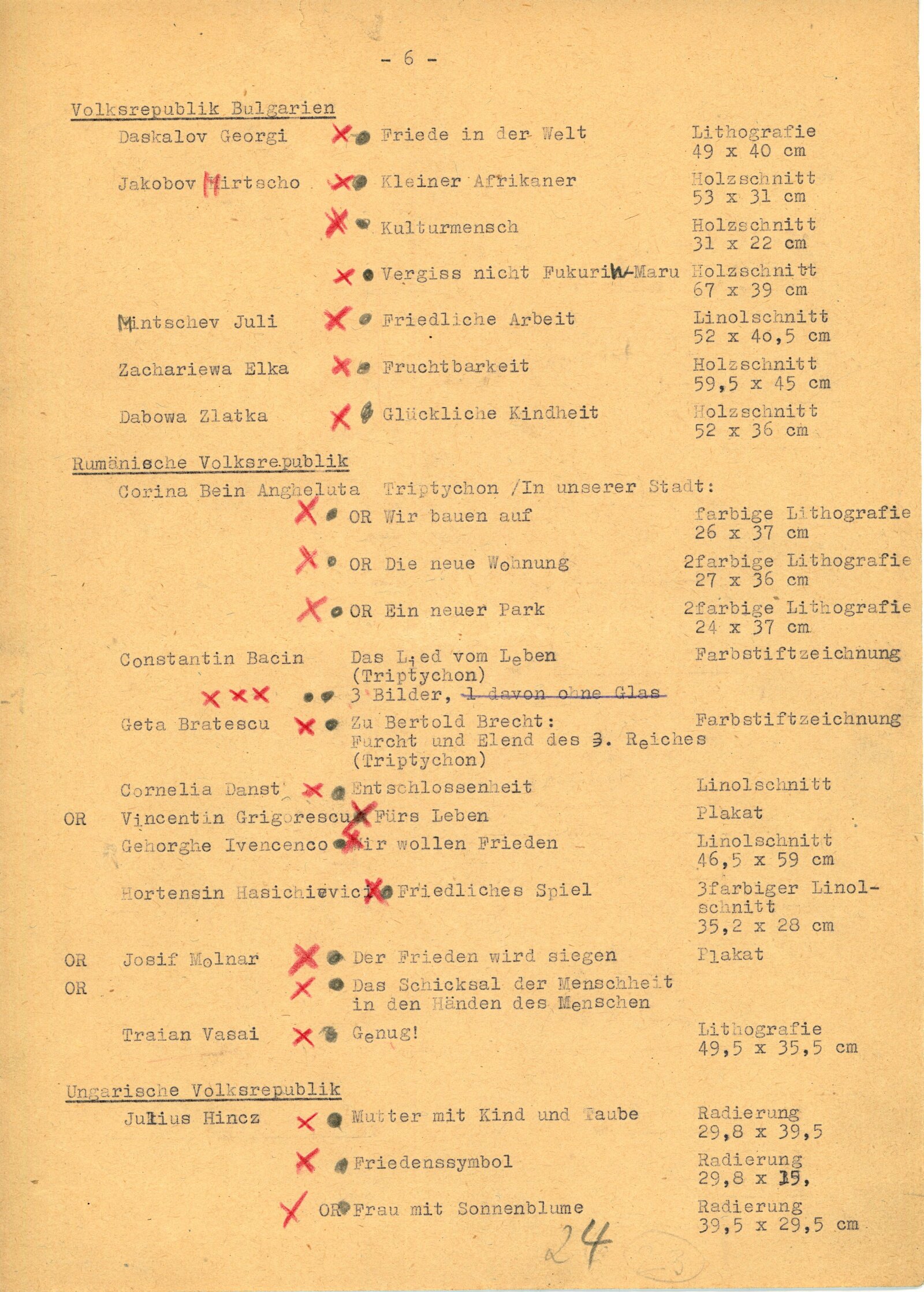 Juan José Cartasso, Juan Carlos Castagnino, Norberto Gnofrio, Victor L. Rebuffo, Noel Counihan, Verden Morcom, Edmond Dubrunfaut, Franz Masereel, Jules C. van Paemel, Karl-Heinz Hansen, U Ohn Lwin, Carlos Hermisilla Alvarez, José Venturelli, Otto Dix, Fritz Griebel, Karl Hubbuch, A. Paul Weber, Fritz Cremer, Lea Grundig, Waldemar Grzimek, Josef Hegenbarth, Hans Theo Richter, Roland Jarvis, Michael Rothenstein, Tapio Tapiovaara, Bernard Lorjou, Jean Lurcat, Pablo Picasso, Yvonne Mottet, Nicolaus Manousis, Mukul Dey, A. A. Raka Turas, Jón Engilberts, Ben-David Dov, Ruth Schloss, Giacomo Manzů, Auguste Murer, Ampelio Tettamanti, Ernesto Trecanni, Tono Zancanaro, Sho Zui Ken, Tadashige Ono, Makoto Ueno, Toshitugu Yoshida, Elizabeth Cattlet, Raul Anguinao, M. Queredo, A. Quinteros, Erasto Cortés, Hosho Gat, Iker Larrauri, Francisco Mora, Fanny Rabel, Emil Greber, Anton Refregier, Anthony Toney, Charles White, Jurij Vasiljev, F. D. Konstantinov, J. N. Manuchin, G. F. Sacharov, J. I. Socster, I. N. Vorobjeva, V. A. Favorskij, N. J. Kalita, Daskalov Georgi, Jakobov Mirčo, Zacharieva Elka, Constantin Bacin, Geta Bratescu, Cornelia Danst, George Ivencenco, Traian Vasai, Julius Hincz, Johann Kasz, Karl Raszler, Karl Reich, Miroslav Cipár, Orest Dubay, Ludovít Fulla, Josef Liesler, Karel Svolinský, Julisu Szabó, Václav Sivko, Halina Chrostovska-Piotrovicz, Maria Hiszpanska-Neuman, Alexander Kobzdej, Andrzej Rudzinski, Han-Zang Jou, Schu Kong, Kim-Gon-Dzung, Kim Dzin-Hang, Gu Yuan, Wu Fan, Lu Hua, Li Bing-Fen, Schao Lin, Phan Van Knoi, Nguyen Cu U Phúc, To Chiem