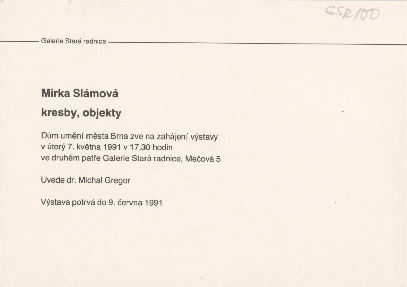 Mirka Slámová: Galerie Stará radnice, Kabinet grafiky, 7. 5. – 9. 6. 1991 / Text: Michal Gregor. – Brno: DUmB, 1911. – skládačka (6 s., obr.), životní data, výstavy, GSR 100. – MZK; MG