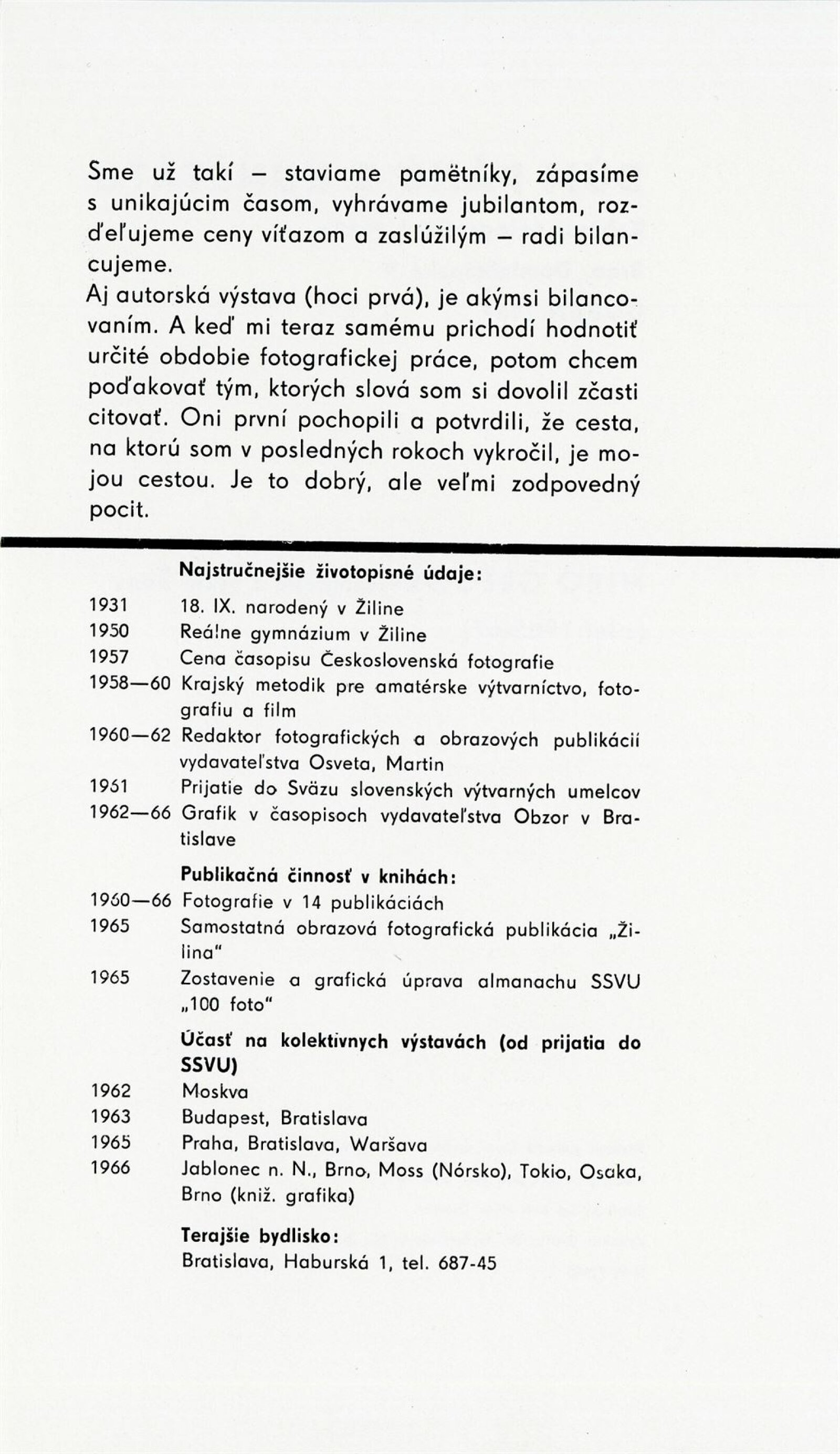 pozvánka, katalog, fotografie výstavy, korespondence (provozní korespodence, žádost o výstavu – Anna Marcinková, Miro Gregor, odpovědi autora na nabídku účasti na výstavě Surrelismus a fotografie), smlouva, recenze v tisku