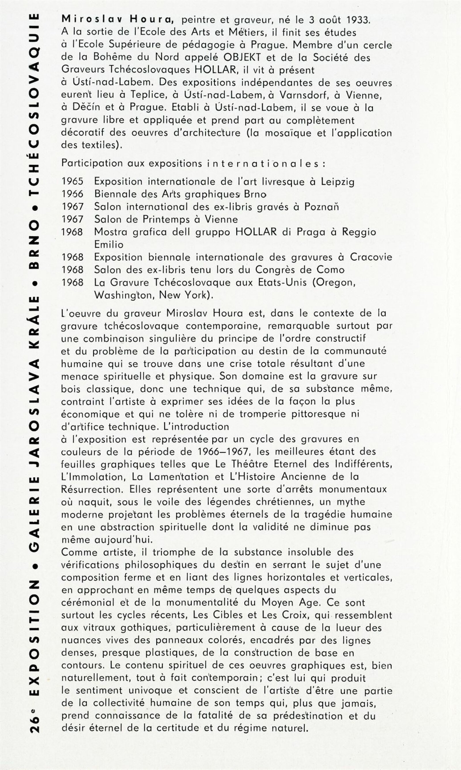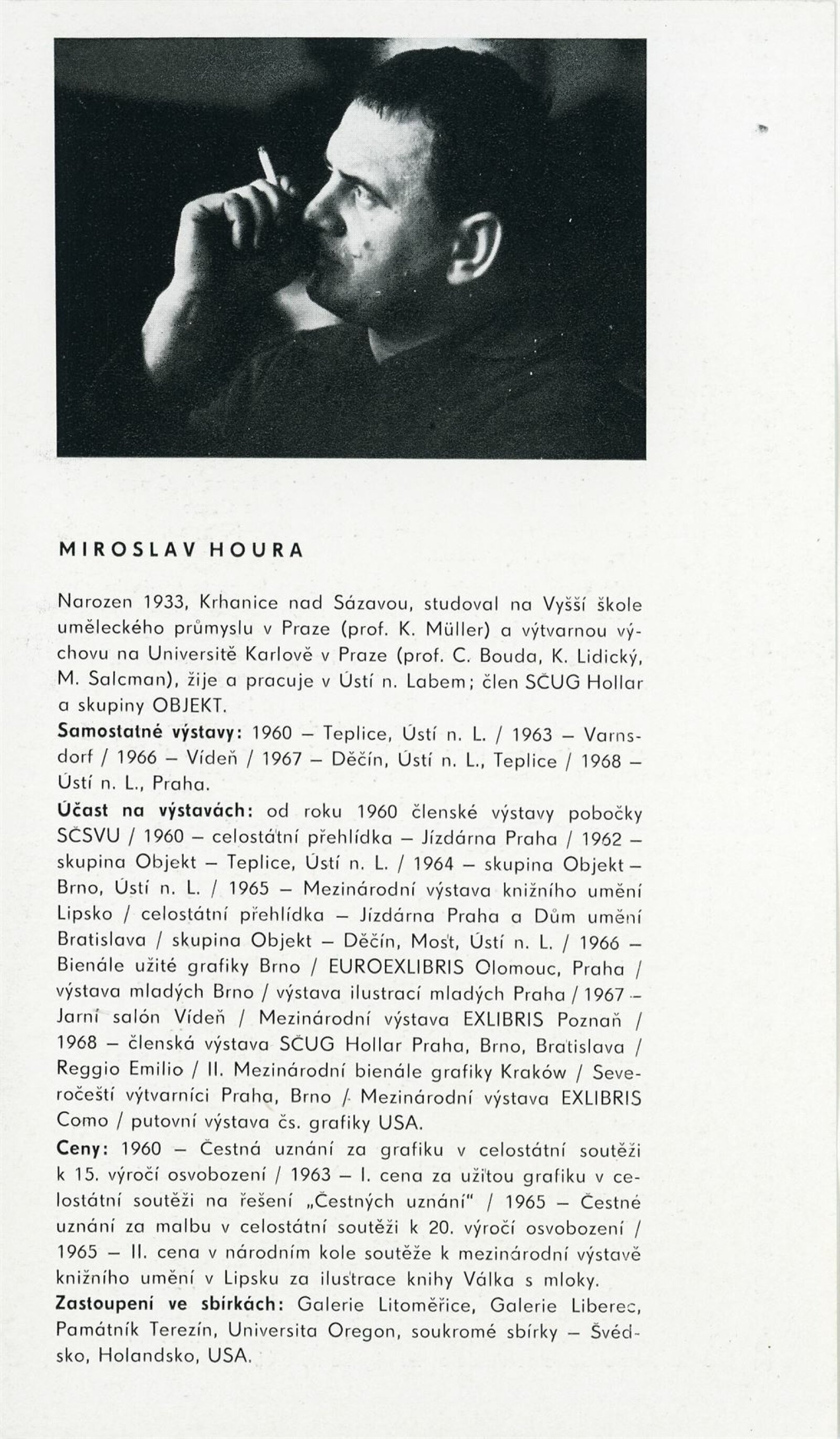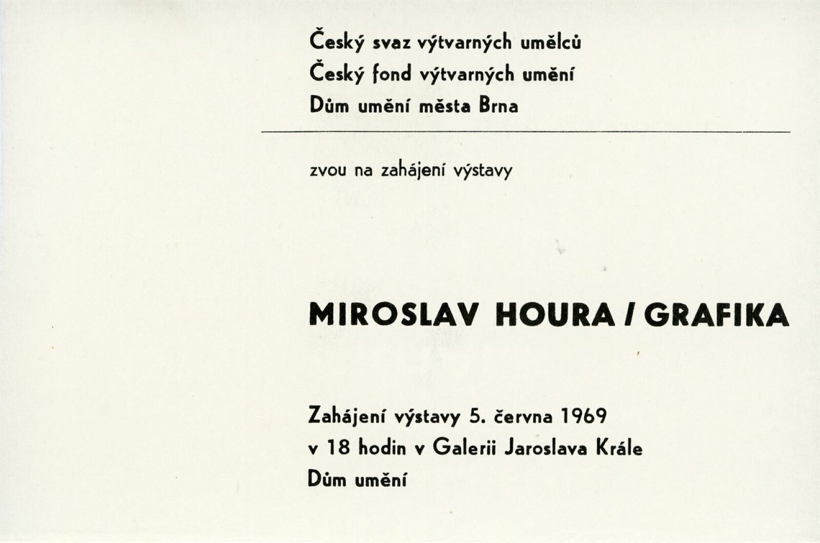 Miroslav Houra. Grafika: Dům umění, 26. výstava v Galerii Jaroslava Krále, 5. 6. – 6. 7. 1969 / Text: Jan Škvára. – Brno: ČFVU, 1969. – 10 s., obr., portrét, životní data, výstavy, ceny, zastoupení ve sbírkách, DU 525. – MZK; MG; MMB