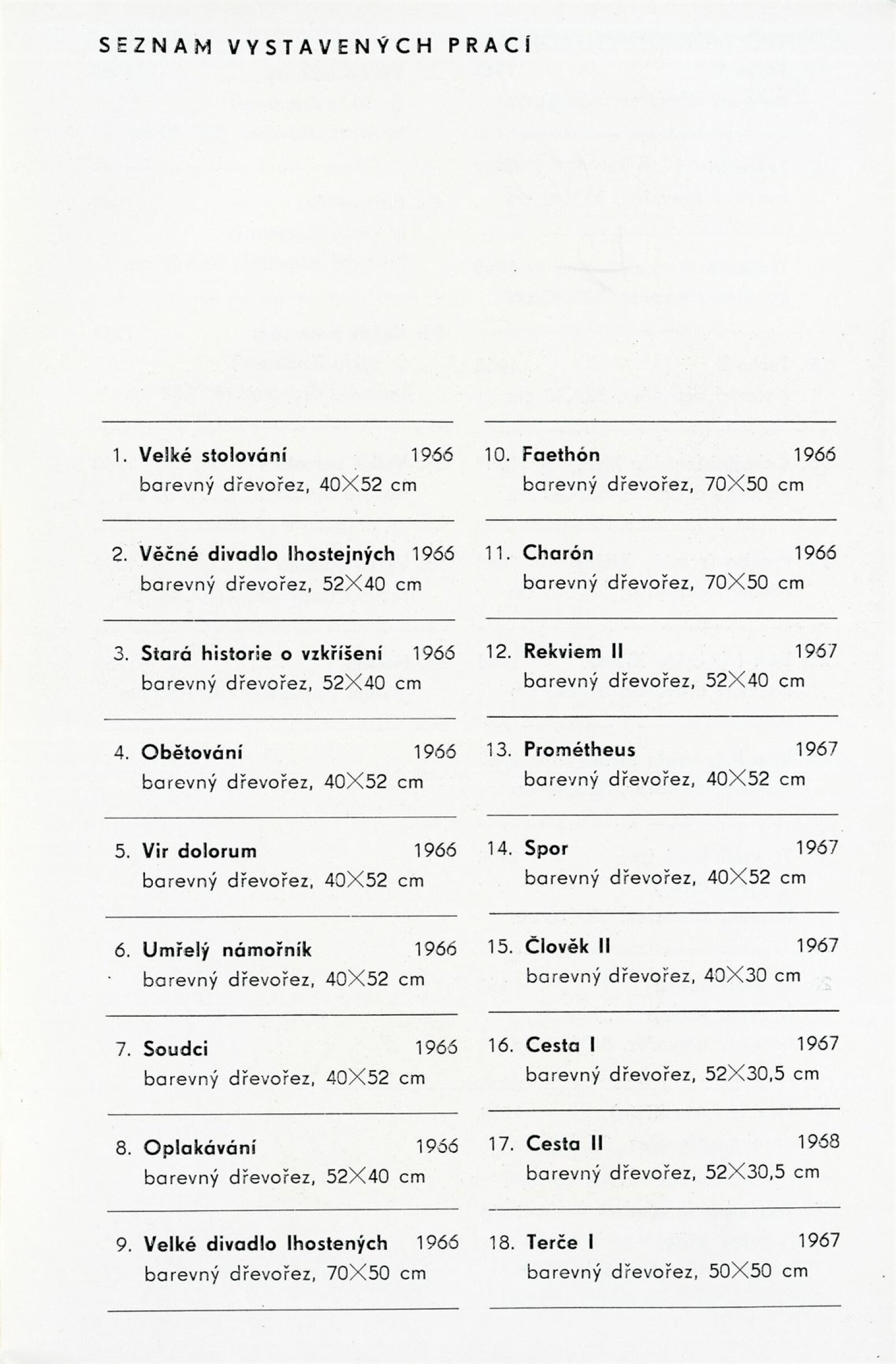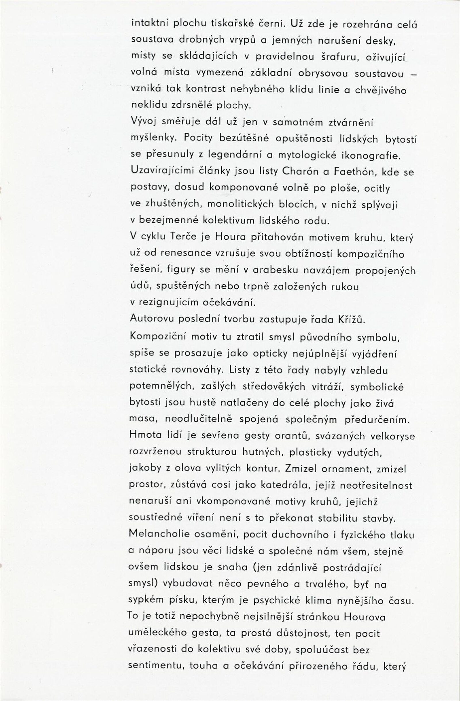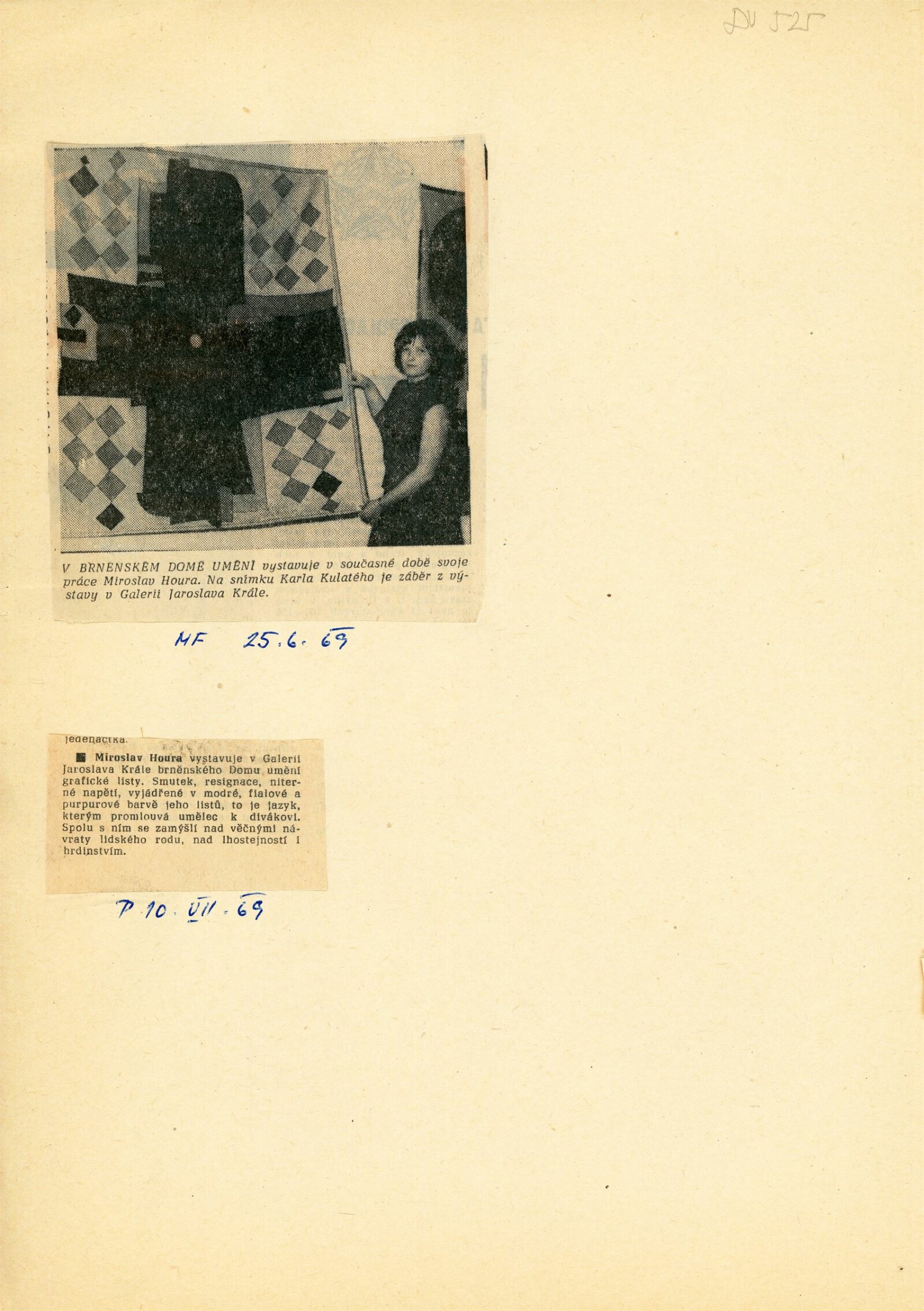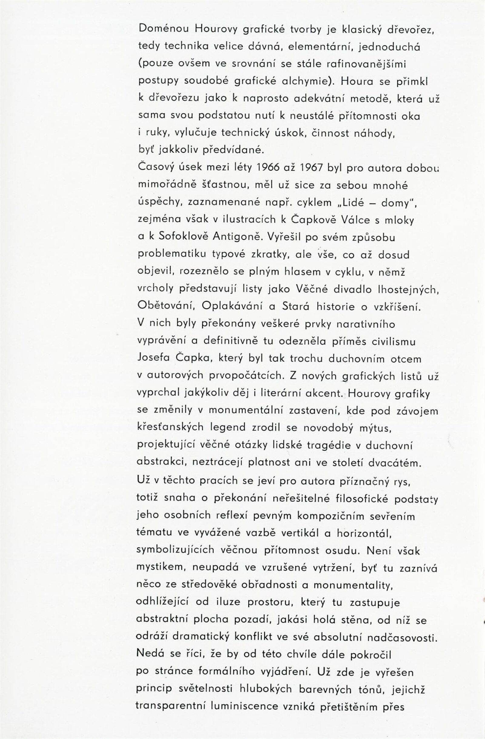 Miroslav Houra. Grafika: Dům umění, 26. výstava v Galerii Jaroslava Krále, 5. 6. – 6. 7. 1969 / Text: Jan Škvára. – Brno: ČFVU, 1969. – 10 s., obr., portrét, životní data, výstavy, ceny, zastoupení ve sbírkách, DU 525. – MZK; MG; MMB