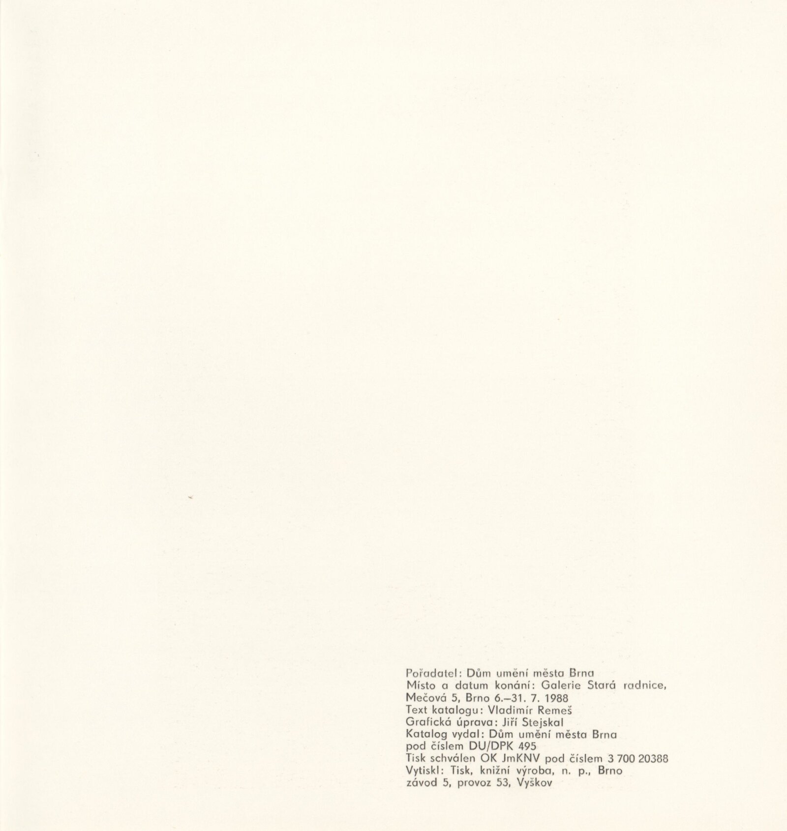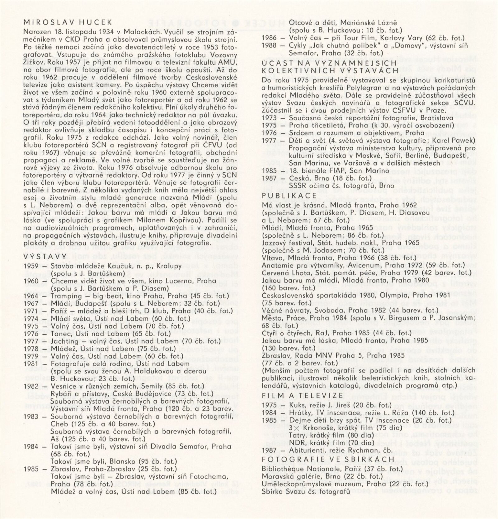 pozvánka, katalog, zpráva do médií, úvodní proslov na vernisáži, strojopis, fotografie pro katalog aj., z vernisáže, korespondence (1988), pozvání výbor MPVU na besedu s fotografem, žádost a potvrzení o konání výstavy, recenze v tisku, katalog z výstavy Miroslava Hucka v GVU v Chebu (1983), katalog z výstavy M. Hucka ve VS Semafor v Praze (1984), VS Fotochema v Praze (1985), poznámky