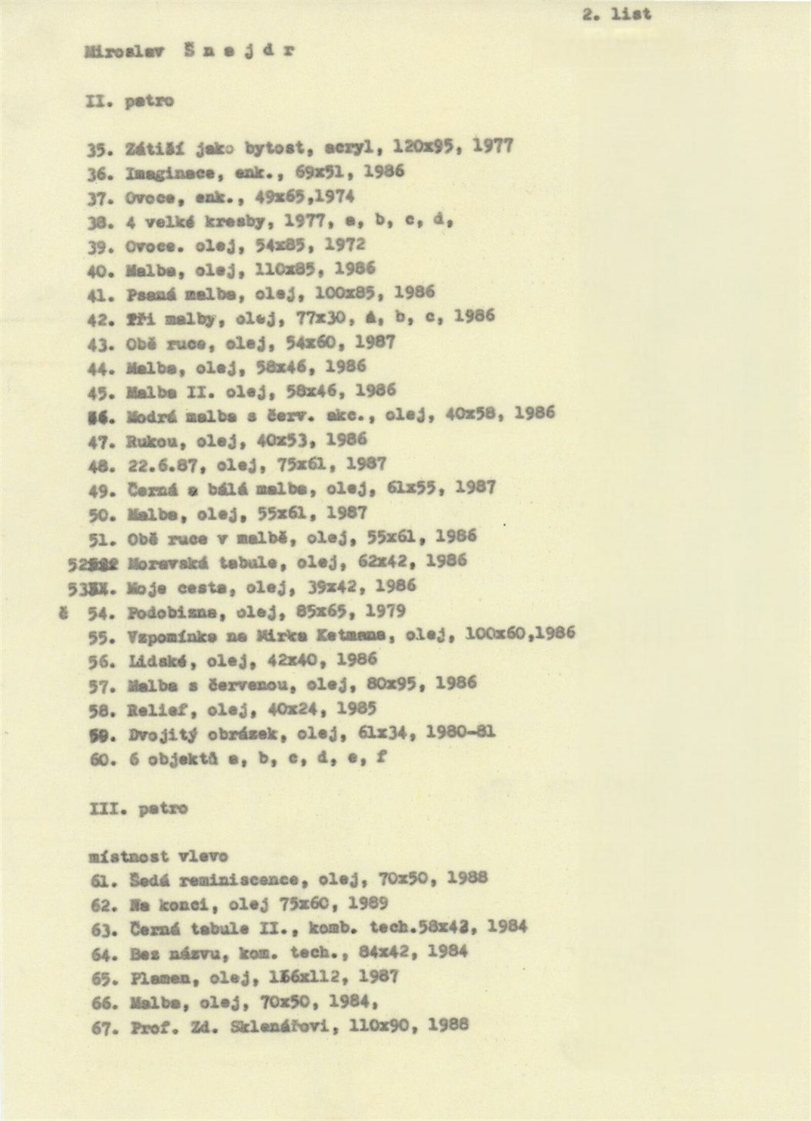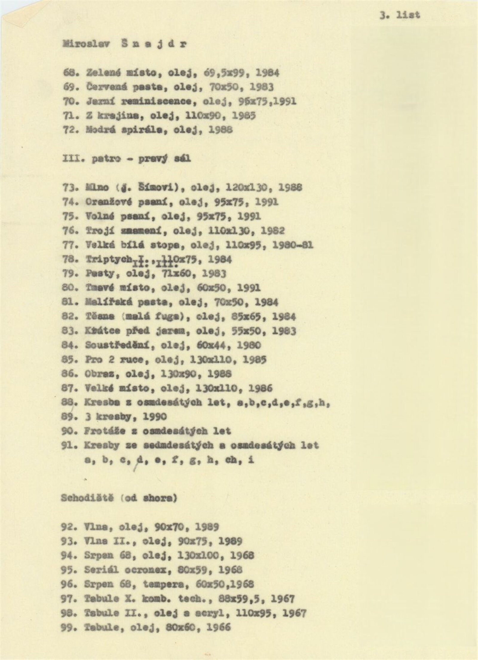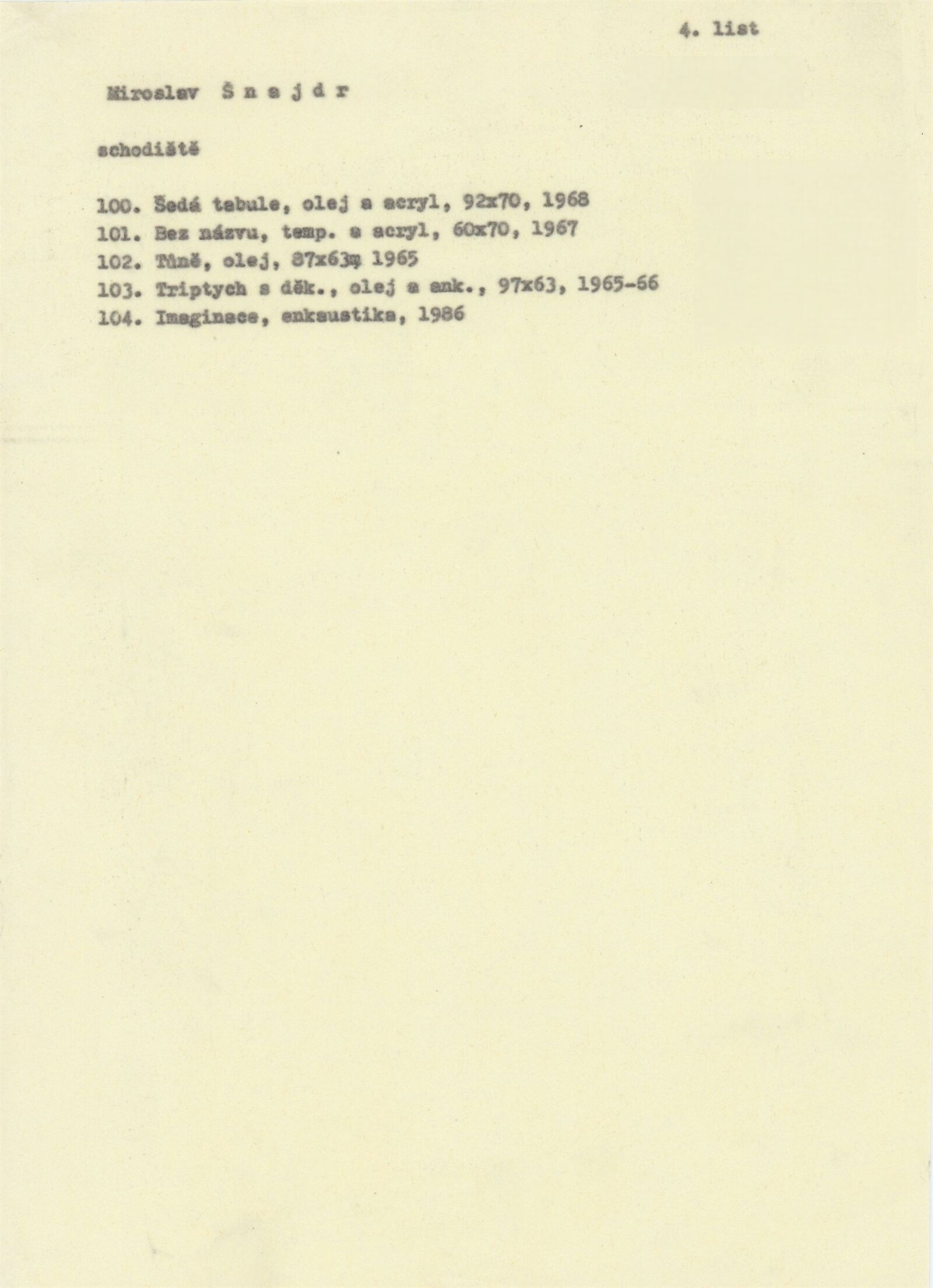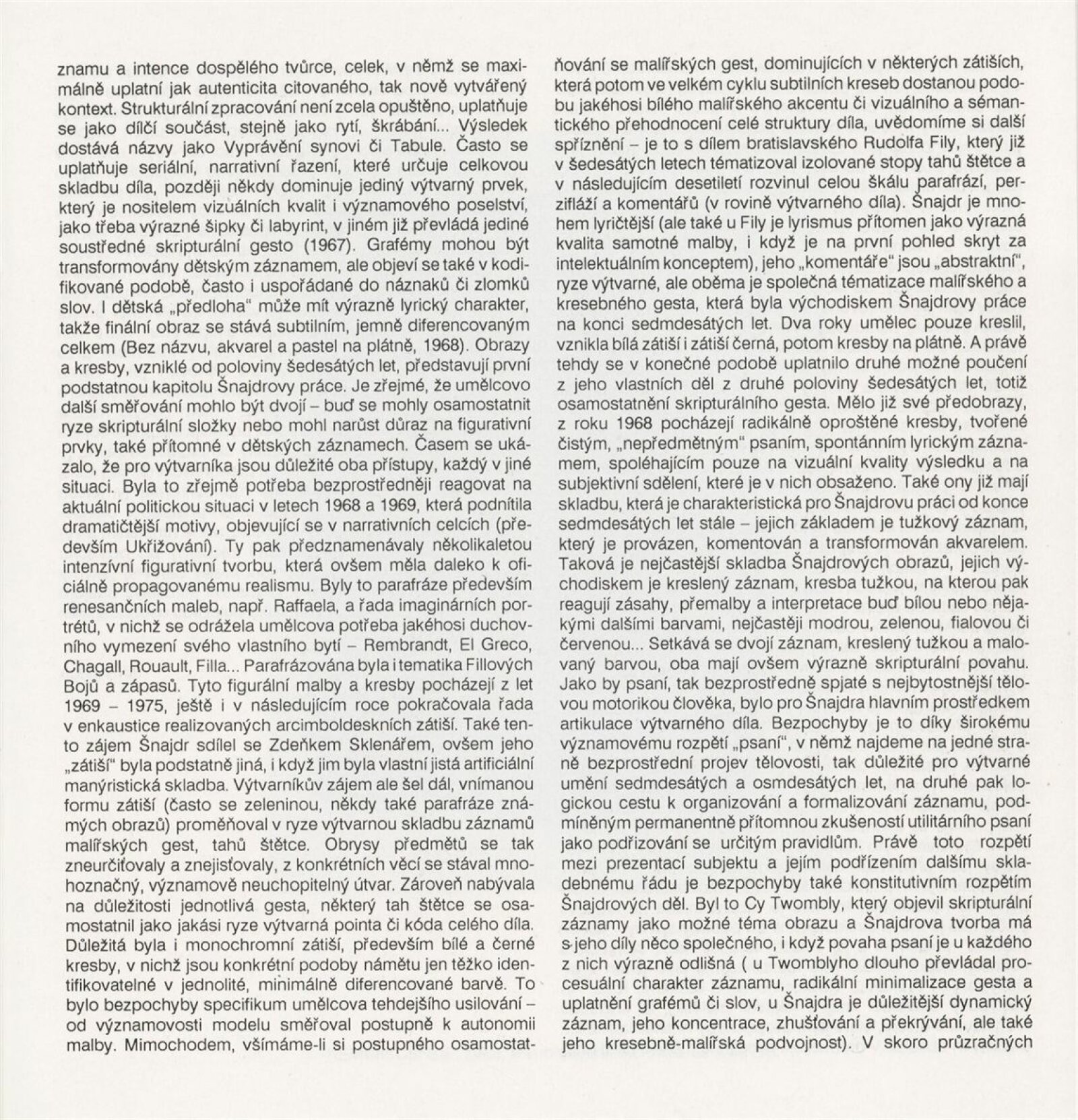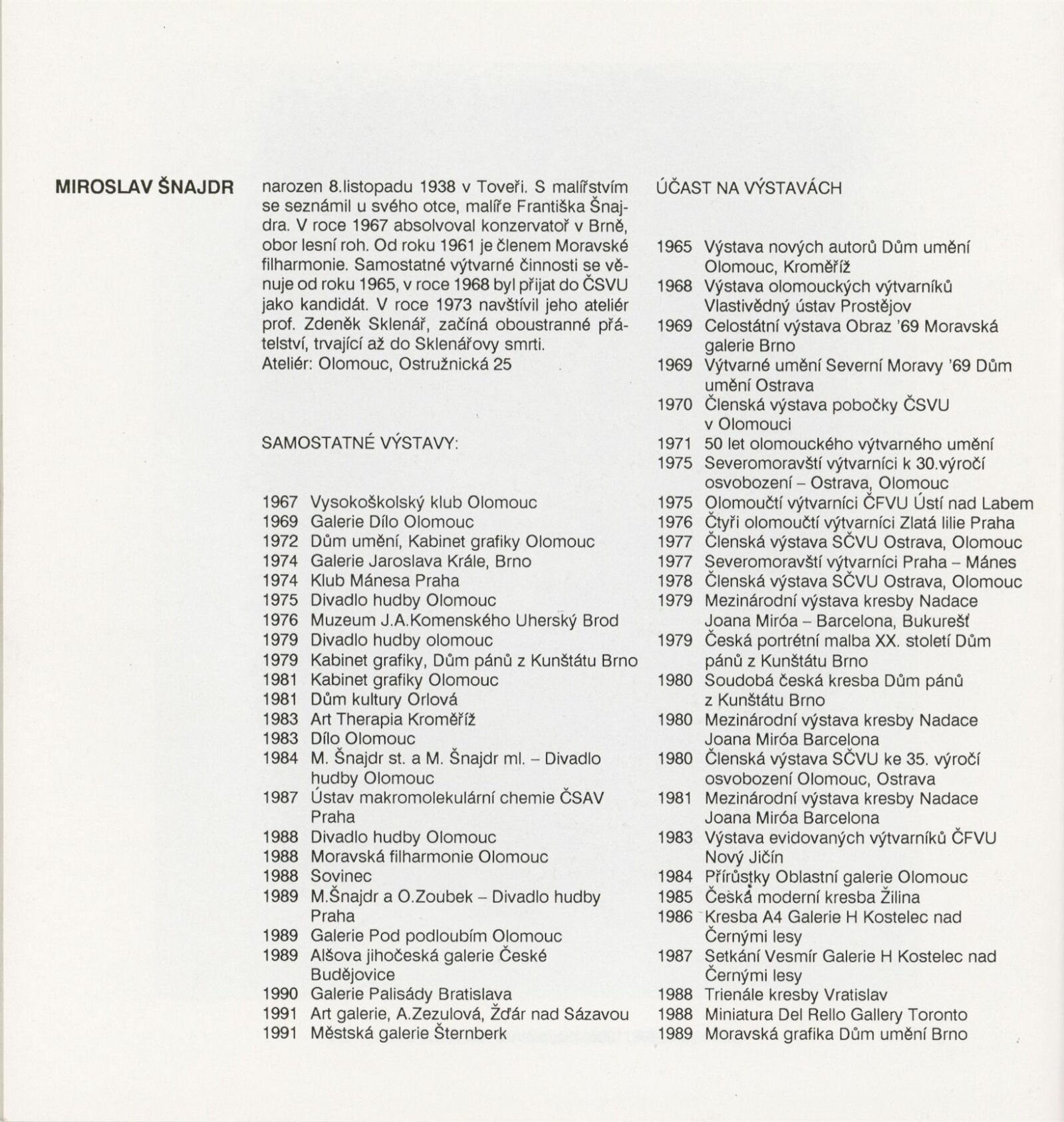 Miroslav Šnajdr. Obrazy a kresby: Galerie Stará radnice, 17. 10. – 24. 11. 1991 / Text: Jiří Valoch. – Brno: DUmB, 1991. – [25] s., obr., životní data, výstavy, zastoupení ve sbírkách, GSR 108. –MZK; MG