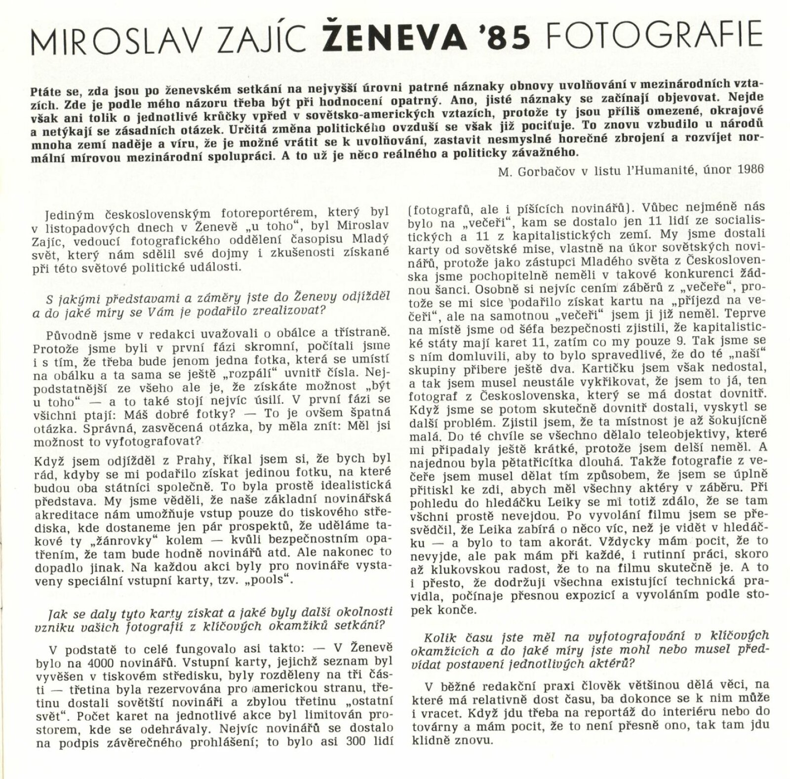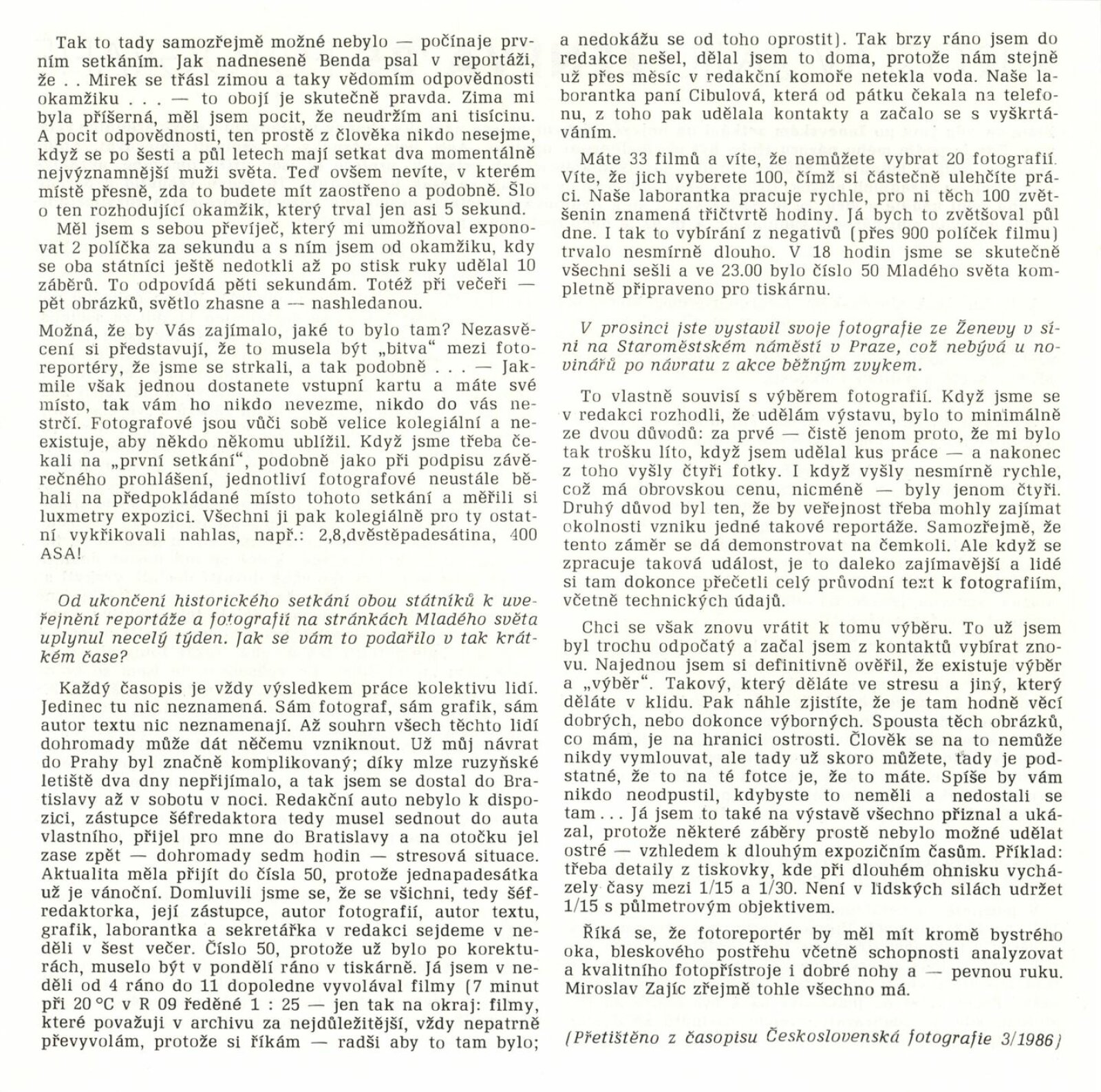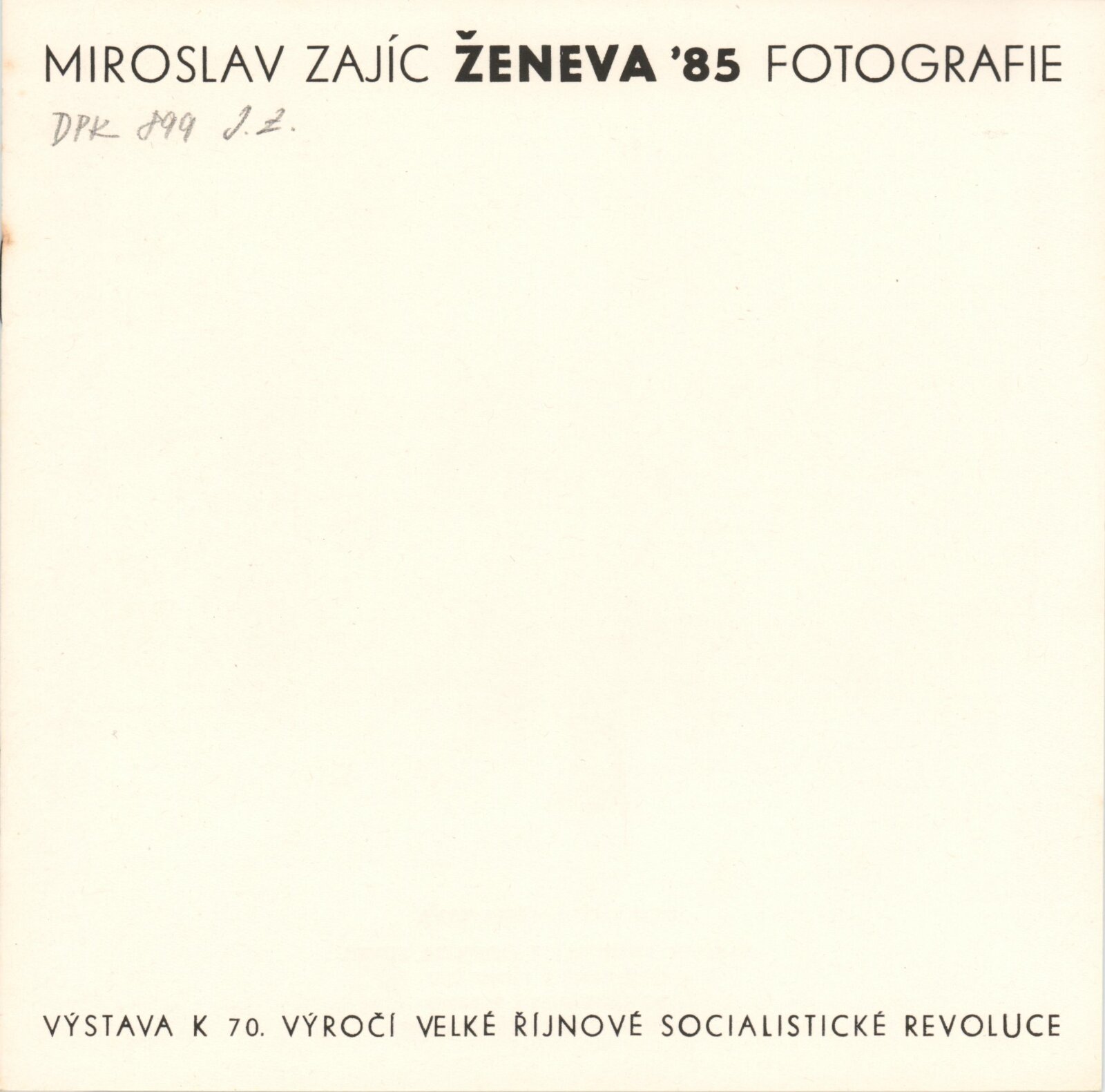 Miroslav Zajíc. Ženeva 85. Fotografie: Dům umění / Dům pánů z Kunštátu, Kabinet fotografie Jaromíra Funka, 13. [spr. 21.] 10. – 15. 11. 1987 / Text: anonymní. – Brno: DUmB, 1987. – [12] s., obr., DPK 899. – MZK; MG