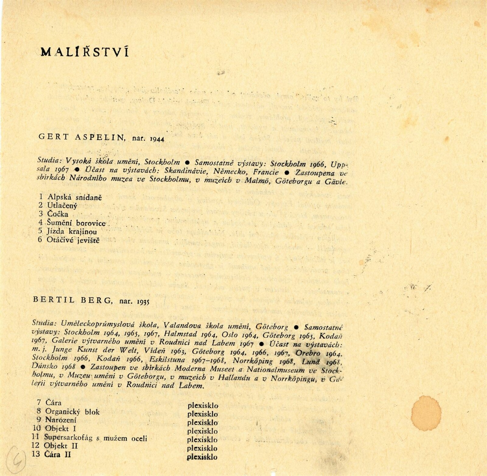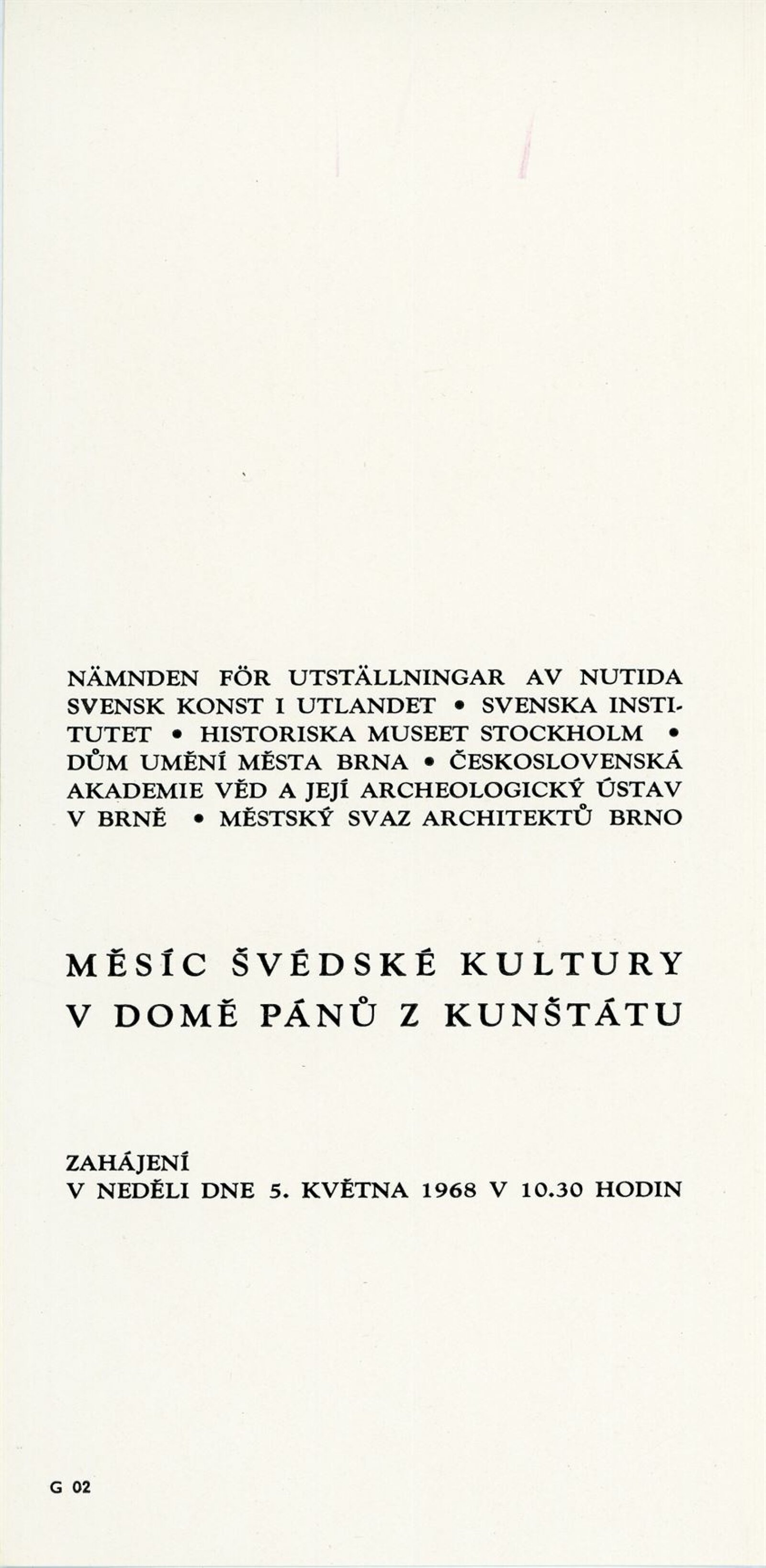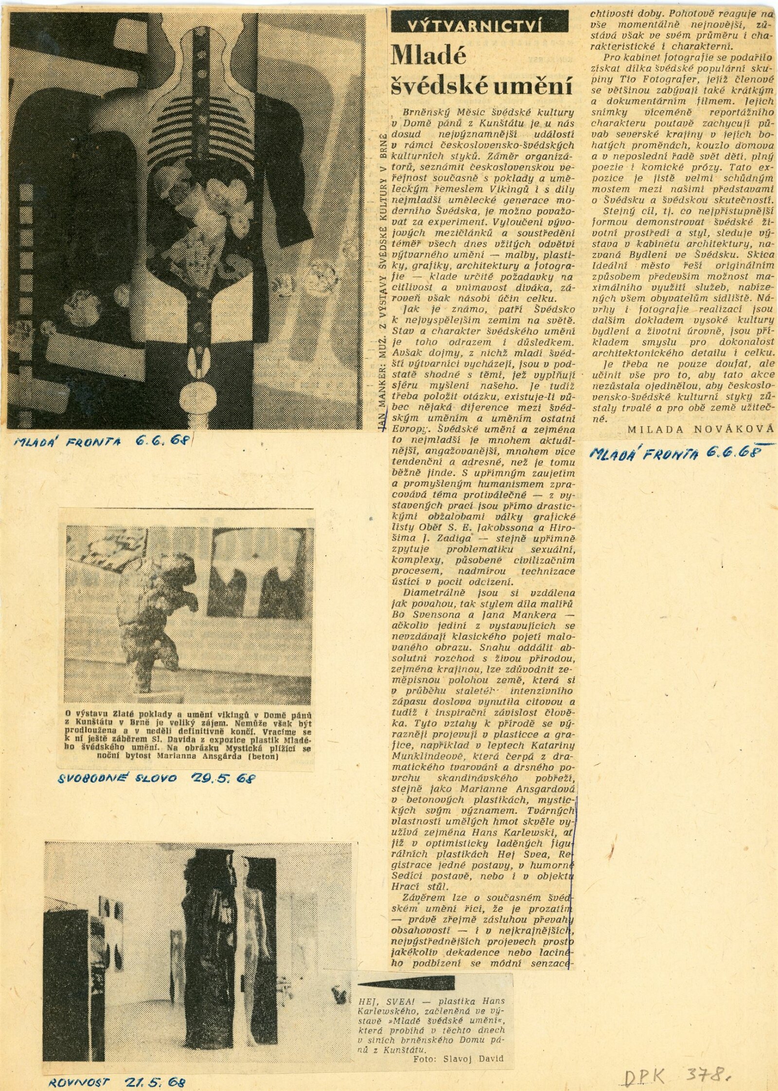 Mladé švédské umění: Dům umění města Brna / Dům pánů z Kunštátu, 1. patro, 5. 5. – 2. 6. 1968 / Text: Milada Nováková. – Brno: DUmB, 1968. – 16 s., obr., DPK 378. – MZK; MG