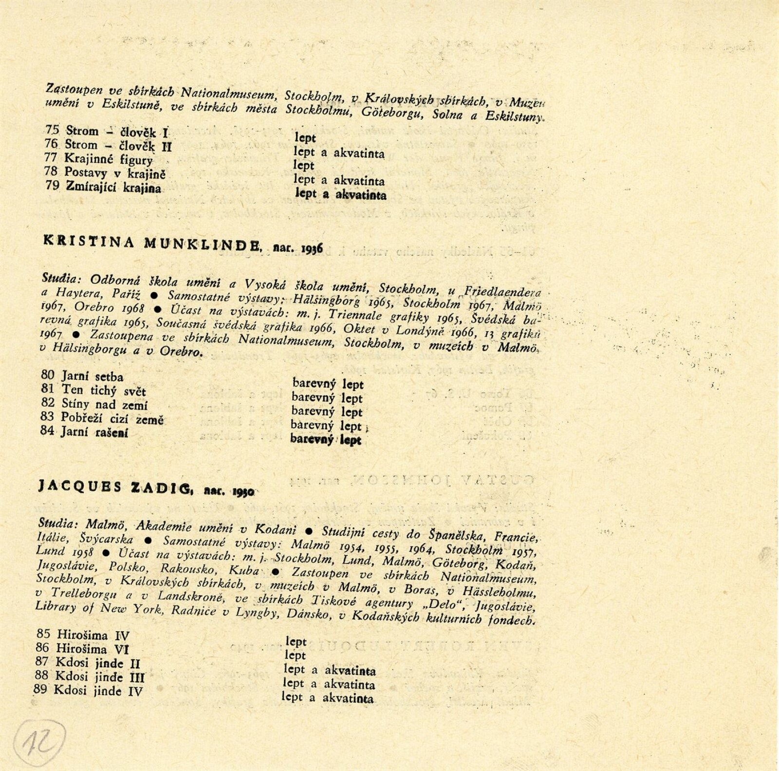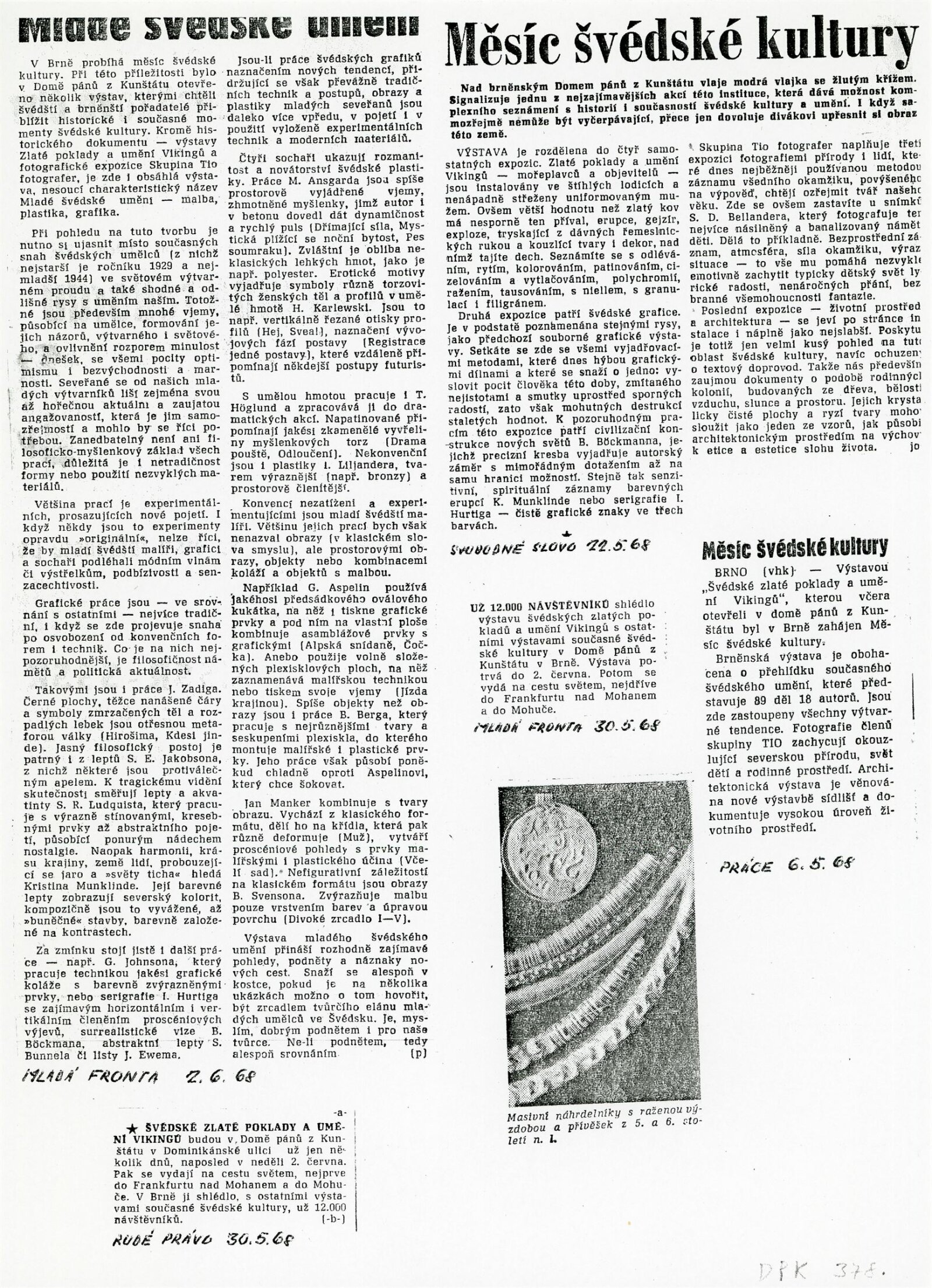 společná pozvánka DPK 377–380, nátisk katalogu, strojopis (výtah z kádrového materiálu – Milada Nováková), strojopis programu „Měsíc švédské kultury“, fotografie (z vernisáže a výstavy), korespondence (provozní korespondence – viz DPK 377), pojištění výstavy, recenze v tisku
