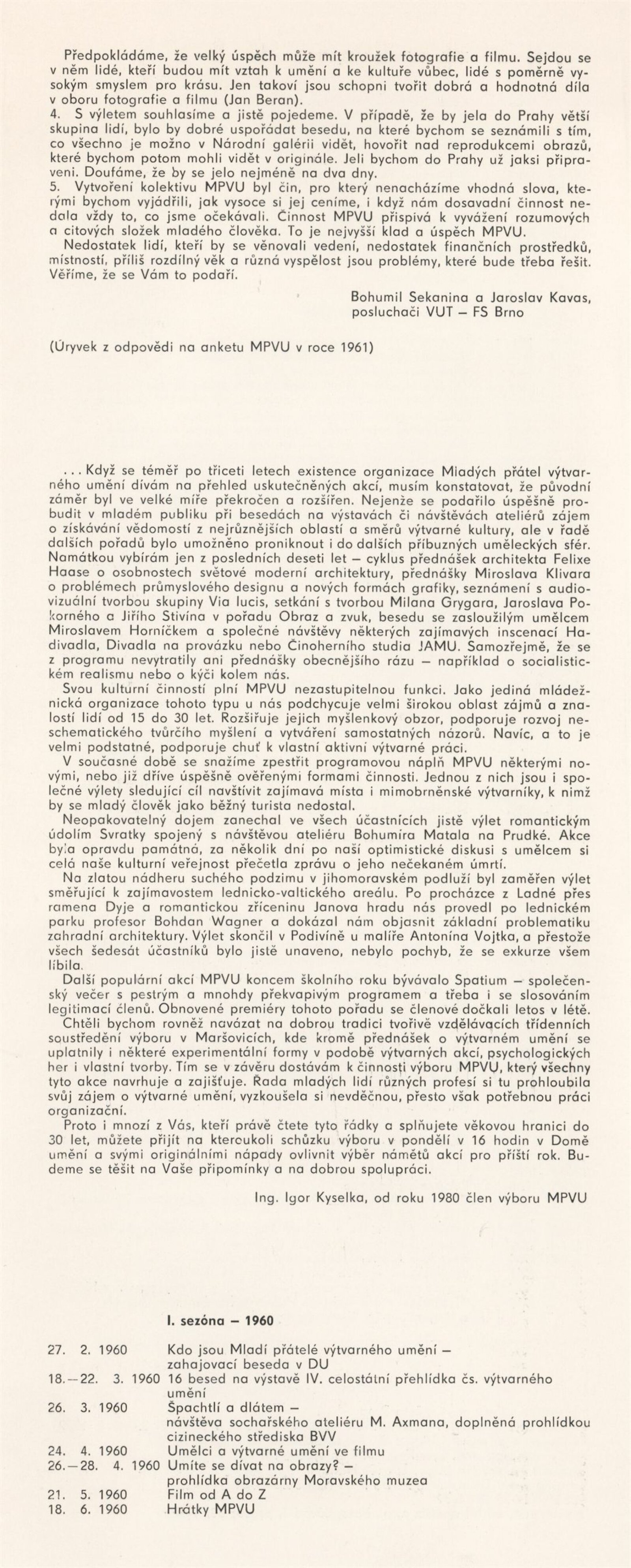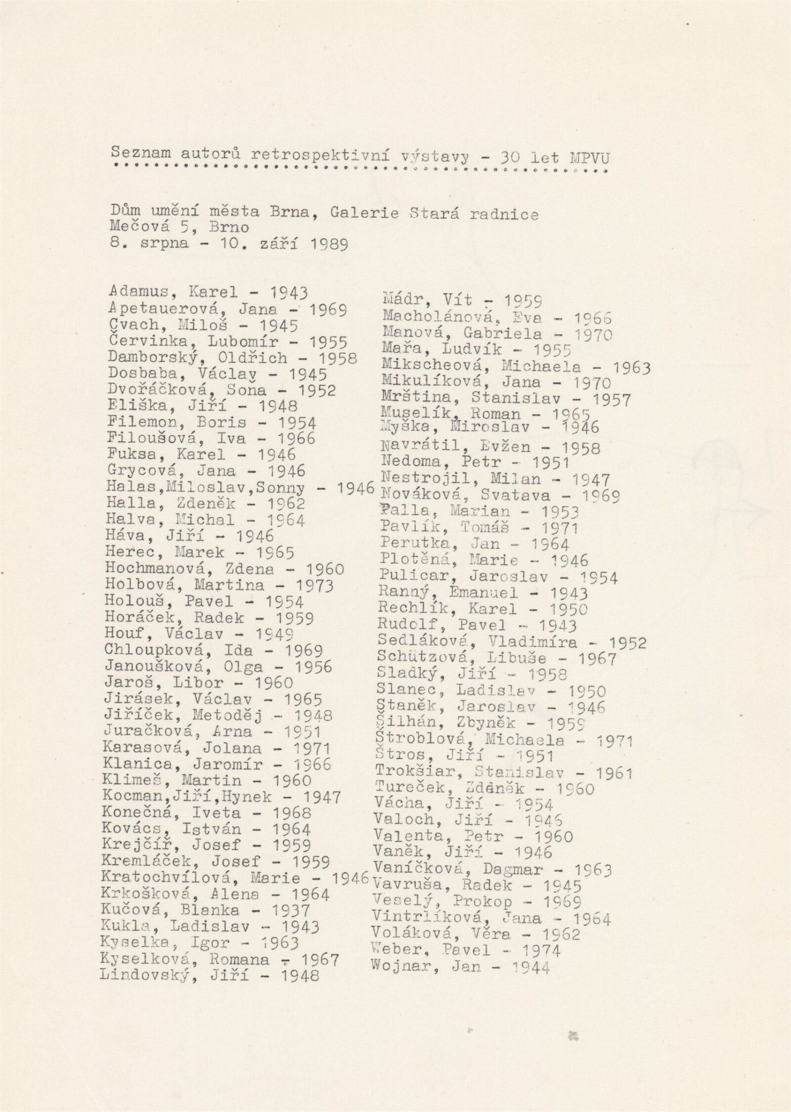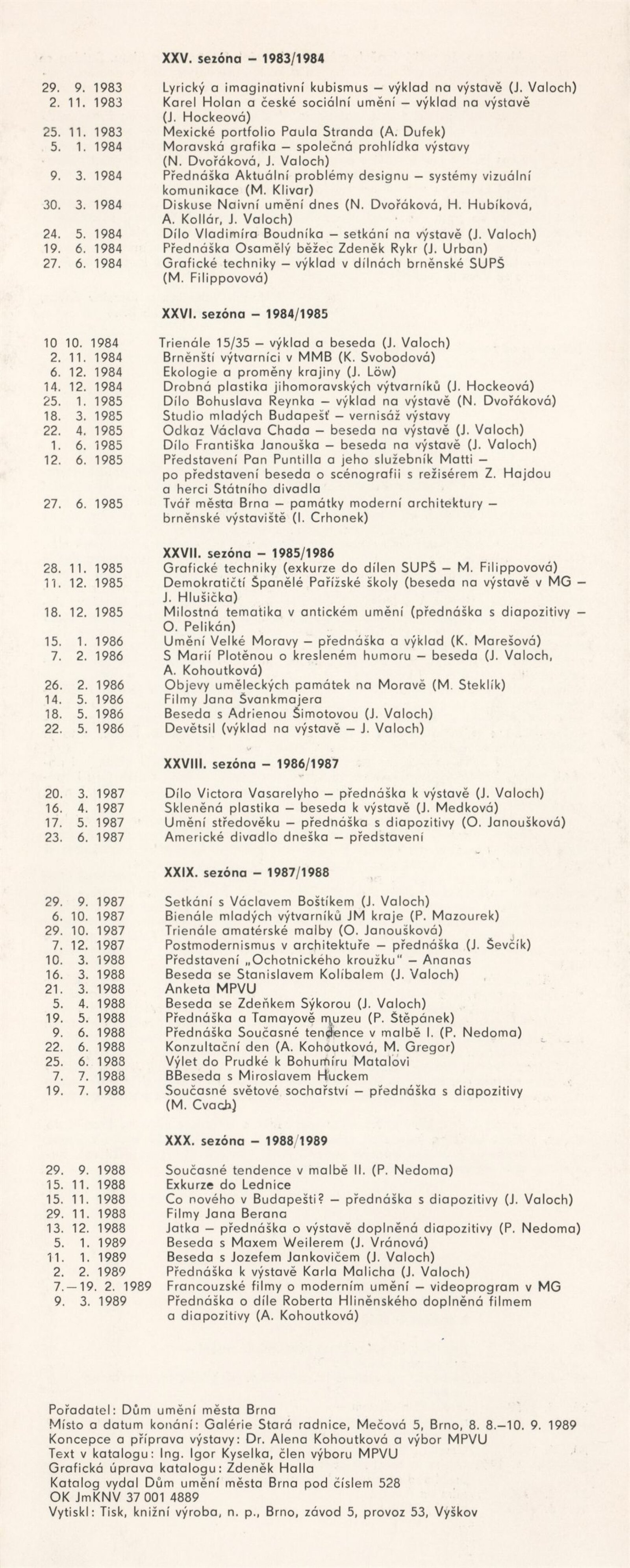 30 let MPVU: Galerie Stará radnice, přízemí, 8. 8. – 10. 9. 1989 / Texty: Bohumil Sekanina a Jaroslav Kavas, Igor Kyselka. – Brno: DUmB, 1989. – skládačka (8 s., obr.), obsahuje seznam všech akcí, GSR 53. – MZK; MG