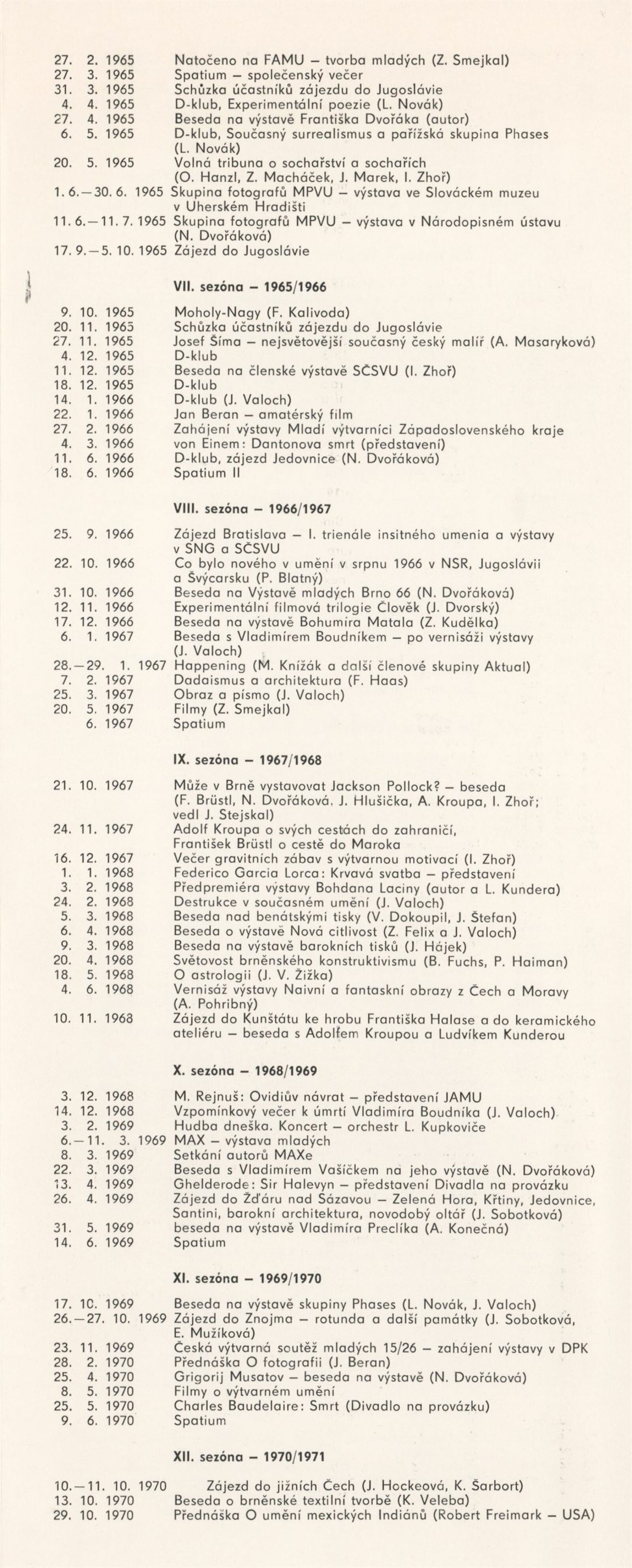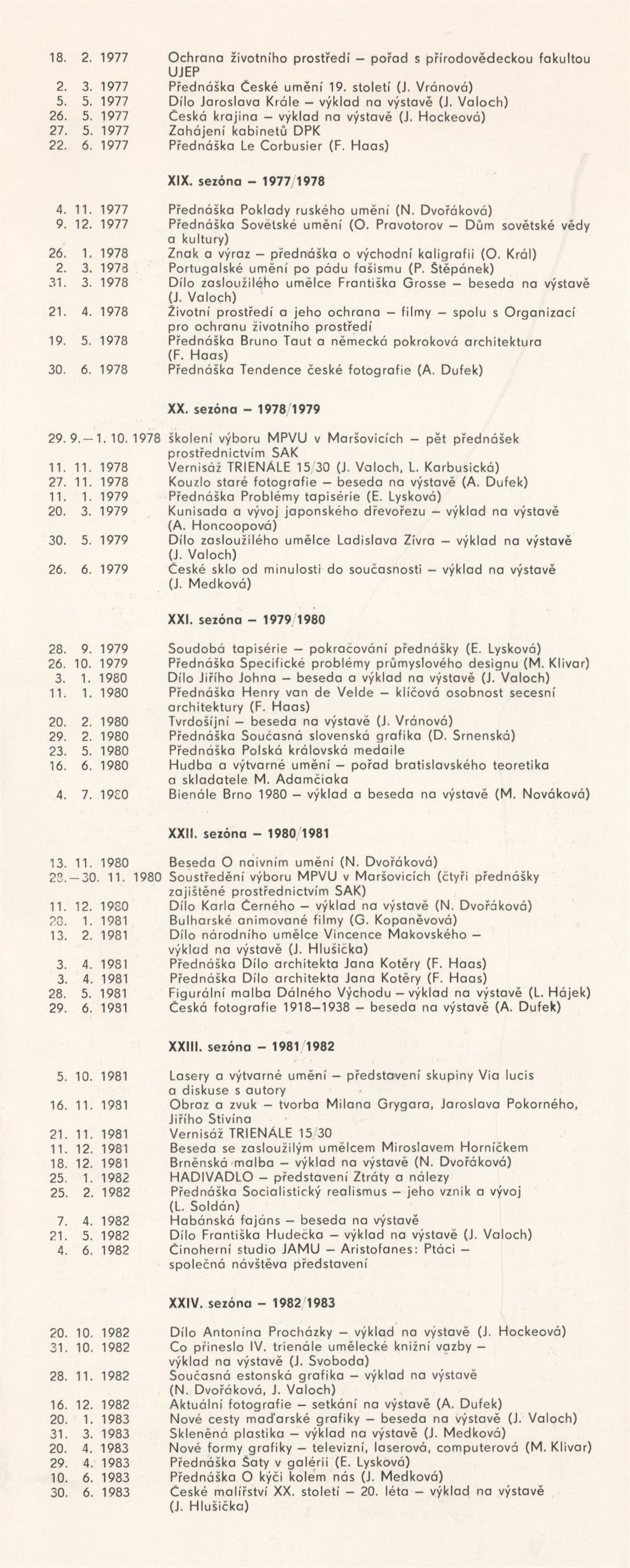 Karel Adamus, Jana Apetauerová, Miloš Cvach, Lubomír Červinka, Oldřich Damborský, Václav Dosbaba, Soňa Dvořáčková, Jiří Eliška, Boris Filemon, Iva Filoušová, Karel Fuksa, Jana Grycová, Miloslav Sonny Halas, Zdeněk Halla, Michal Halva, Jiří Háva, Marek Herec, Zdena Hochmanová, Martina Holbová, Pavel Holouš, Radek Horáček, Václav Houf, Ida Chloupková, Olga Janoušková, Libor Jaroš, Václav Jirásek, Metoděj Jiříček, Arna Juračková, Jolana Karasová, Jaromír Klanica, Martin Klimeš, Jiří Hynek Kocman, Iveta Konečná, István Kovács, Josef Krejčíř, Josef Kremláček, Marie Kratochvílová, Alena Krkošková, Blanka Kučová, Ladislav Kukla, Igor Kyselka, Romana Kyselková, Jiří Lindovský, Vít Mádr, Eva Macholánová, Gabriela Manová, Ludvík Mařa, Michaela Mikscheová, Jana Mikulíková, Stanislav Mrština, Roman Muselík, Miroslav Myška, Evžen Navrátil, Petr Nedoma, Milan Nestrojil, Svatava Nováková, Marian Palla, Tomáš Pavlík, Jan Perutka, Marie Plotěná, Jaroslav Pulicar, Emanuel Ranný, Karel Rechlík, Pavel Rudolf, Vladimíra Sedláková, Libuše Schützová, Jiří Sladký, Ladislav Slanec, Jaroslav Staněk, Zbyněk Šilhán, Michaela Štroblová, Jiří Štros, Stanislav Trokšiar, Zdeněk Tureček, Jiří Vácha, Jiří Valoch, Petr Valenta, Jiří Vaněk, Dagmar Vaníčková, Radek Vavruša, Prokop Veselý, Jana Vintrlíková, Věra Voláková, Pavel Weber, Jan Wojnar