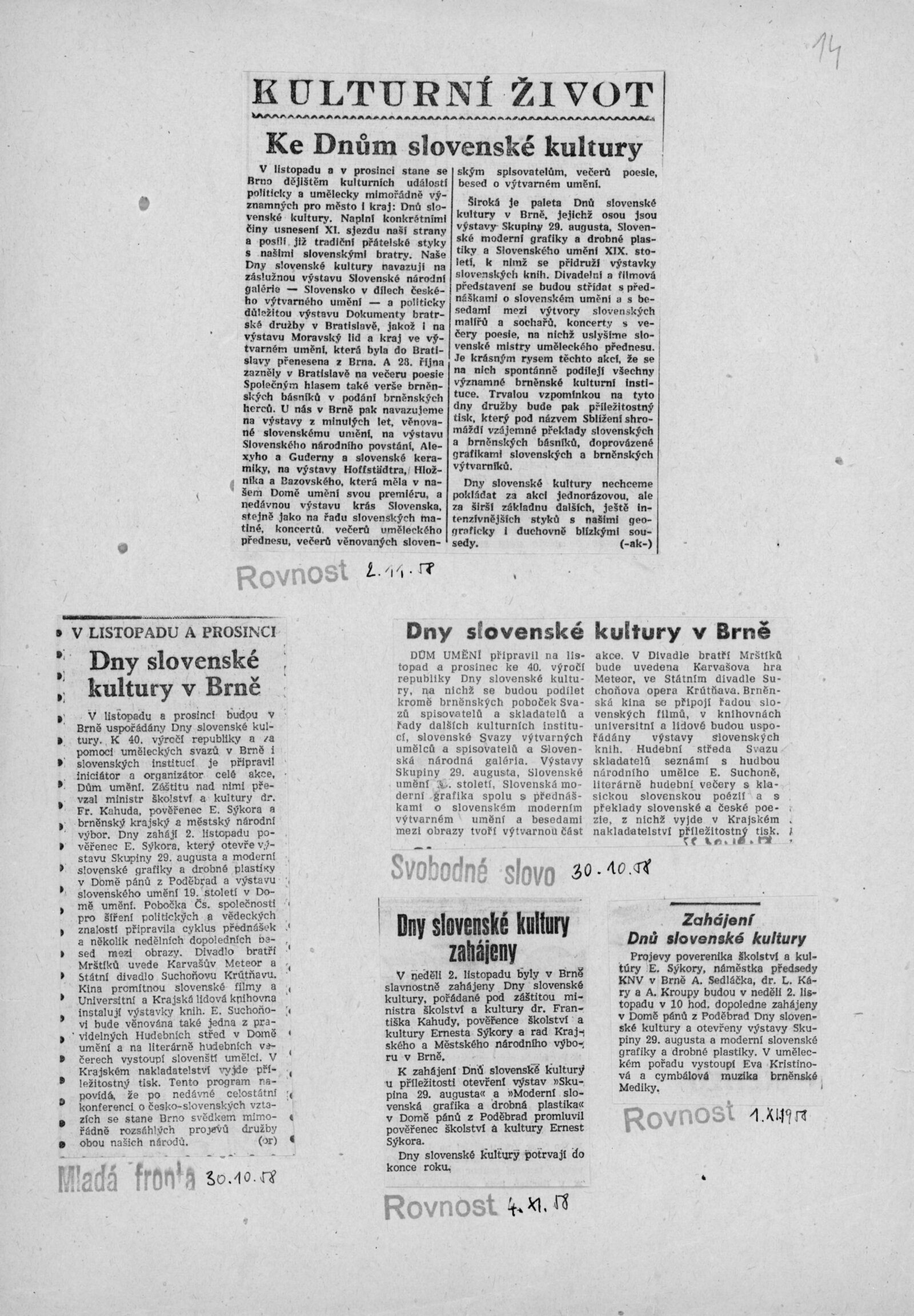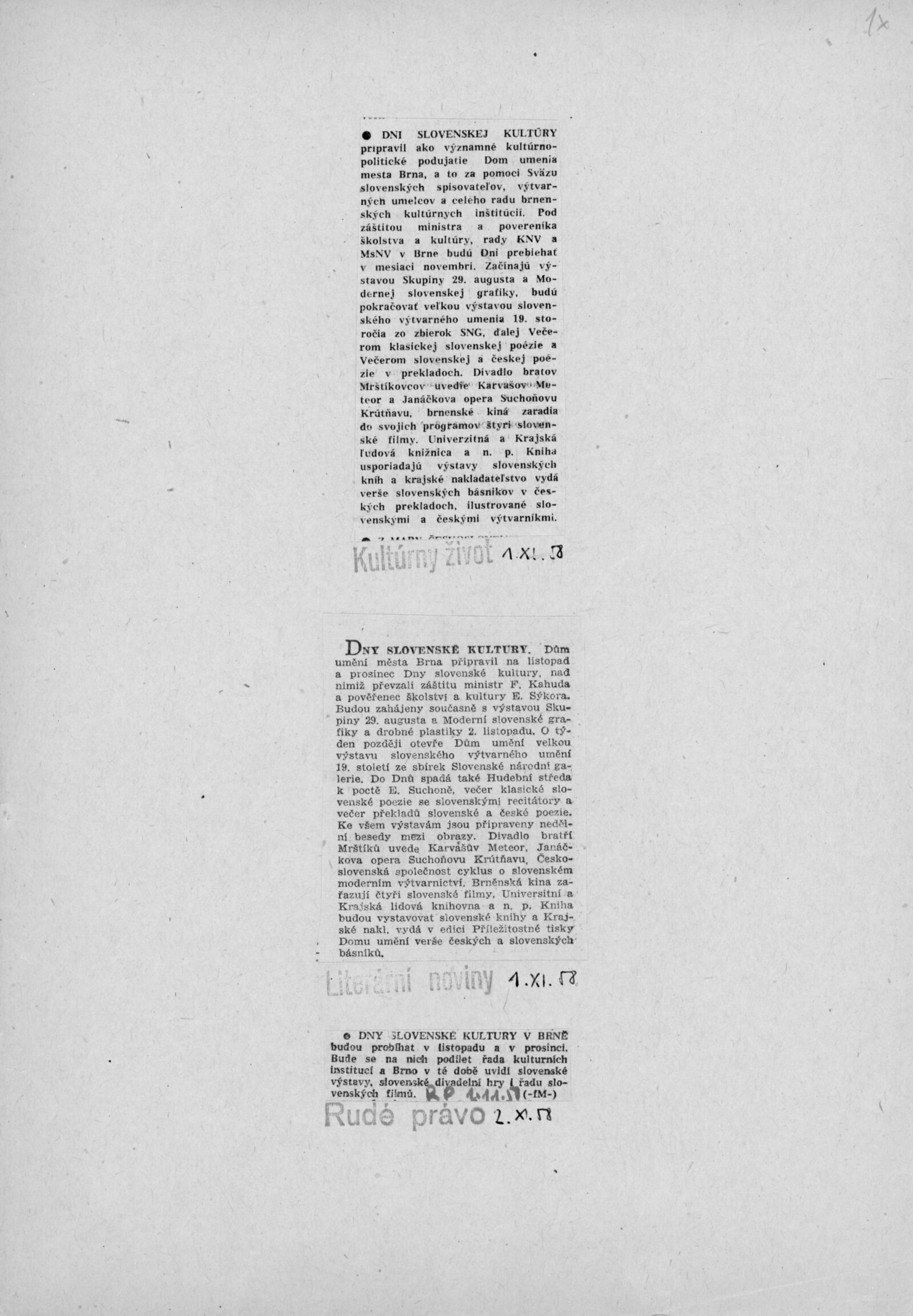 spol. pozvánka Dny slovenské kultury (DPK 13–14), strojopisy textů k výstavě, seznam děl, provozní korespondence, potvrzení o převzetí a předání děl, adresy majitelů, recenze v tisku