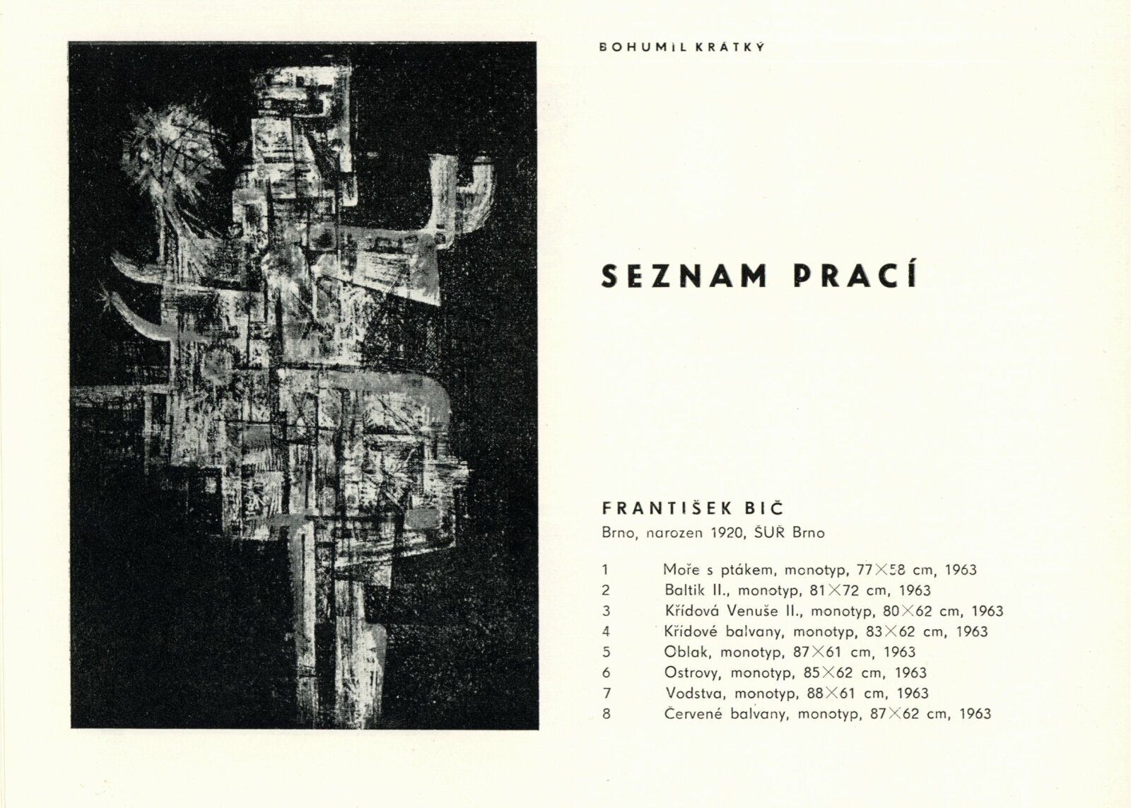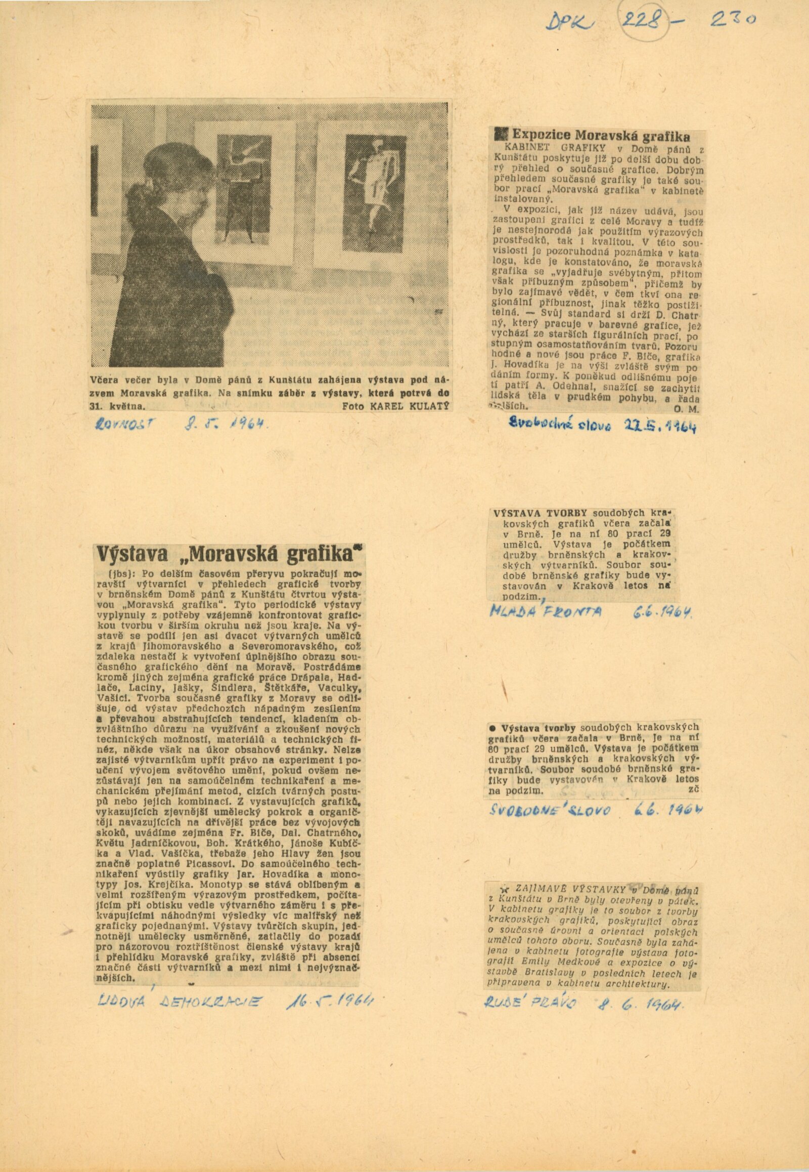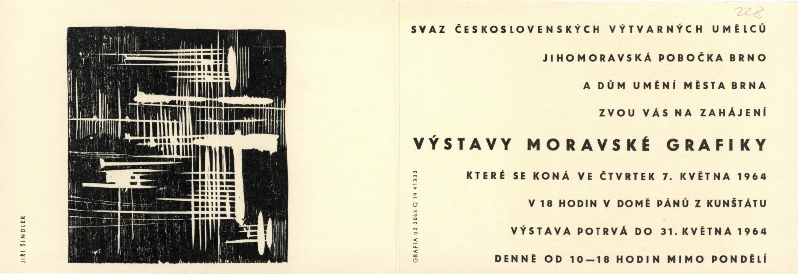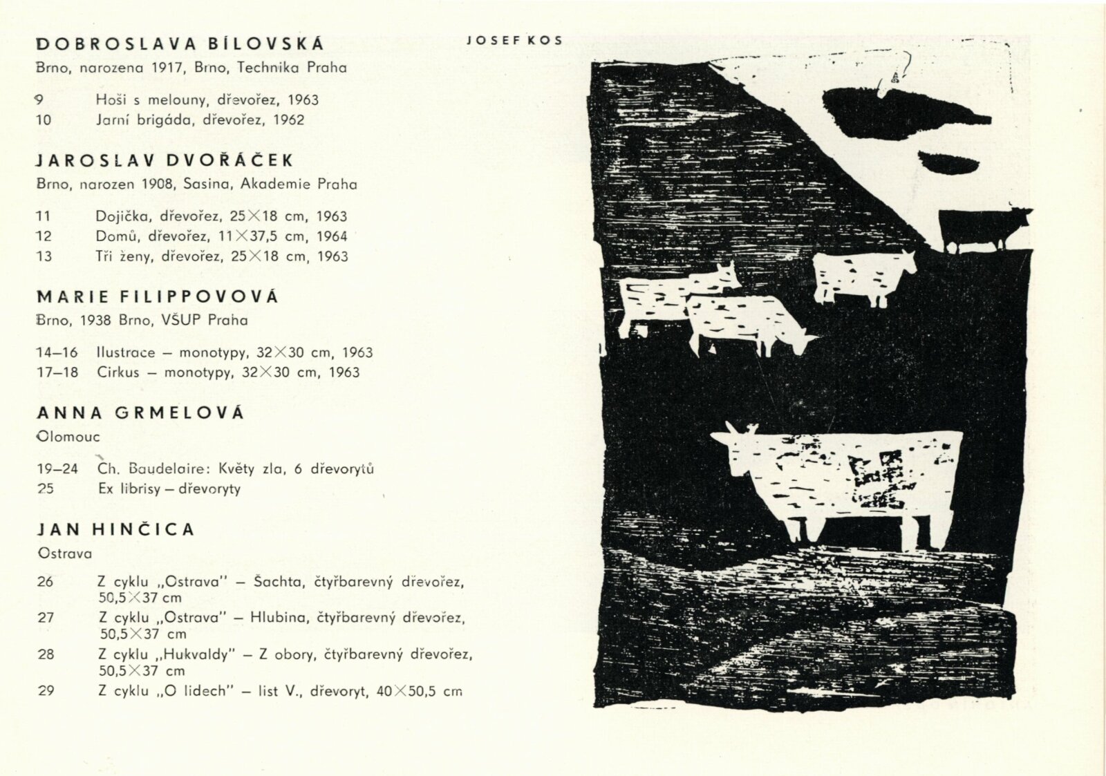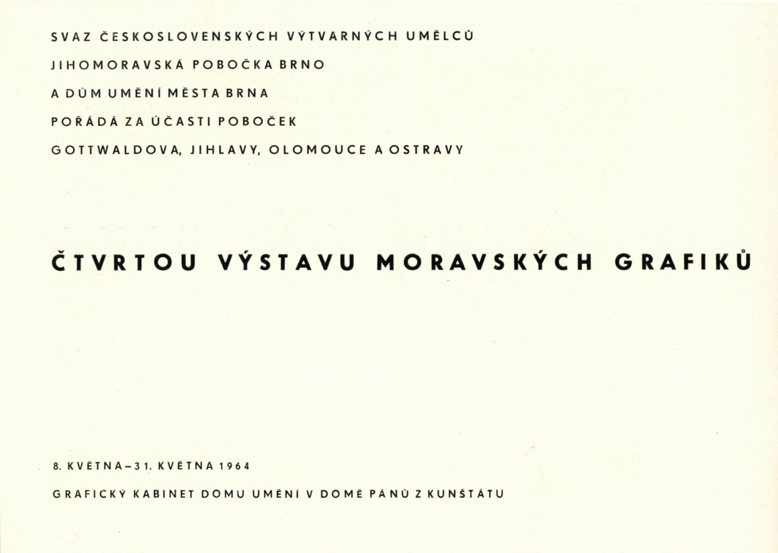 Moravská grafika. Čtvrtá výstava moravských grafiků: Dům umění města Brna / Dům pánů z Kunštátu, Kabinet grafiky, 8. 5. – 31. 5. 1964 / Text: Helena Kusáková. – Brno: SČSVU, 1964. – 20 s., obr., životní data vystavujících, DPK 228. – MZK; MG