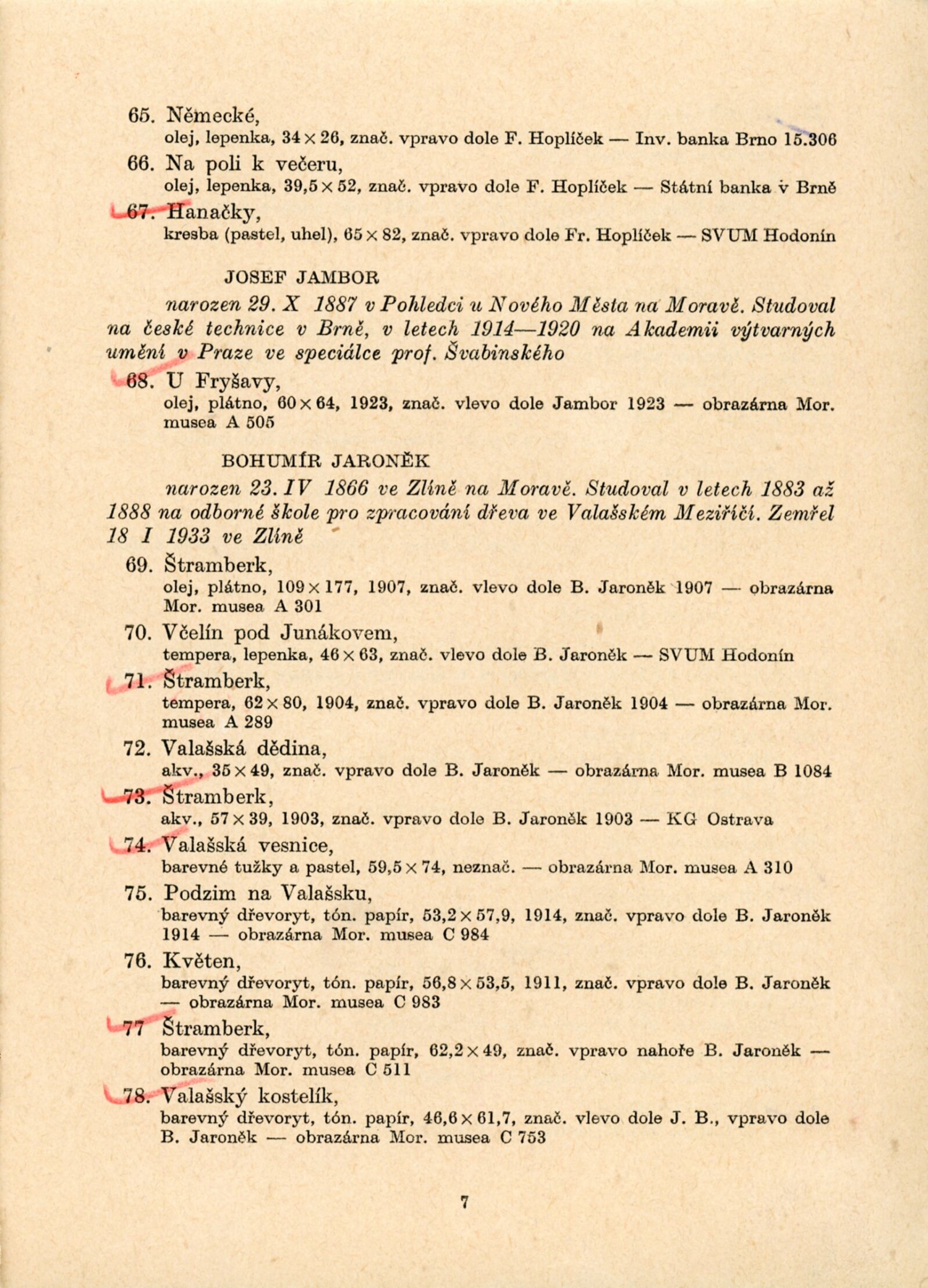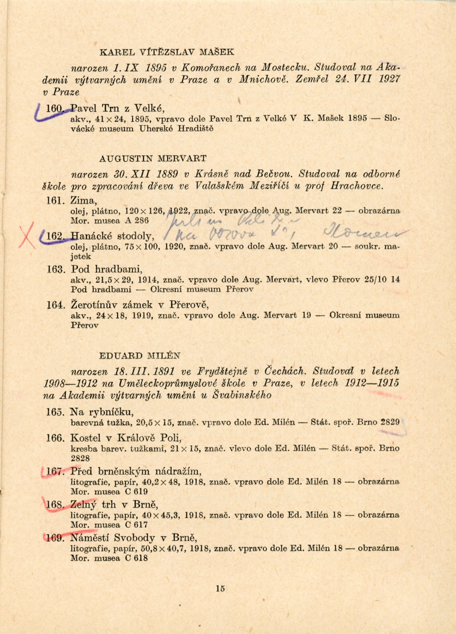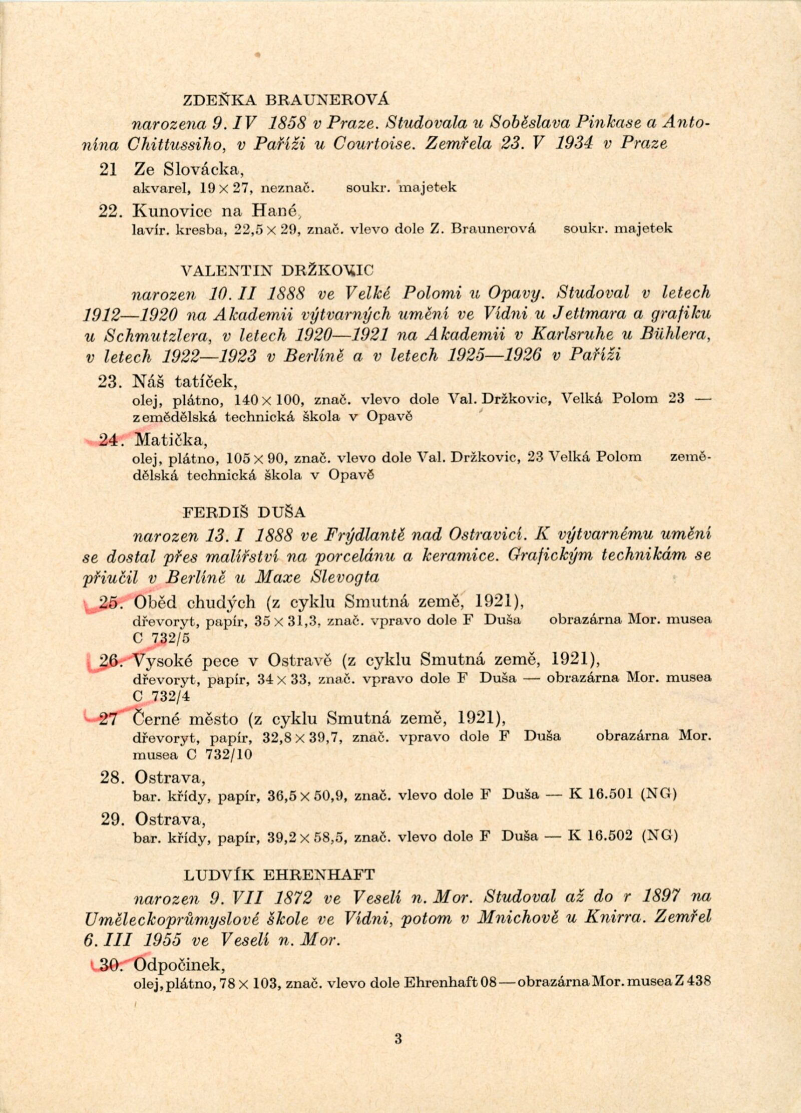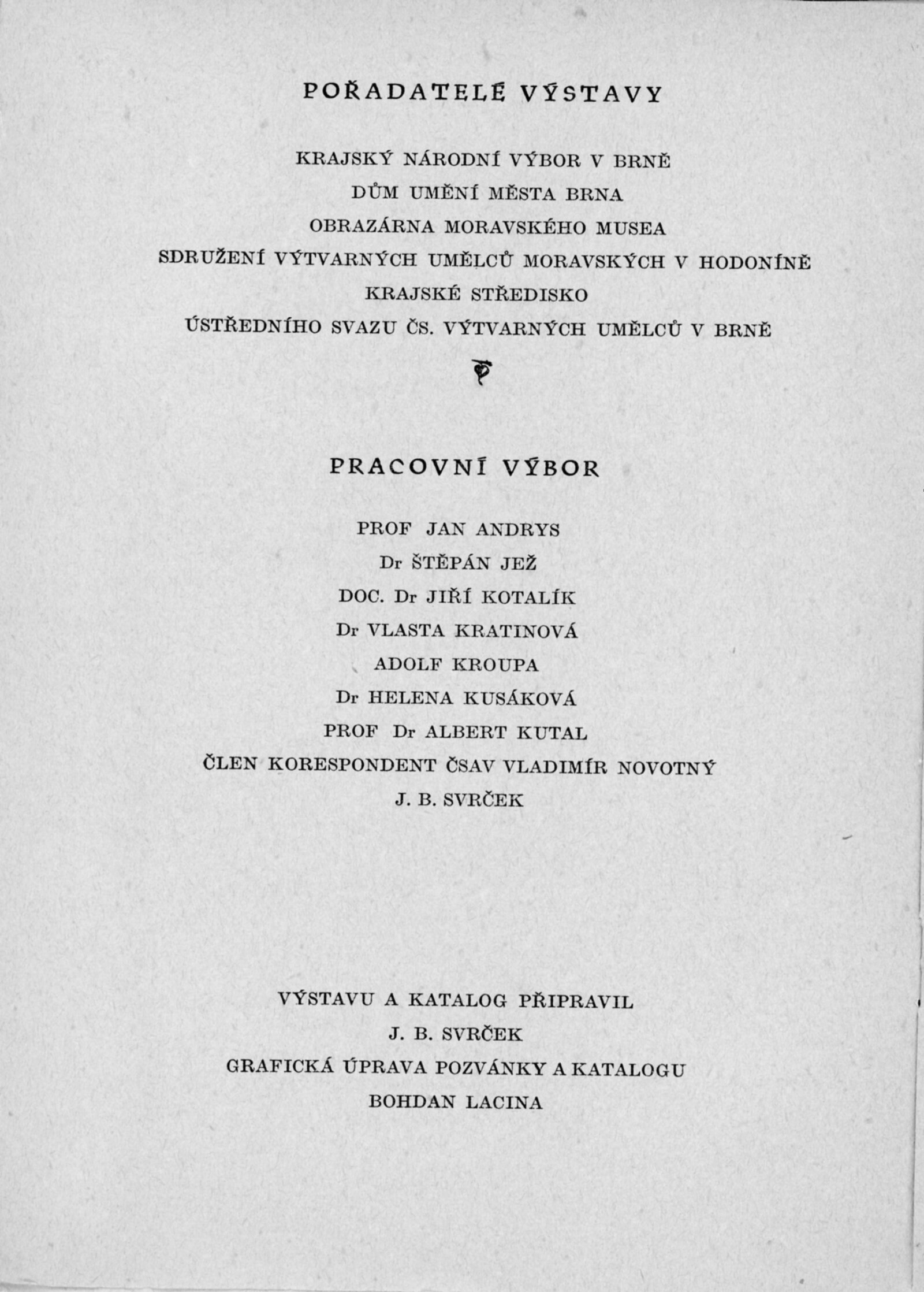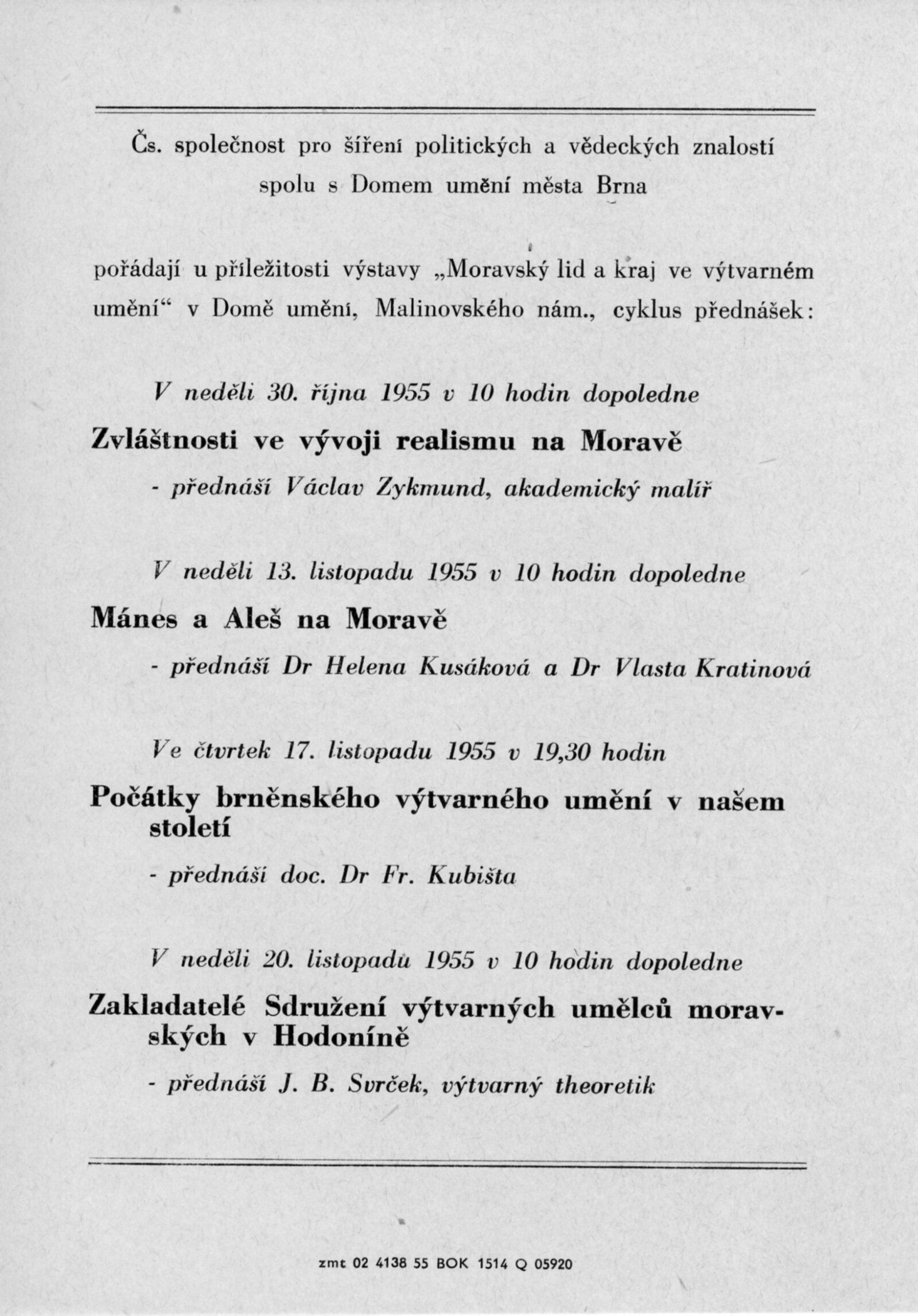 Moravský lid a kraj ve výtvarném umění (1850–1920): Dům umění města Brna, 23. 10. – 27. 11. 1955 / Texty: Vilém Mrštík, Jiří Mahen, William Ritter. – Brno: DUmB, 1955. – 19 s., seznam vystavených prací, inspirační zdroje J. B. Svrčka, báseň Františka Nechvátala, životní data vystavujících umělců, DU 233. – MG