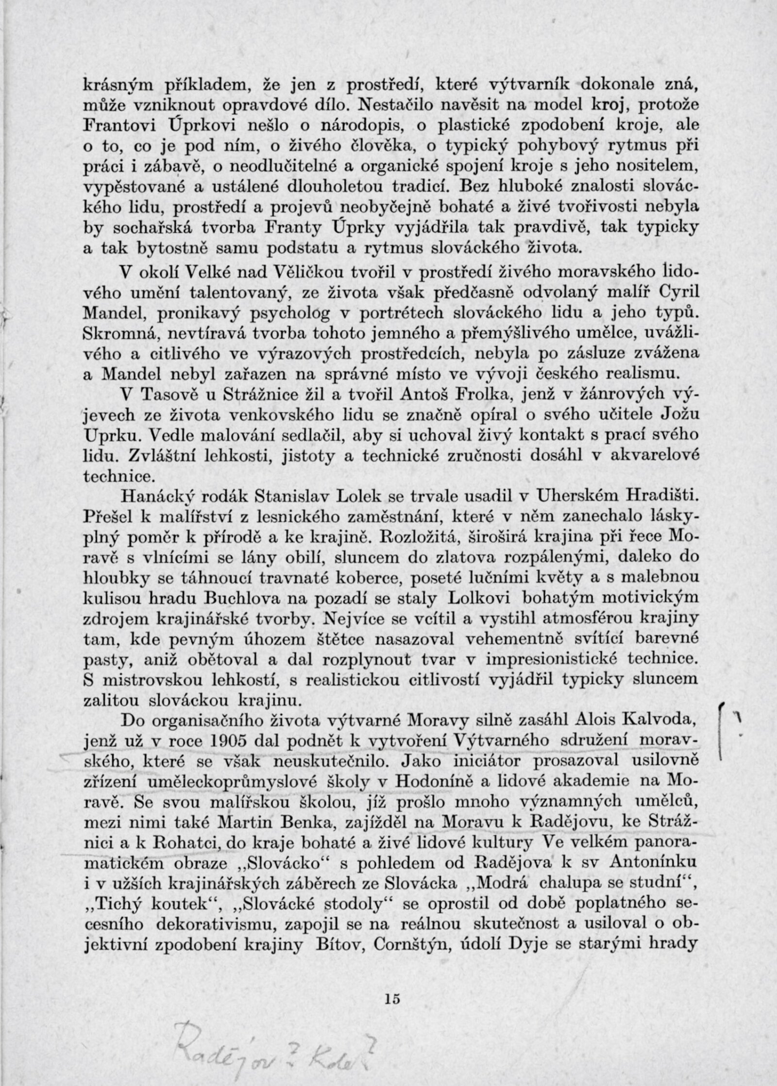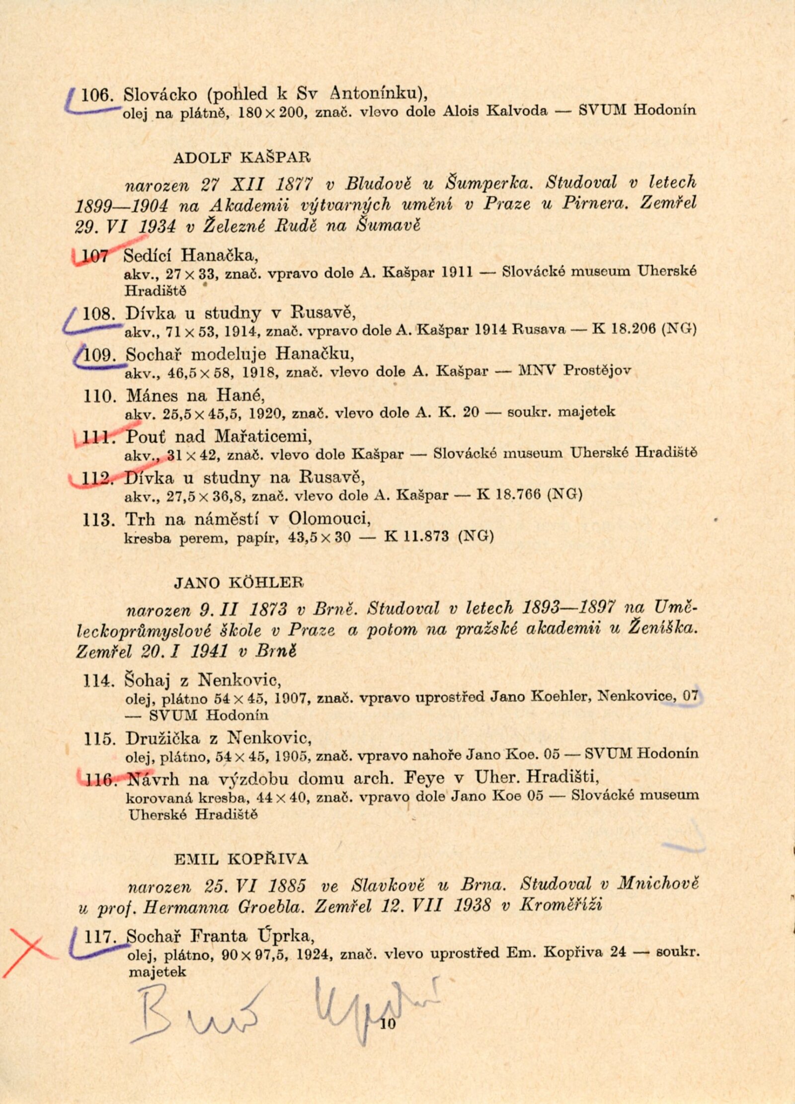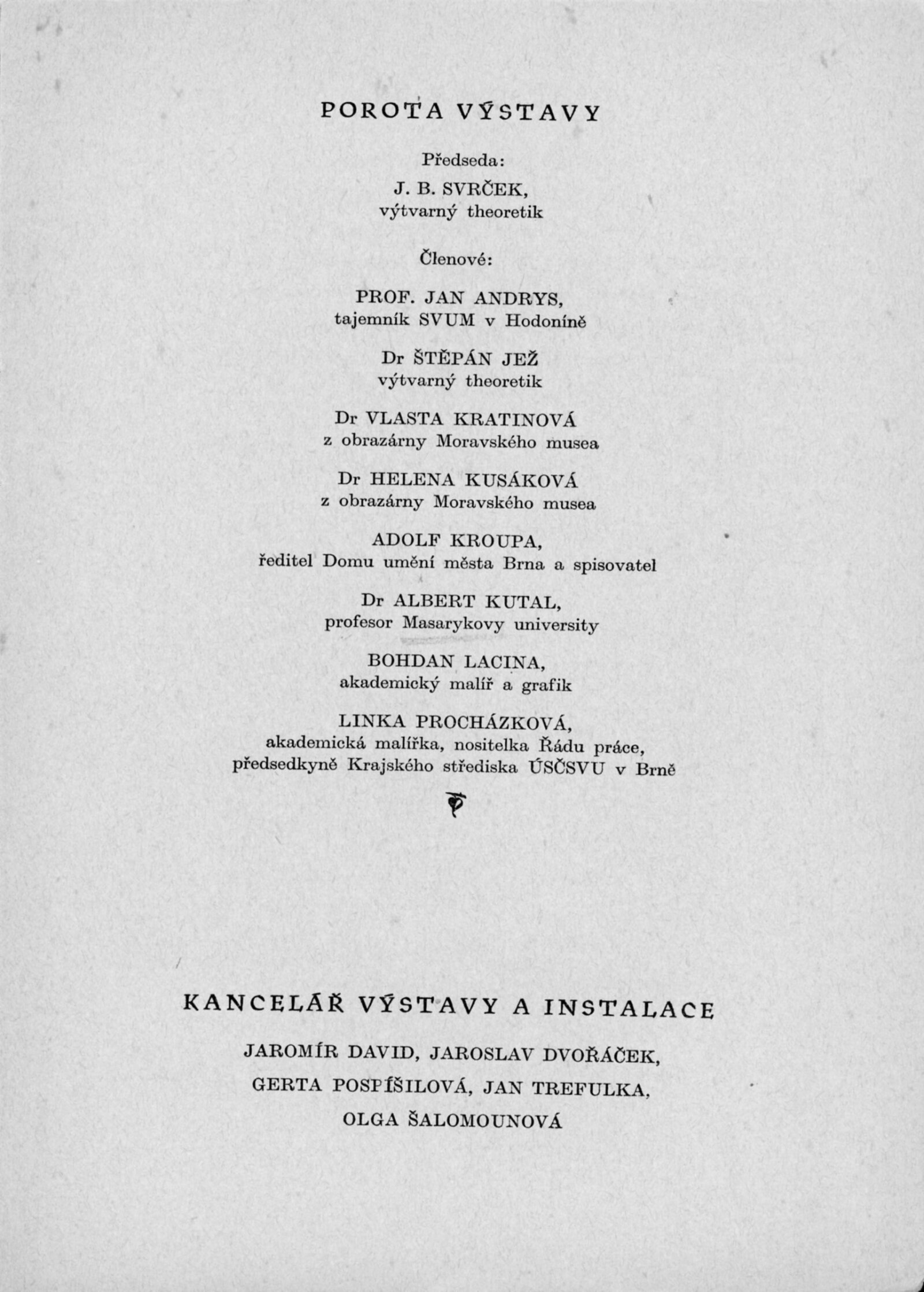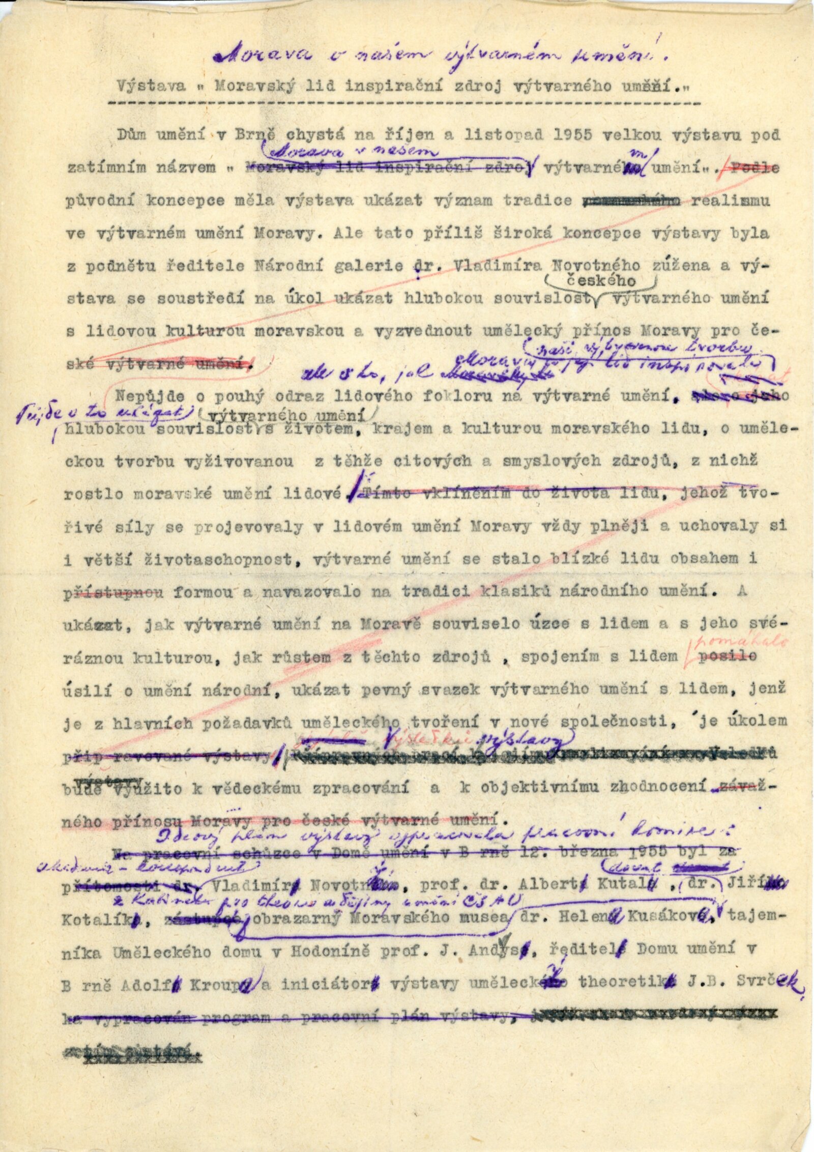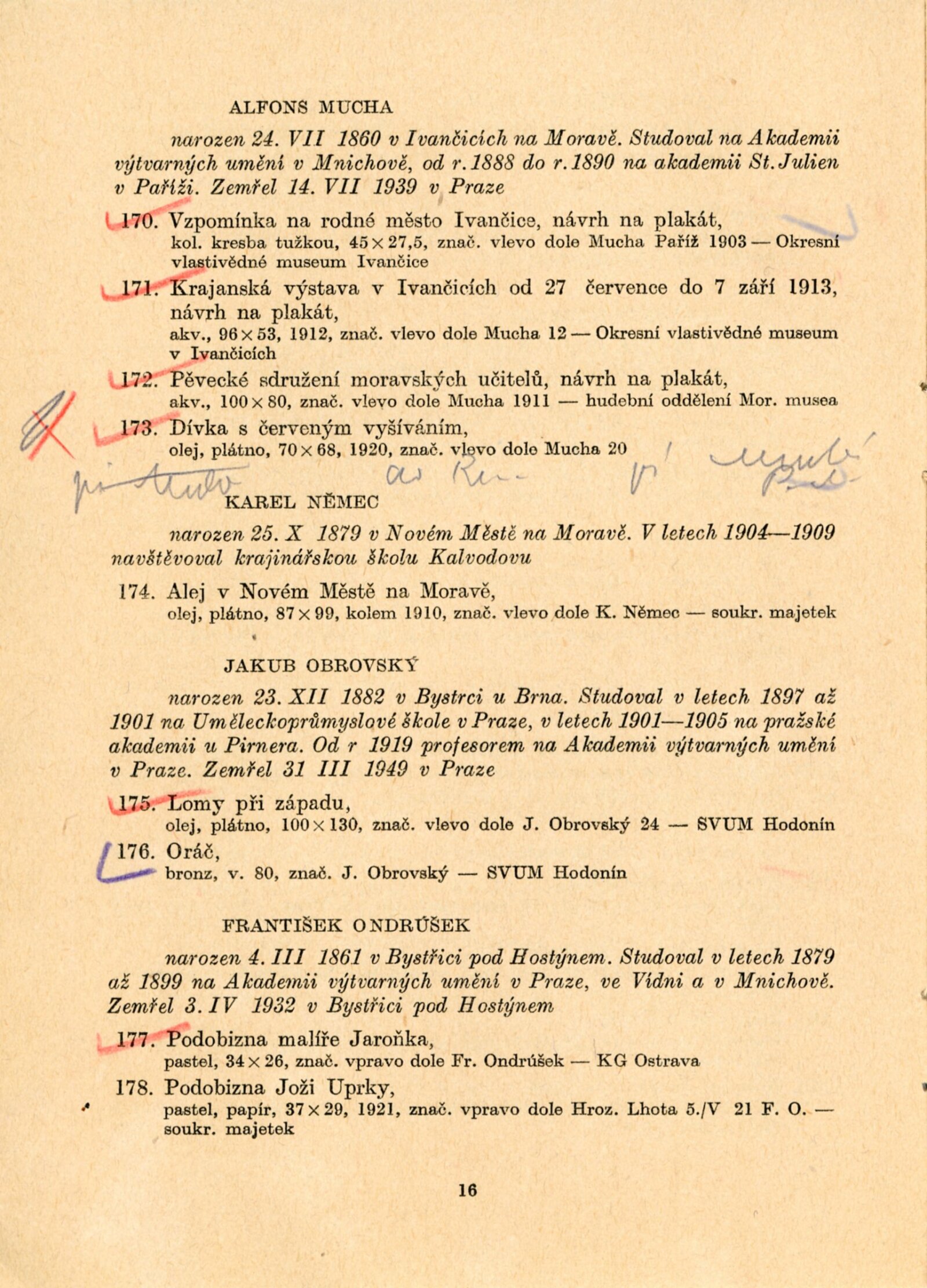 Moravský lid a kraj ve výtvarném umění (1850–1920): Dům umění města Brna, 23. 10. – 27. 11. 1955 / Texty: Vilém Mrštík, Jiří Mahen, William Ritter. – Brno: DUmB, 1955. – 19 s., seznam vystavených prací, inspirační zdroje J. B. Svrčka, báseň Františka Nechvátala, životní data vystavujících umělců, DU 233. – MG