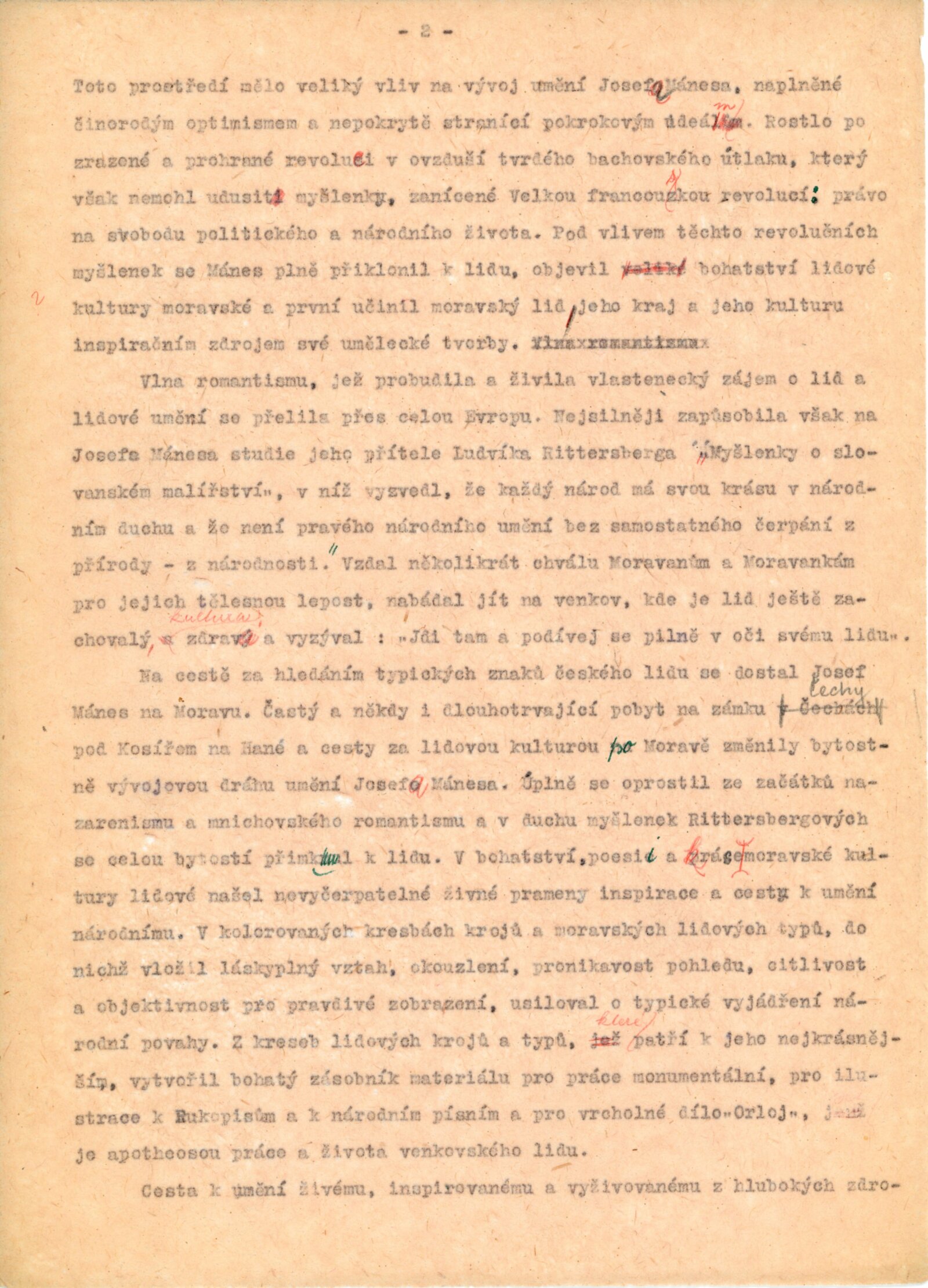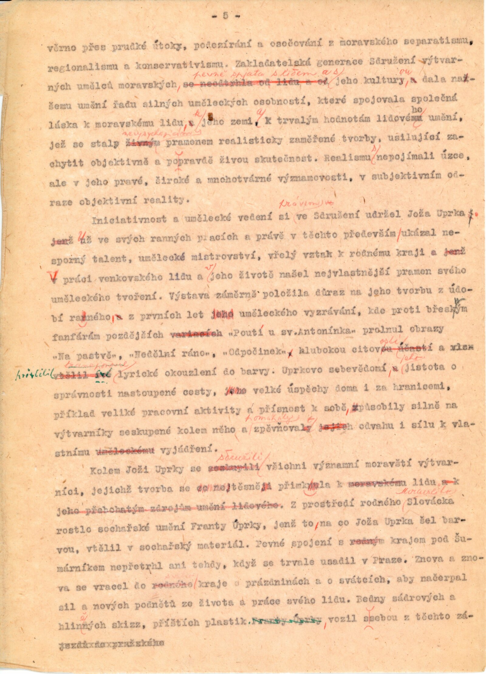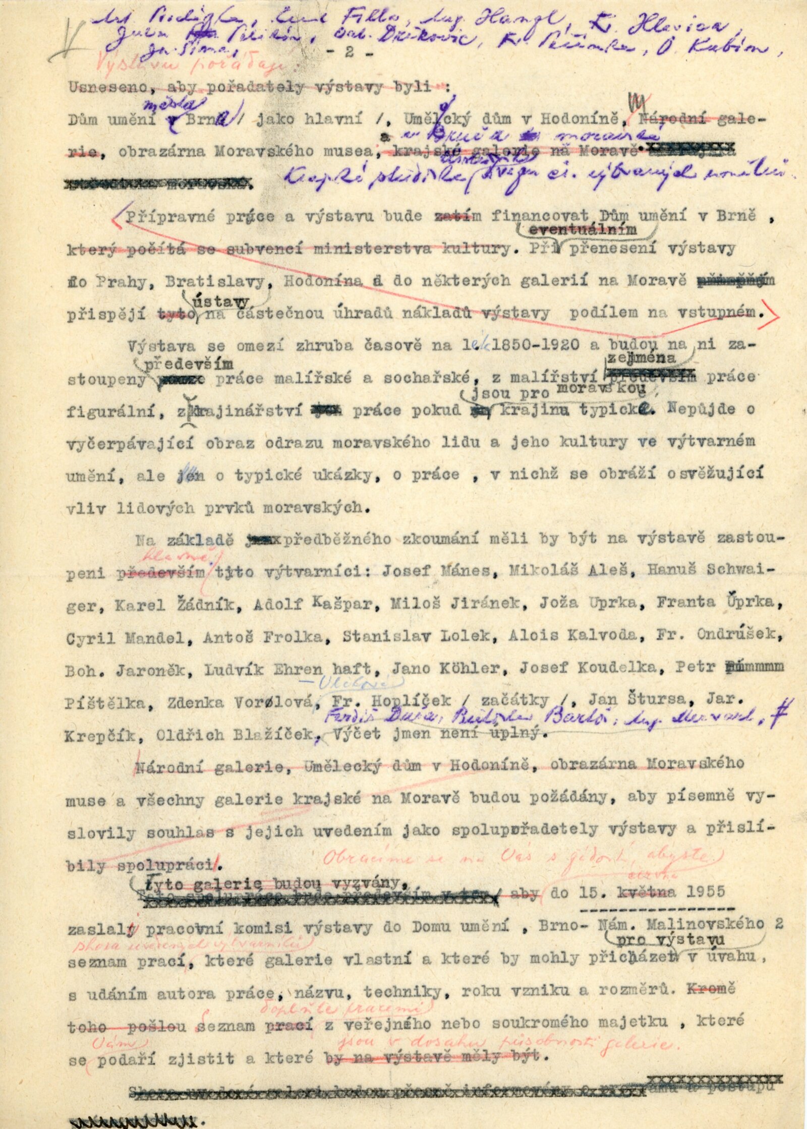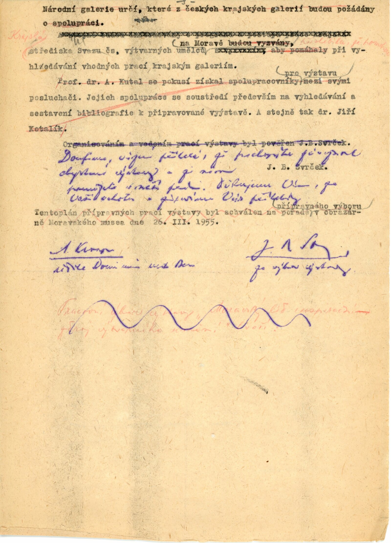 pozvánka na vernisáž a přednášku, katalog, leták, text úvodního slova (J. B. Svrček), text pro rozhlas, koncepce výstavy a plán přípravných prací, seznam vystavených a nevystavených prací, provozní korespondence (o zápůjčkách M. Muchová, J. Kotalík, J. Mašín ad.), rozpočet, pojistný seznam, zápis z přípravných schůzí, potvrzení o převzetí a vrácení děl, reversy