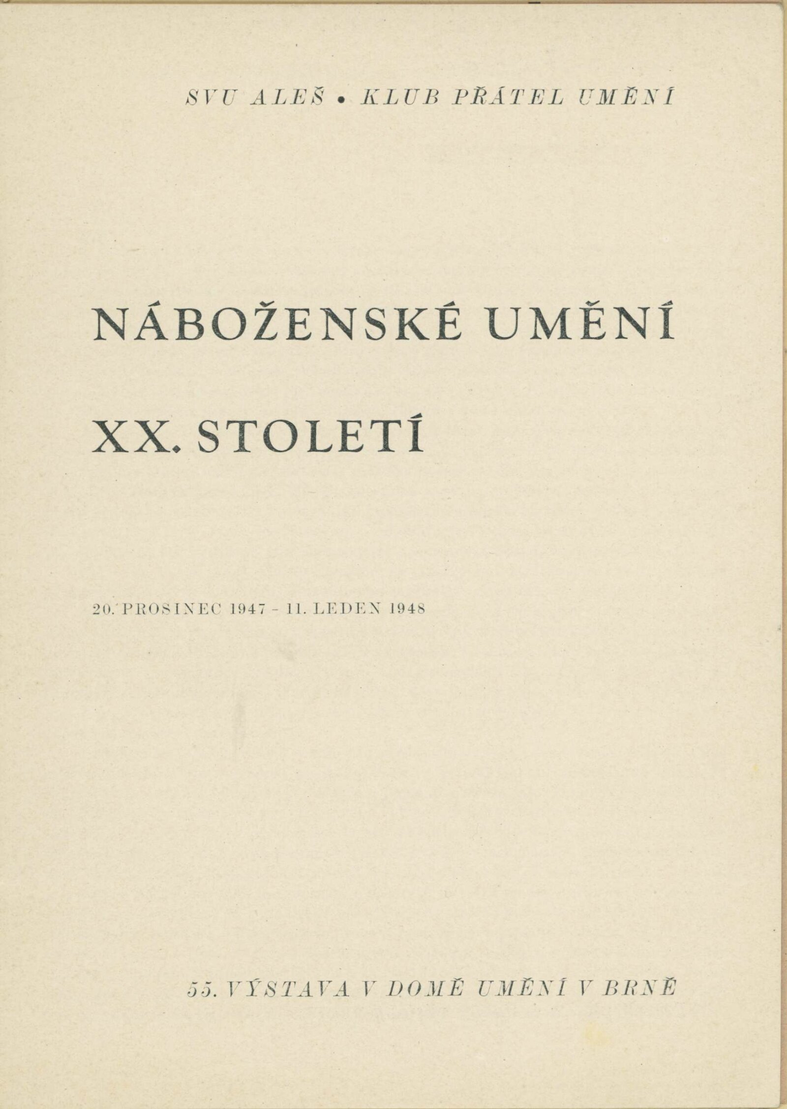 Náboženské umění XX. století. 55. výstava: Dům umění v Brně, 20. 12. 1947 – 11. 1. 1948 / Text: Jan Dokulil. – Brno: SVU Aleš, 1947. – 10 s., DU 56. – MZK; MG; AMB; MMB