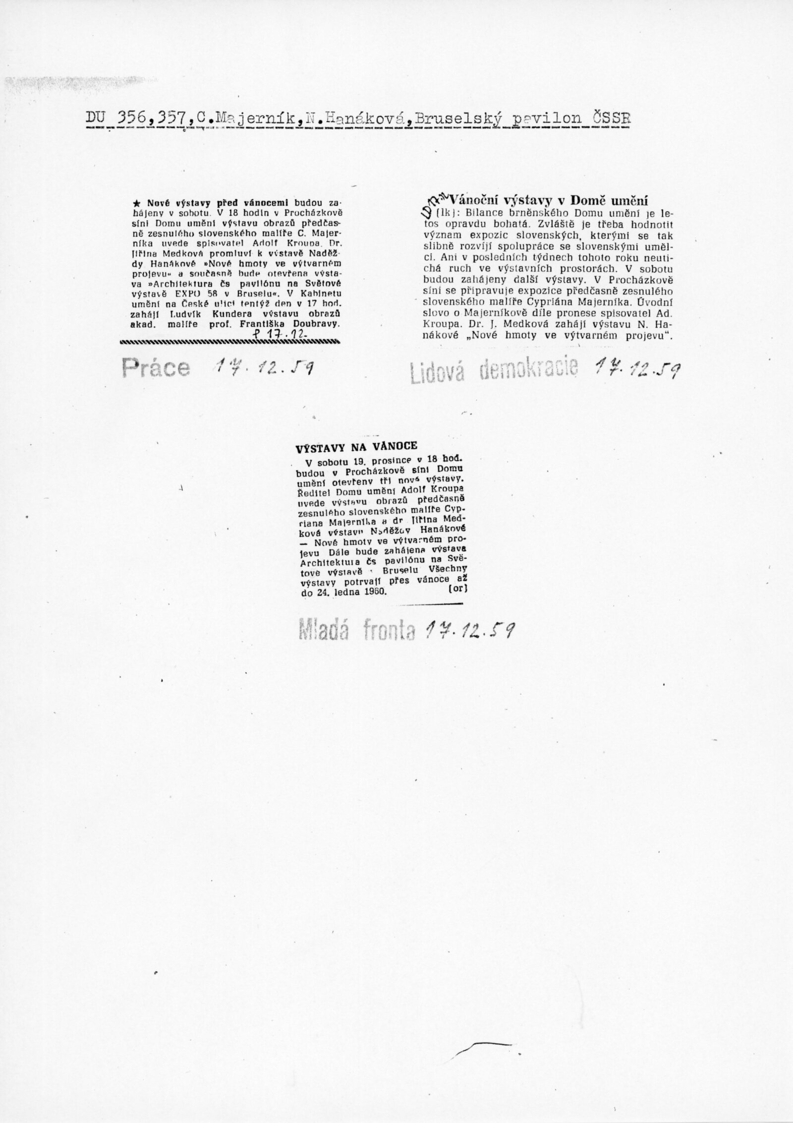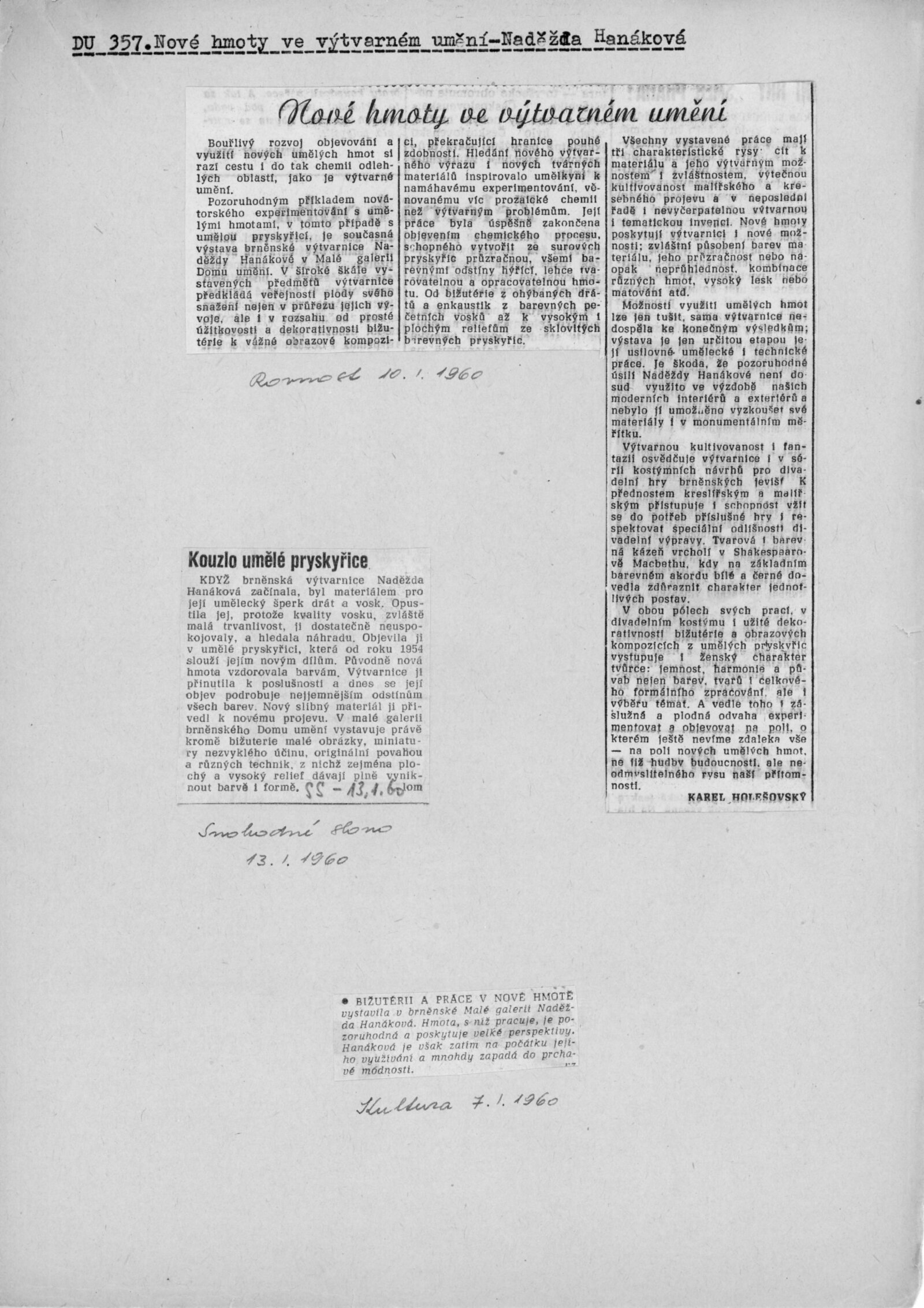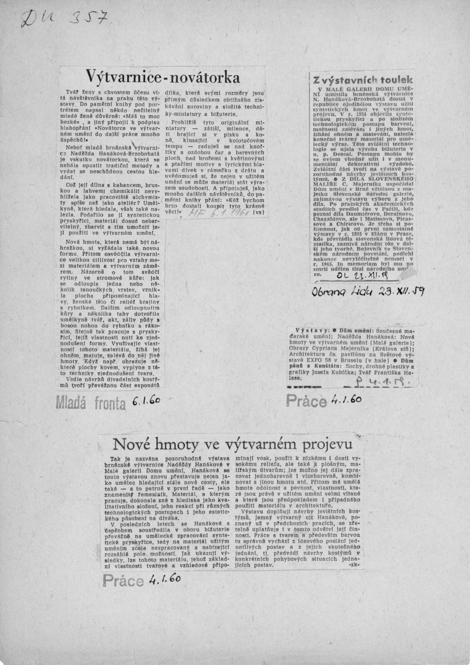 Naděžda Hanáková. Nové hmoty ve výtvarném projevu: Dům umění, Malá galerie, 19. 12. 1959 – 24. 1. 1960 / Text: Jiřina Medková-Lossmannová. – Brno: DUmB, 1959. – 4 s., obr., seznam prací 1 s., DU 357. – MZK; MG; MMB
