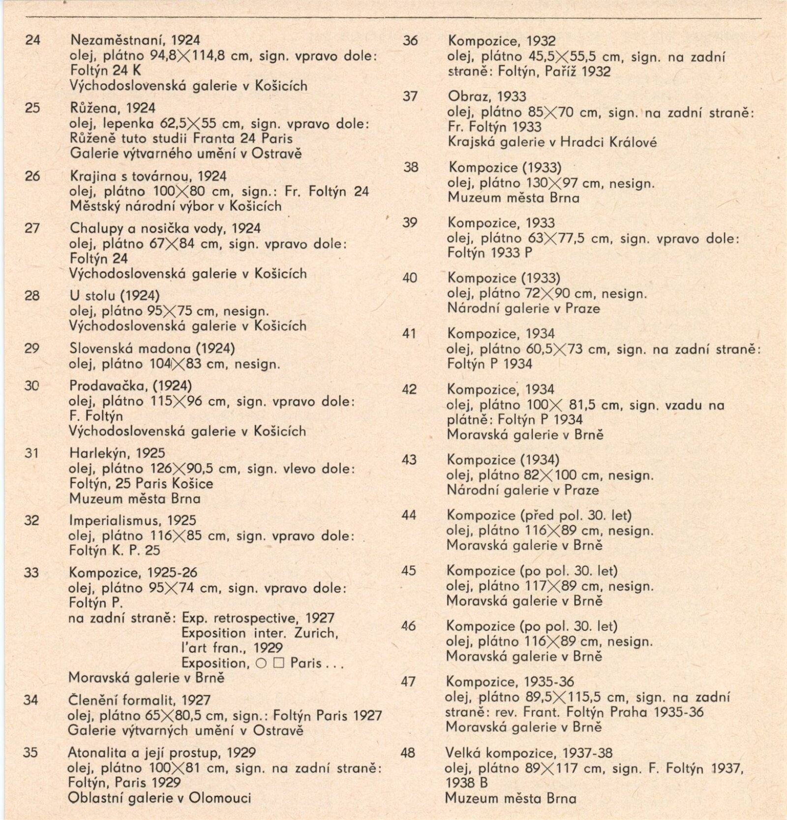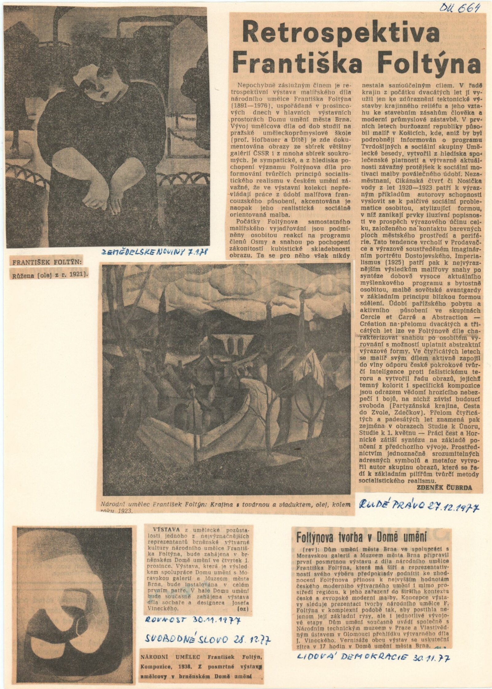 Národní umělec František Foltýn: Dům umění, Brno, 1. 12. 1977 – 8. 1. 1978 / Text: Jiří Hlušička. – Brno: DUmB, 1977. – 28 s., obr., seznam vystavených malířských děl 4 s., životopisné údaje, výstavy, zastoupení ve sbírkách, bibliografie, DU 664. – MZK; MMB
