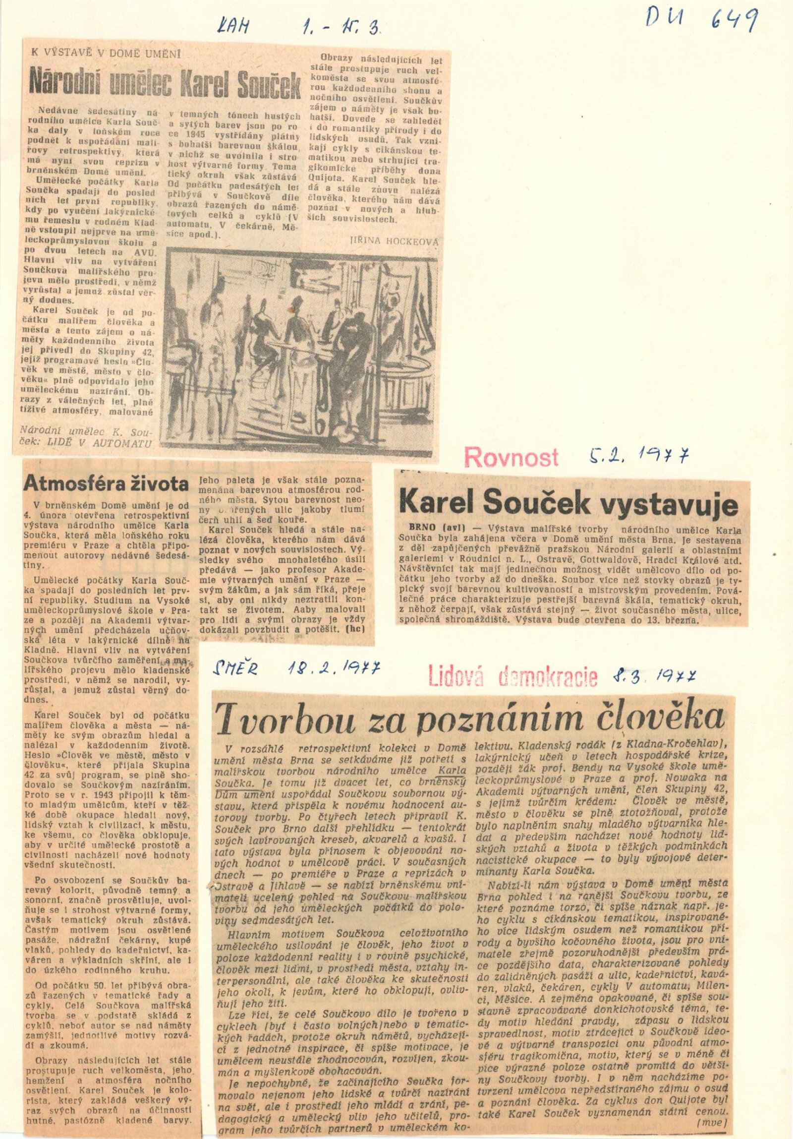 Národní umělec Karel Souček: Dům umění města Brna, 4. 2. – 13. 3. 1977 / Převzatý katalog Národní umělec Karel Souček. Výběr z díla: Výtvarná síň Mánes, Praha, retrospektivní část ve Sbírce moderního umění Národní galerie, červen–červenec 1976 / Text: Jiří Kotalík. – Praha: SČVU, 1976. – 32 s., obr., seznam vystavených děl 4 s., DU 649. – MG