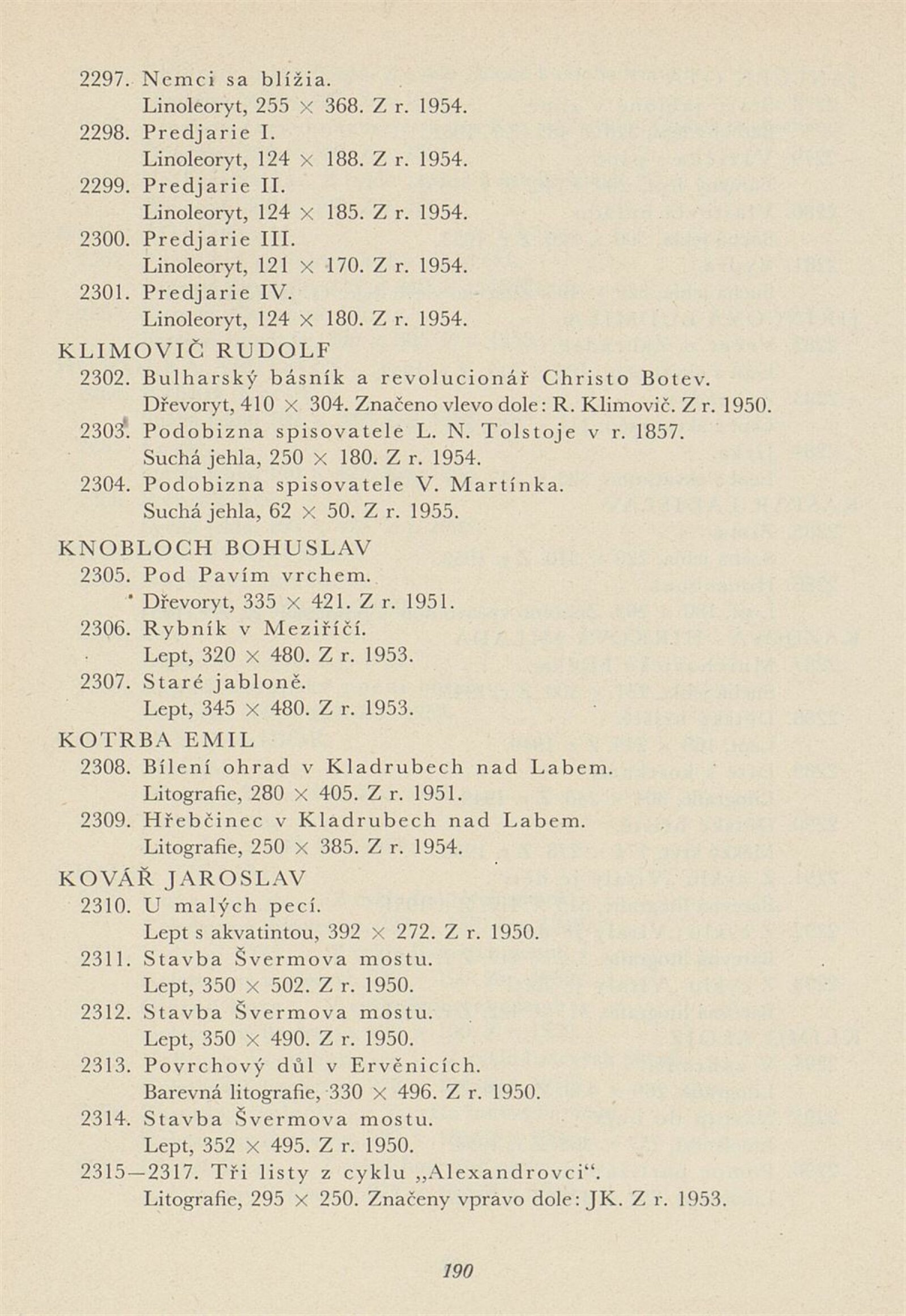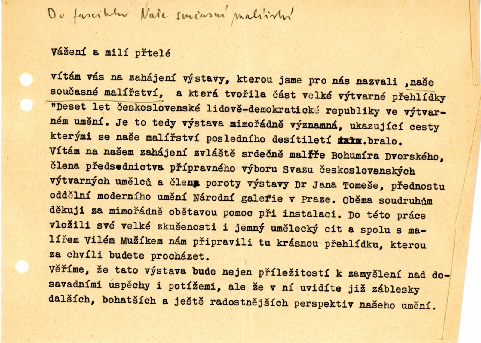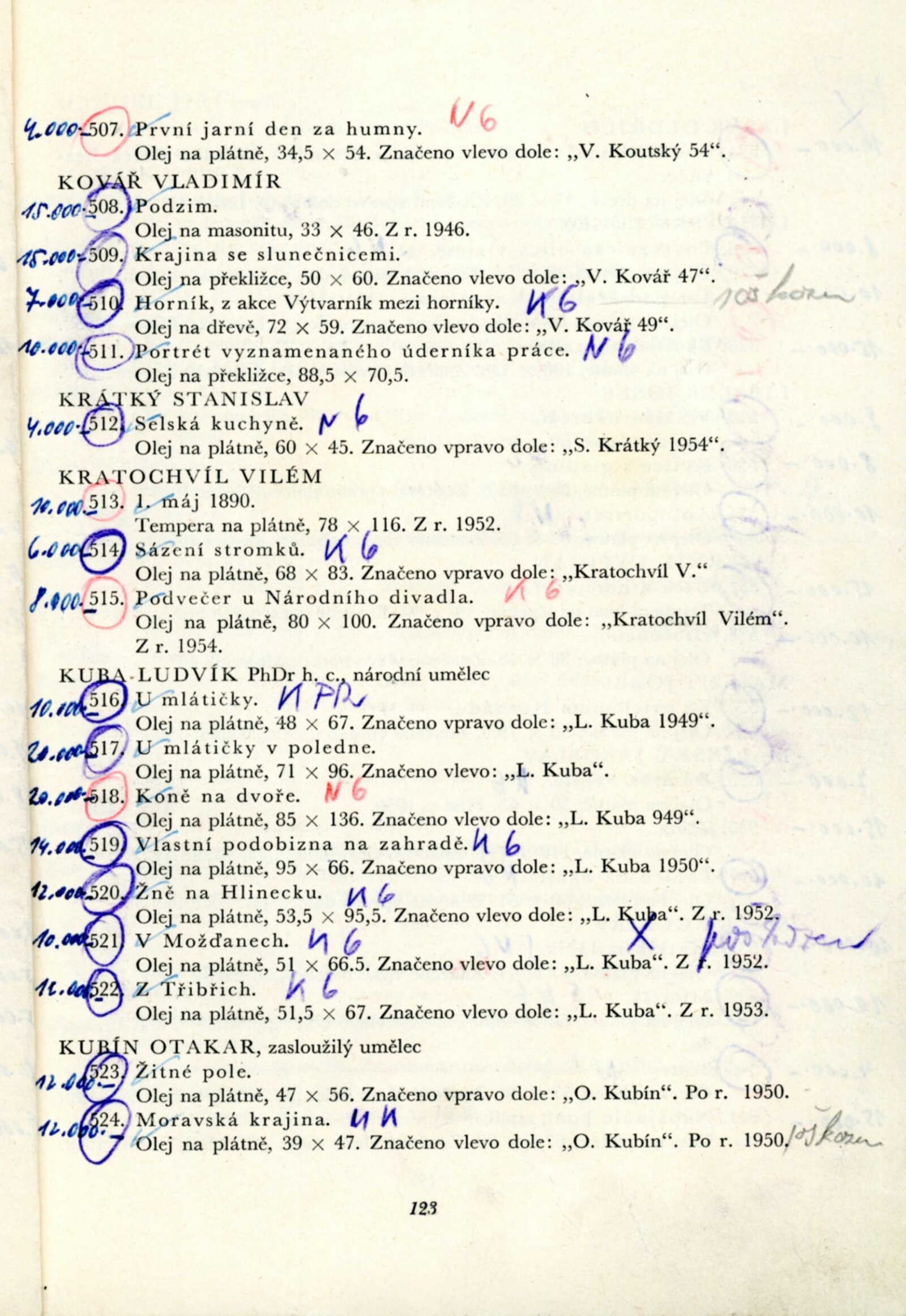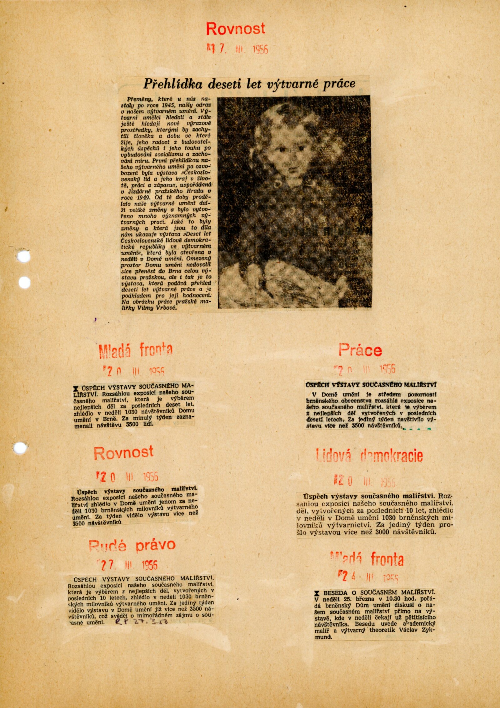 Naše současné malířství: Dům umění, 11. 3. – 8. 4. 1956 / Součást expozice pražské výstavy. 10 let Československé lidově demokratické republiky ve výtvarném umění: Sbírka moderního umění Národní galerie, Jízdárna pražského hradu, Slovanský ostrov, Grafická sbírka Národní galerie a Mánes, prosinec 1955 – únor 1956 / Texty: Václav Formánek, Jiří Kotalík, Jan Tomeš, Vladimír Diviš, Karol Vaculík. – Praha: ÚSČSVU, 1955. – 25 s., 85 s. obr. příl., DU 243. – MZK