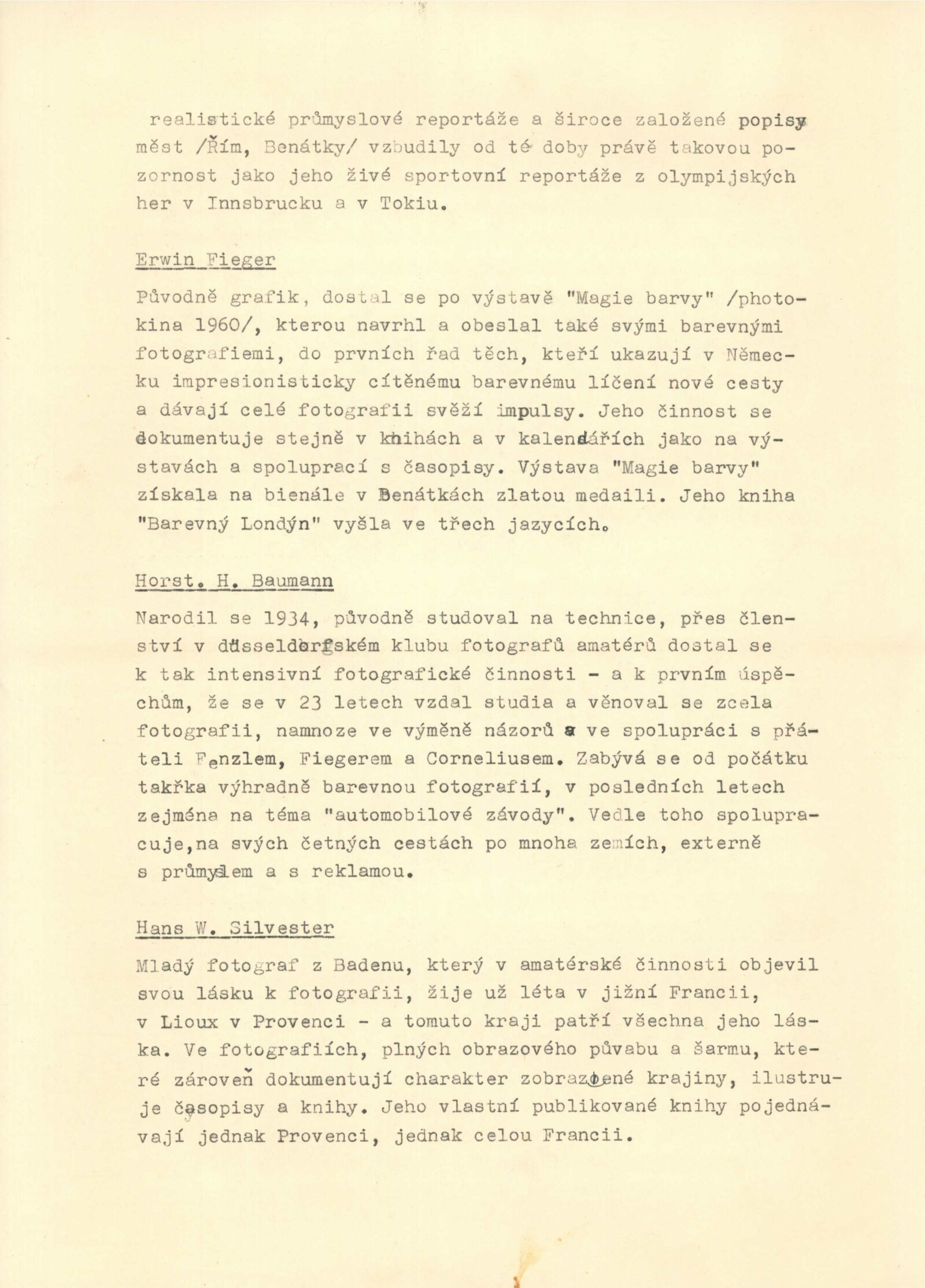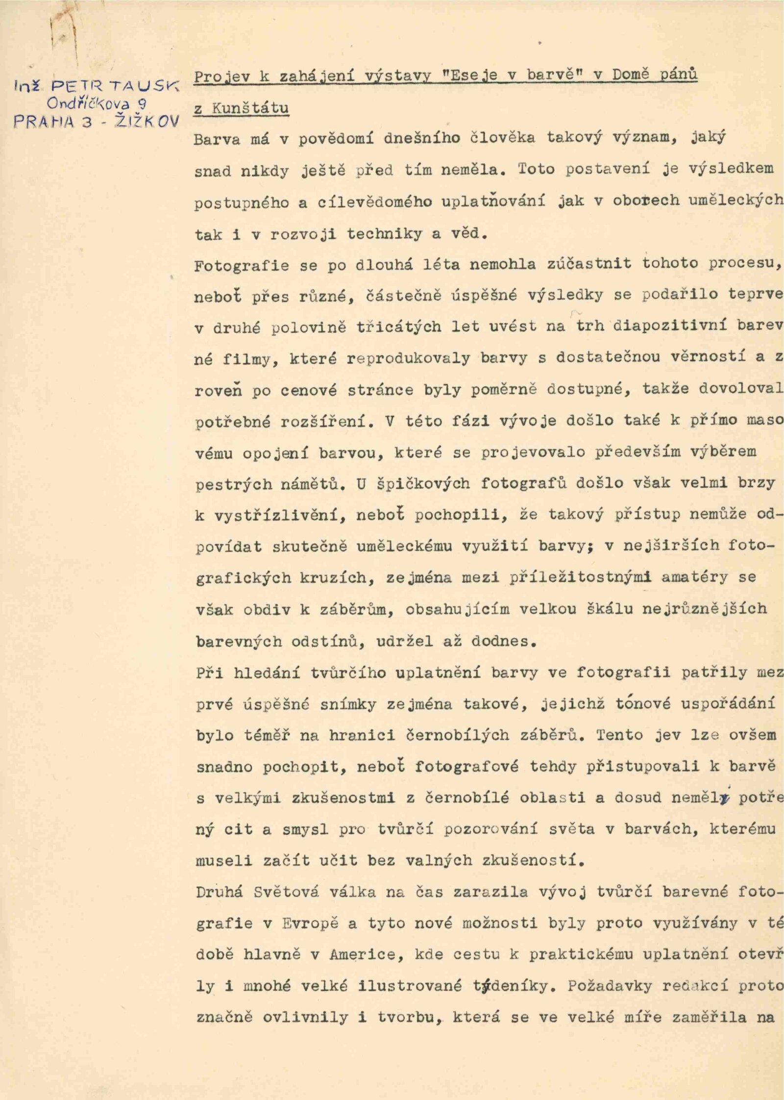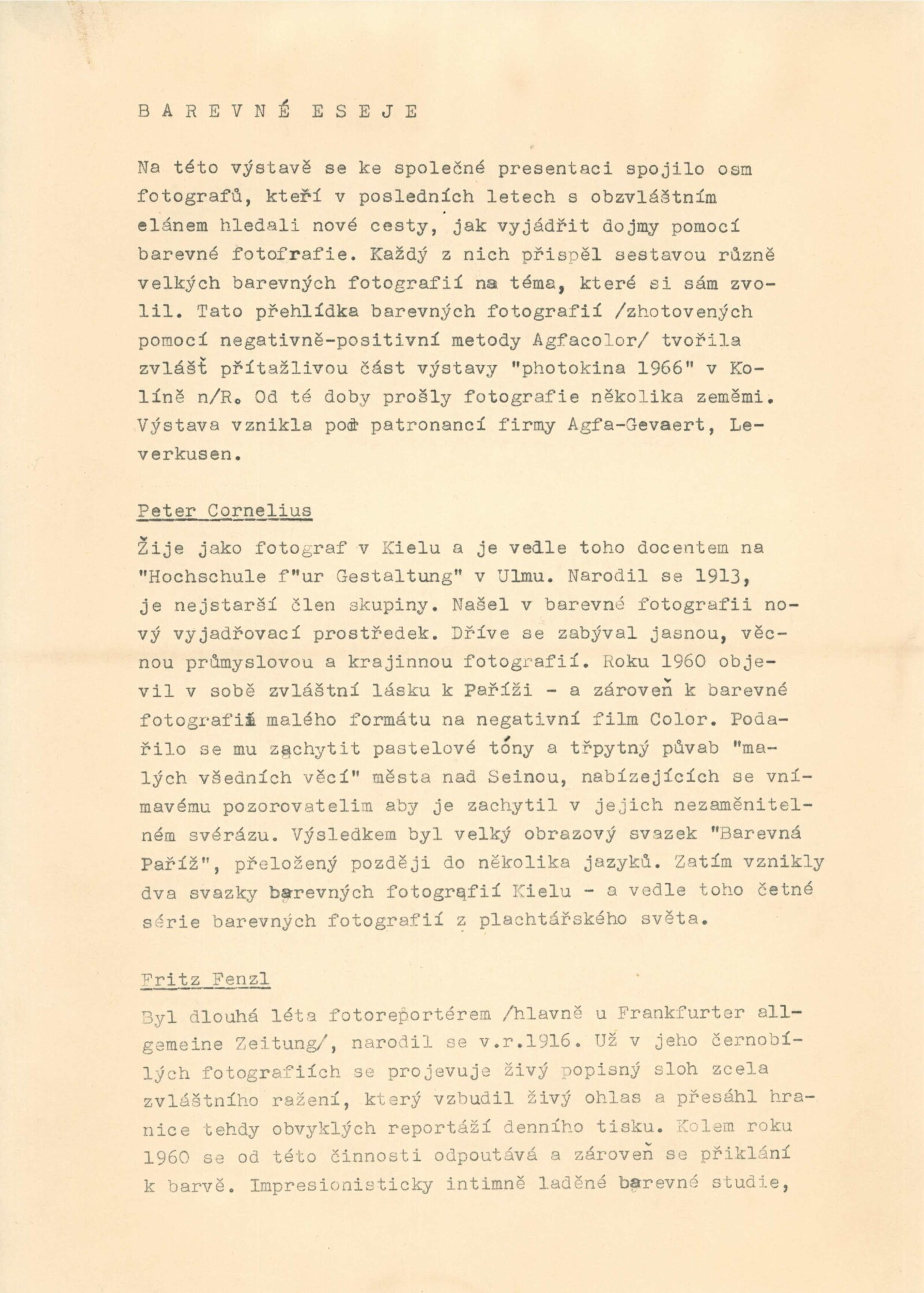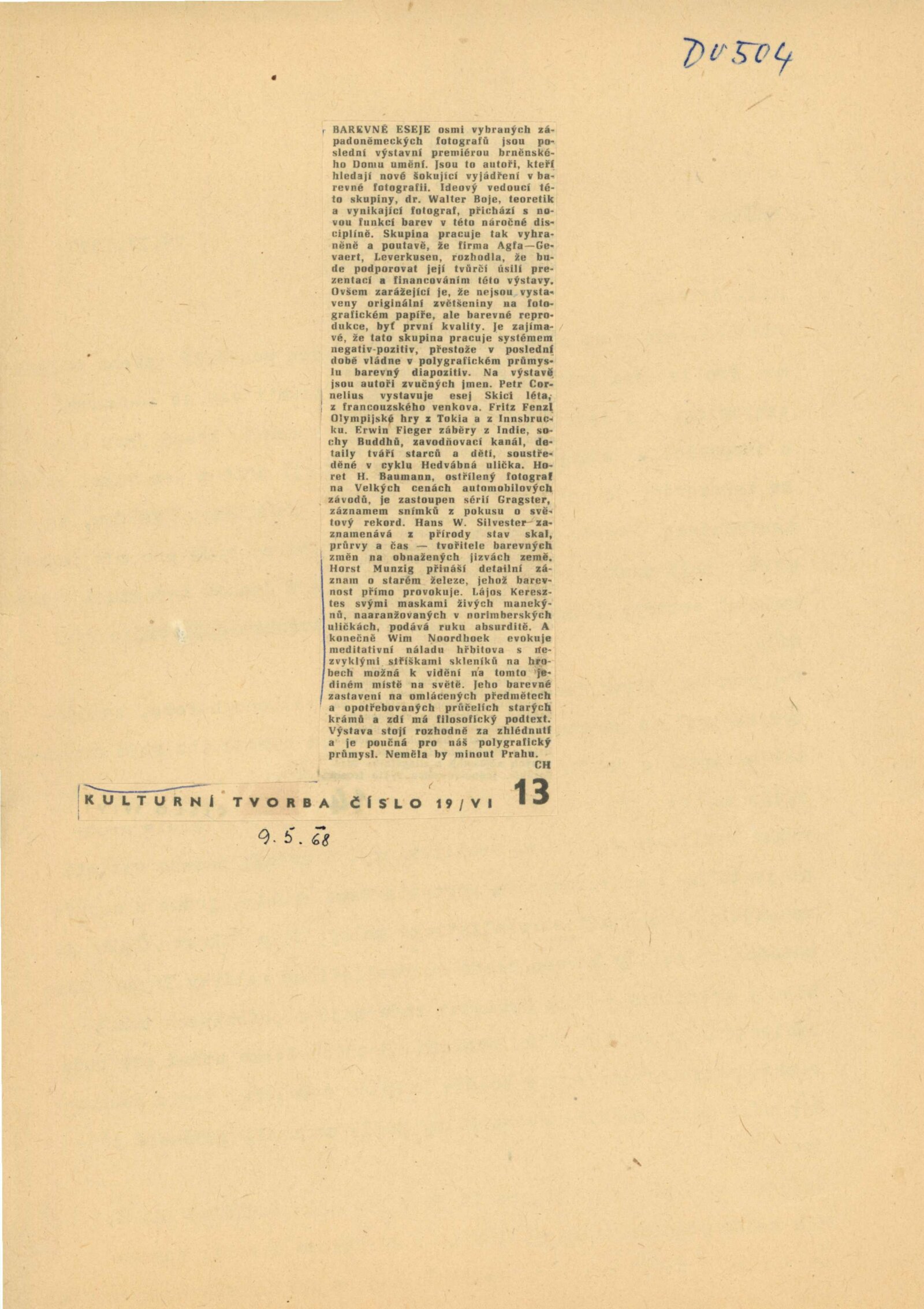 pozvánka, projev na vernisáži (P. Tausek), program DU duben 1968, seznam fotografů s krátkými medailony (NJ, ČJ), soupis výstavních panelů, korespondence (o přípravě výstavy – P. Tausk, Dr. Boje /Agfa/ DU a dalších reprízách, provozní korespondence), recenze v tisku
