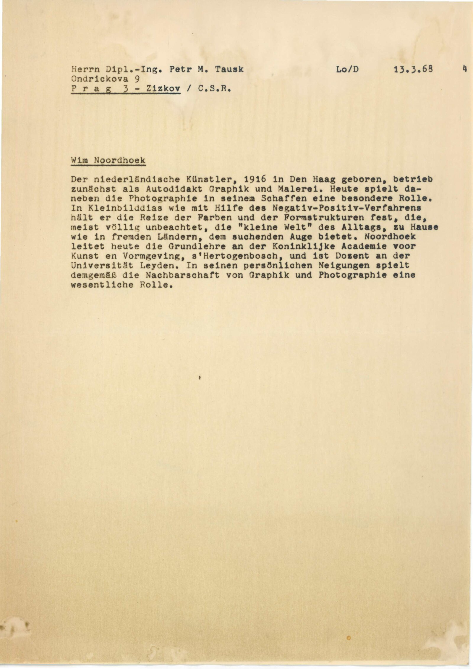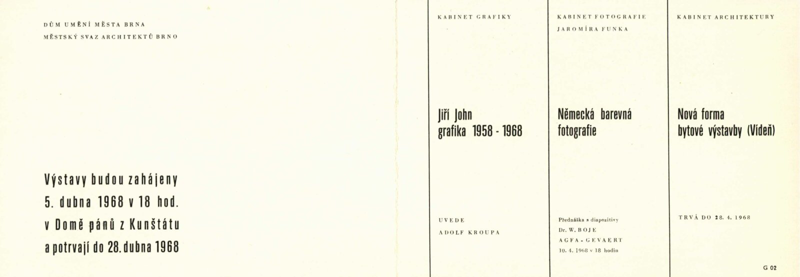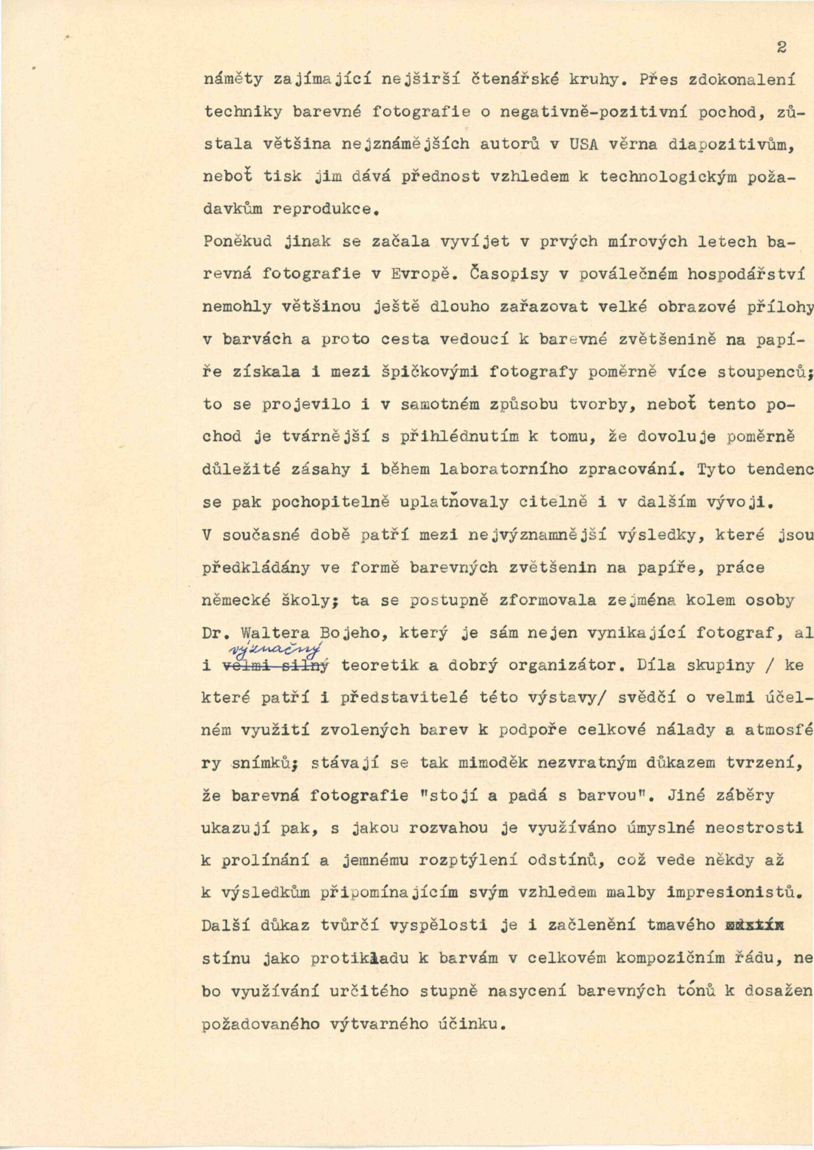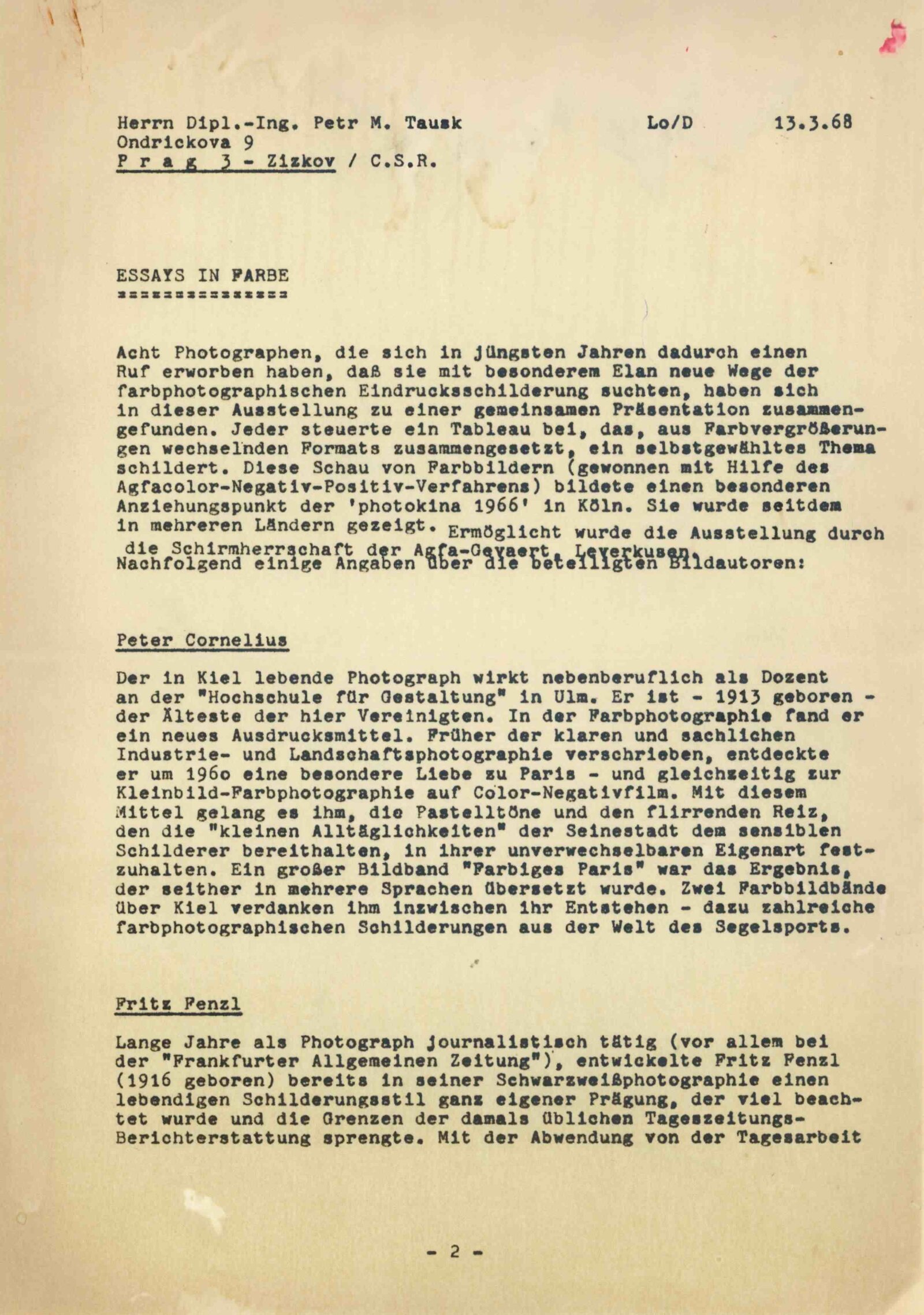pozvánka, projev na vernisáži (P. Tausek), program DU duben 1968, seznam fotografů s krátkými medailony (NJ, ČJ), soupis výstavních panelů, korespondence (o přípravě výstavy – P. Tausk, Dr. Boje /Agfa/ DU a dalších reprízách, provozní korespondence), recenze v tisku
