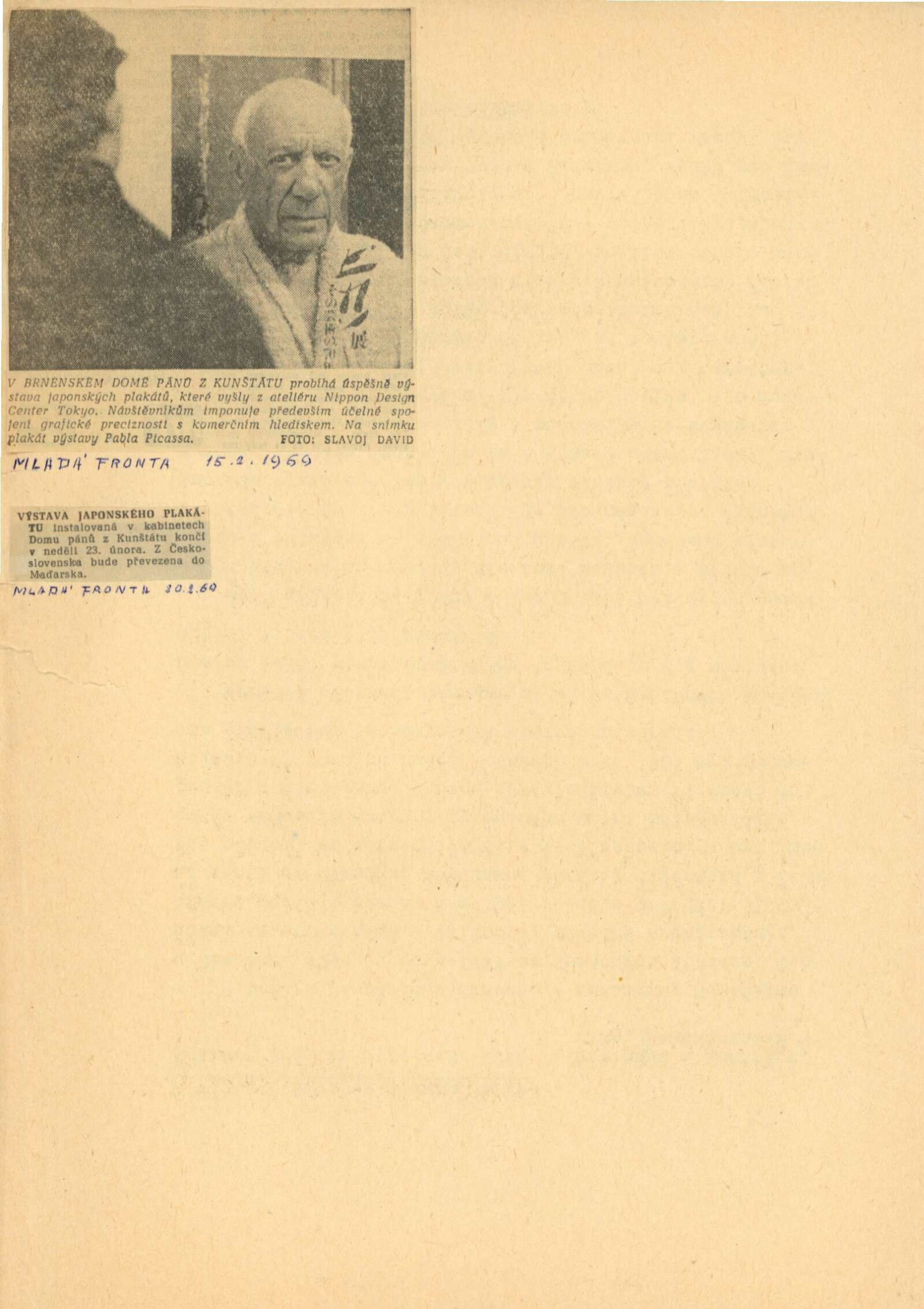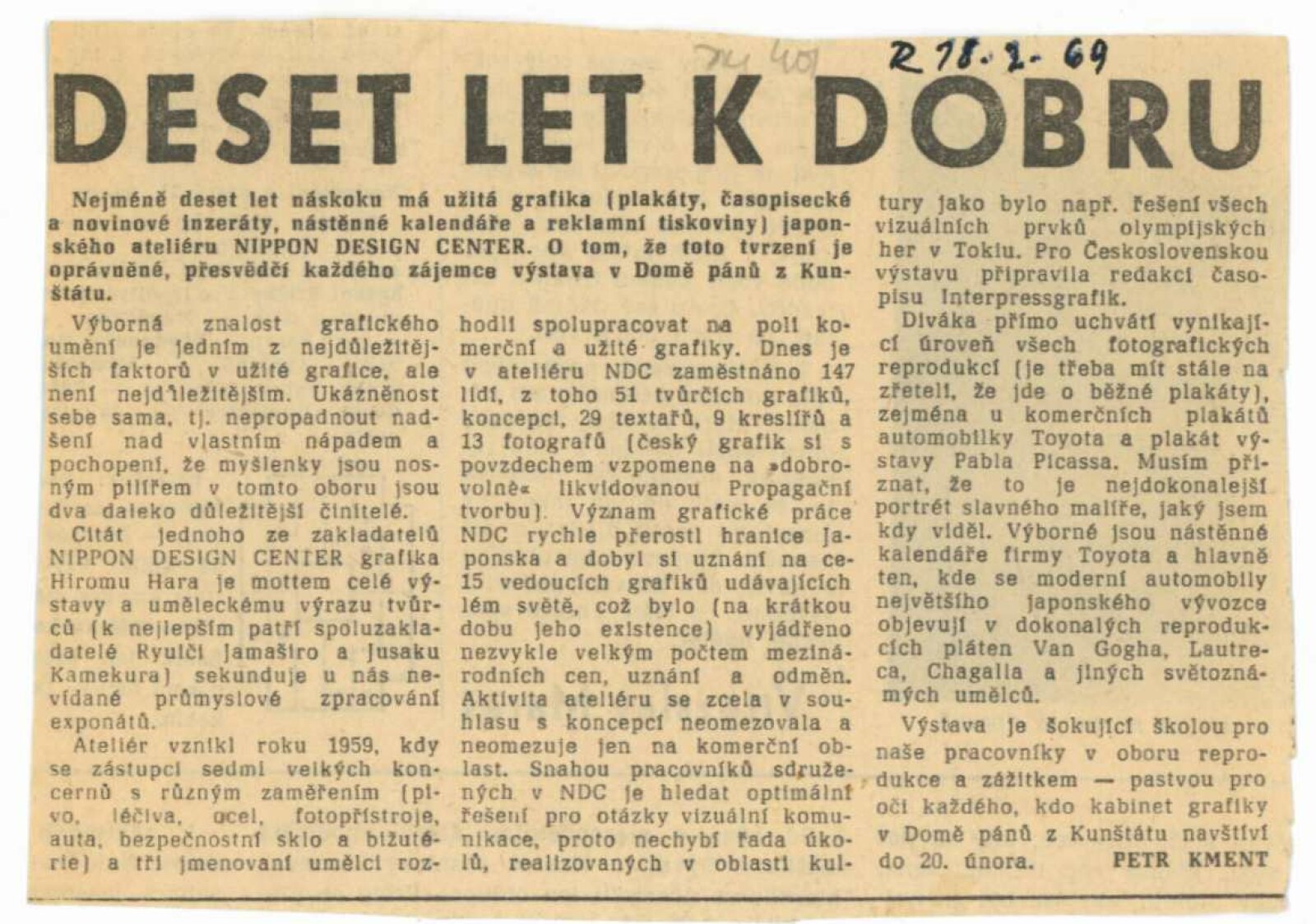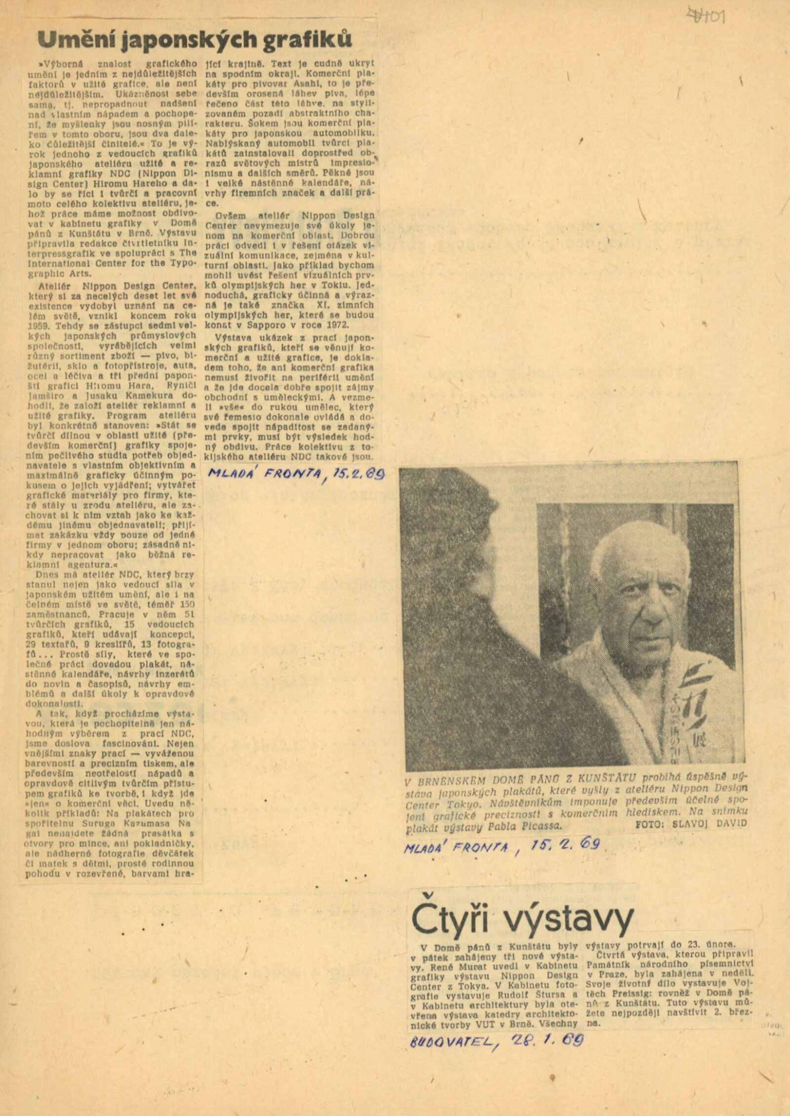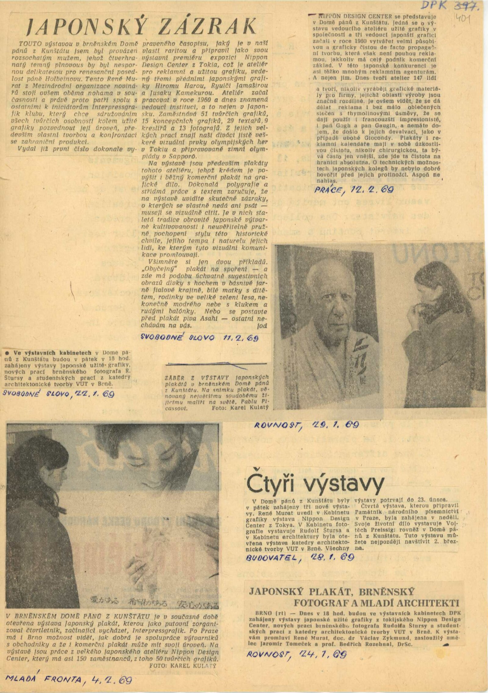 Nippon Design Center Tokyo: Dům umění města Brna / Dům pánů z Kunštátu, Kabinet grafiky, 24. 1. – 23. 2. 1969 / Převzatý katalog. Nippon Design Center Tokyo Ateliér užité grafiky: Praha 1968 / Text: redakce Interpressgrafik. – Praha: IPGC+ICTA, 1968. – 2 s., obr., DPK 401. – MG: Portrét, životní data, seznam výstav, DU 515. – MZK; MG; MMB