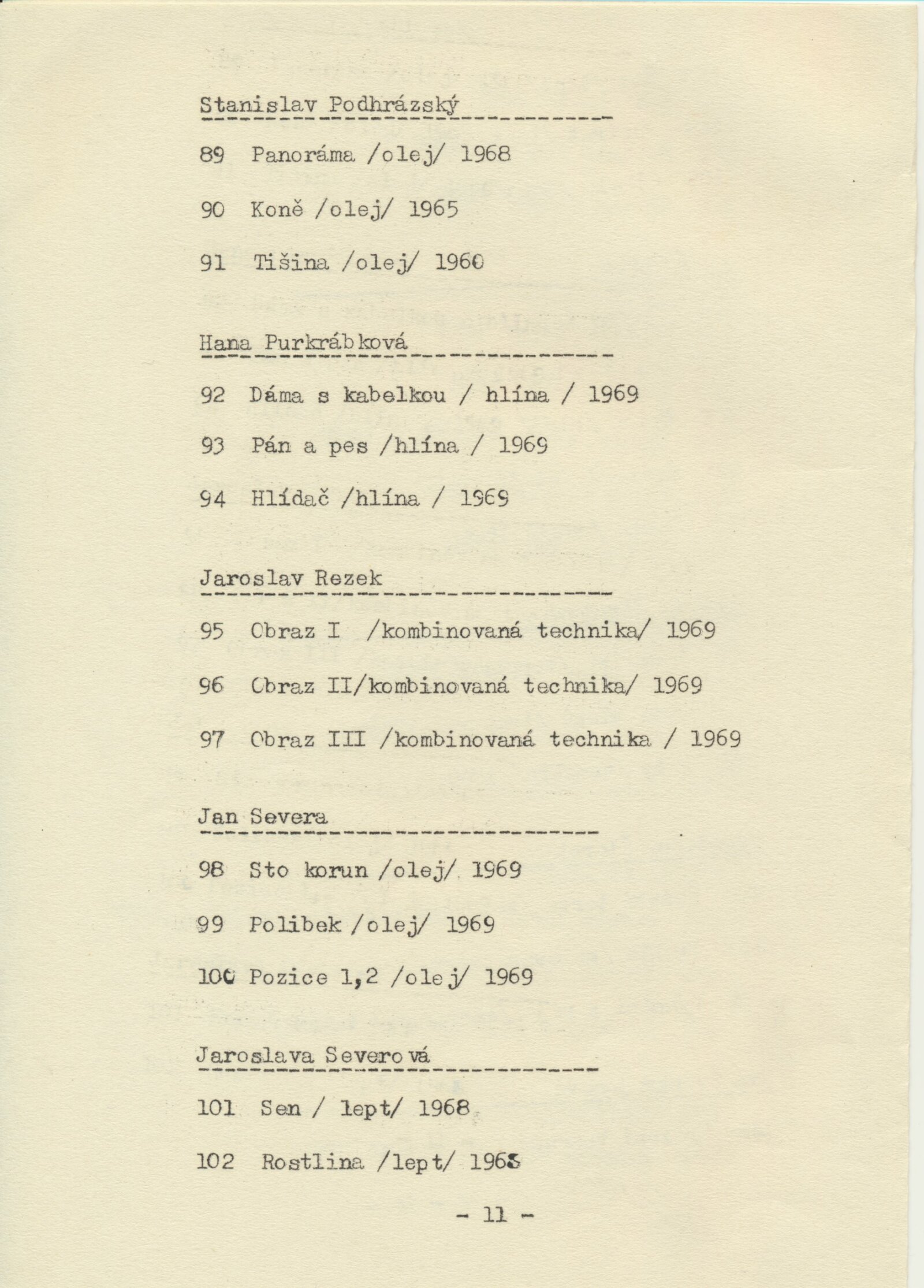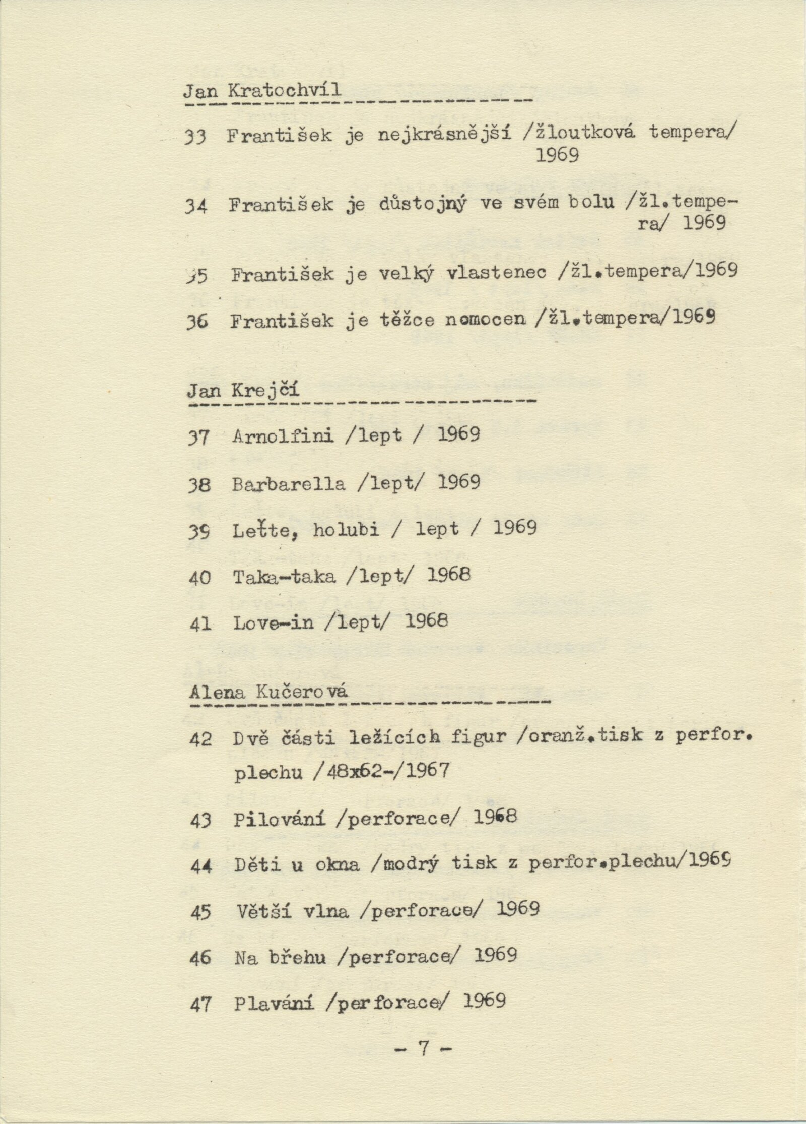 katalog, strojopis textu ke katalogu, anotace k výstavě, seznam vystavených děl s pojistnými cenami, dopis SČVU – podmínky realizace výstavy v Domě umění, korespondence k přípravě výstavy, plán instalace výstavy, provozní korespondence (poškozená plastika: Petr Oriešek) zápisy o převzetí výstavy, hlášení škody na exponátech (25. 2. 1970), reverzy, recenze v tisku, katalog a pozvánka (Praha Mánes, 1969)