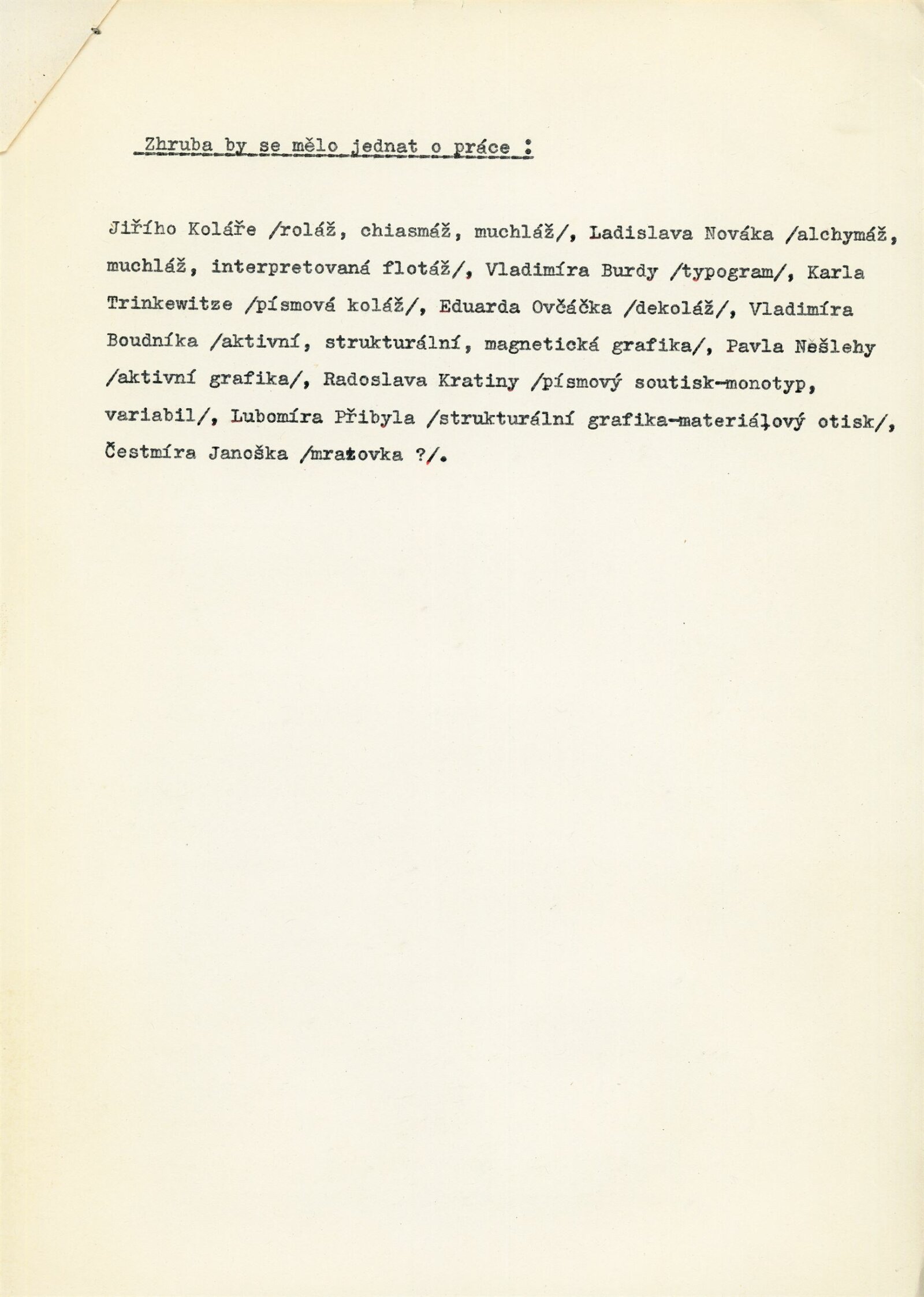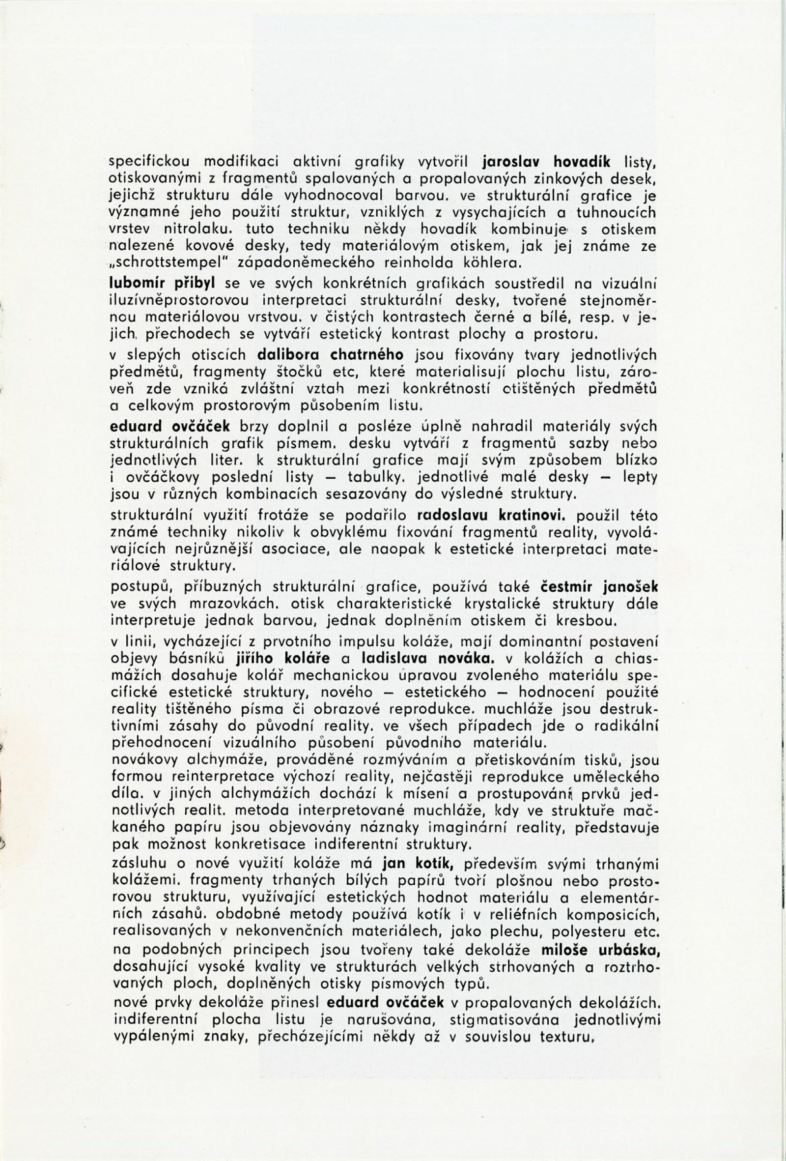 Nové výtvarné postupy: Dům umění města Brna, hala, 11. 5. – 11. 6. 1967 / Text: Jiří Valoch. – Brno: DUmB, 1967. – 9 s., obr., DU 485. – MZK; MG