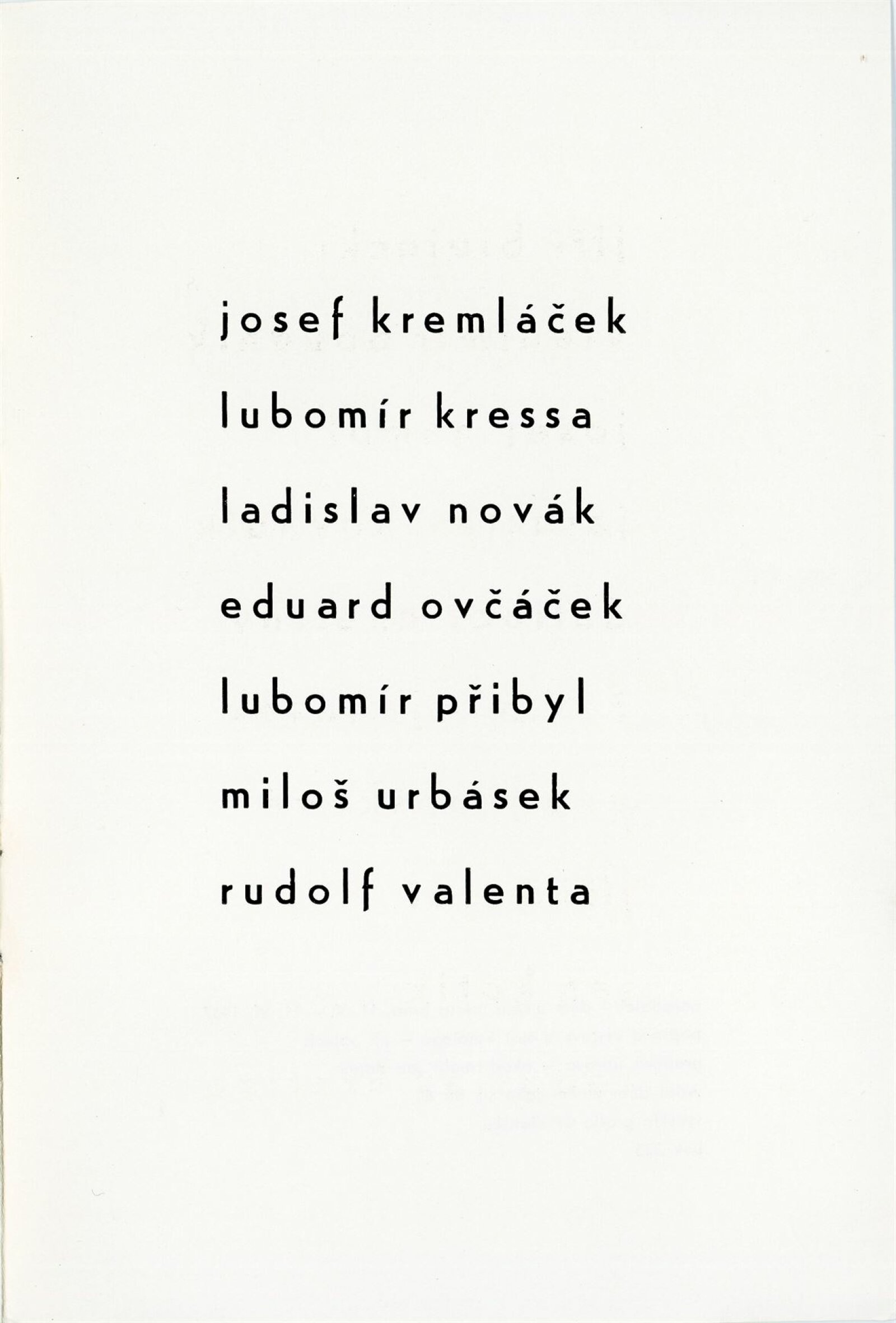 Jiří Bielecki, Vladimír Boudník, Josef Hampl, Jaroslav Hovadík, Dalibor Chatrný, Čestmír Janošek, Eva Janošková, Jiří Kolář, Jan Kotík, Radoslav Kratina, Josef Kremláček, Lubomír Kressa, Ladislav Novák, Eduard Ovčáček, Lubomír Přibyl, Miloš Urbásek, Rudolf Valenta