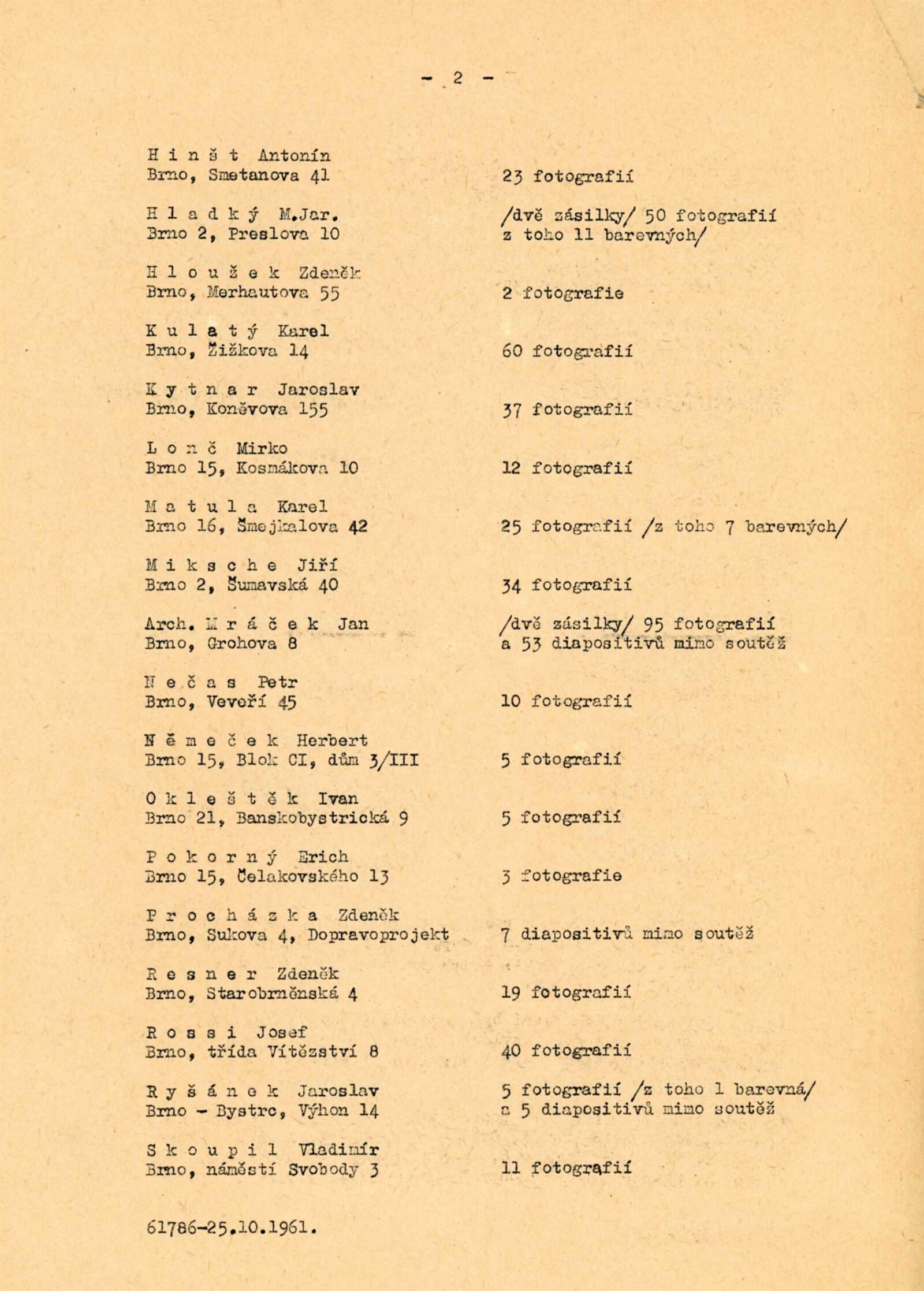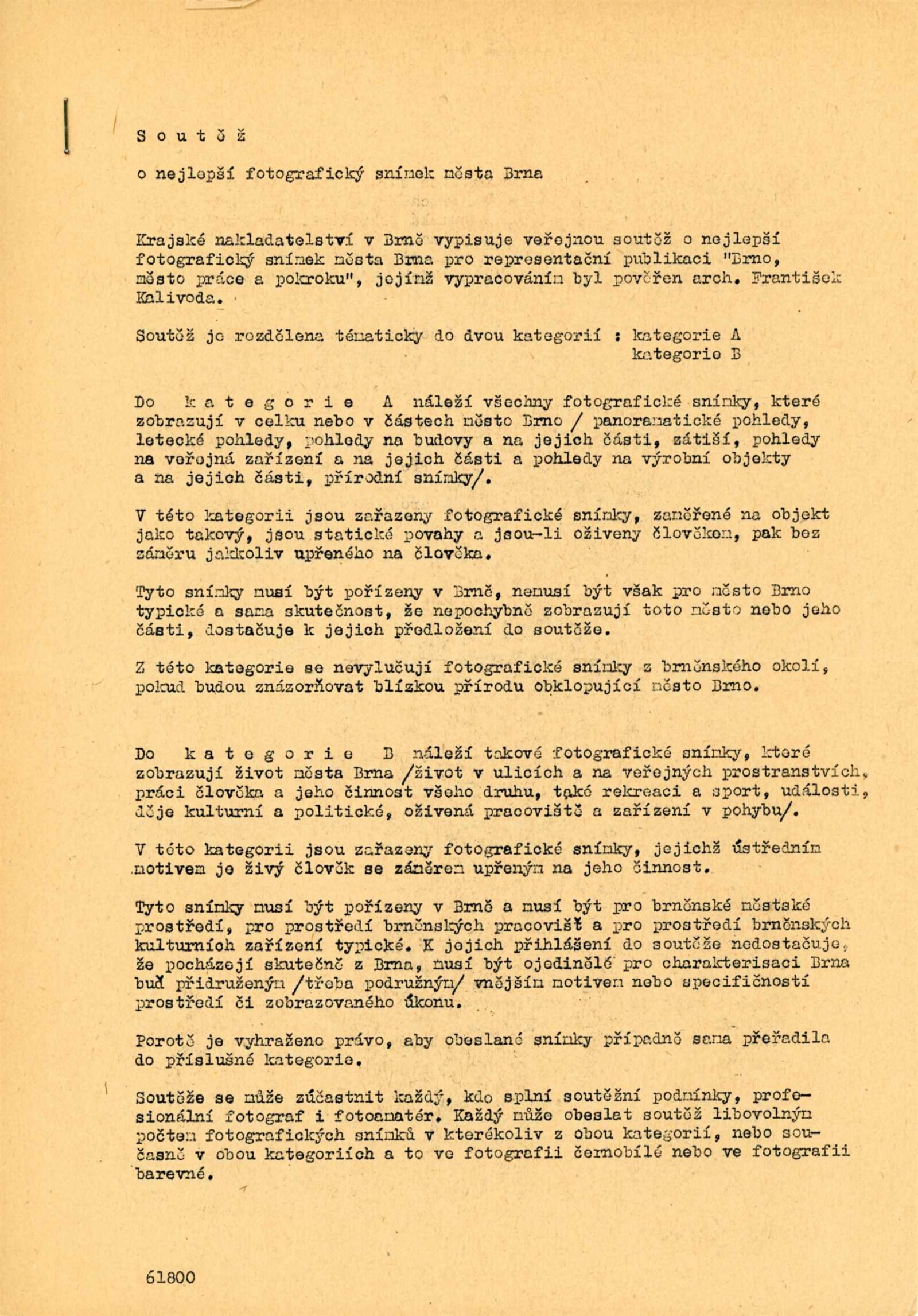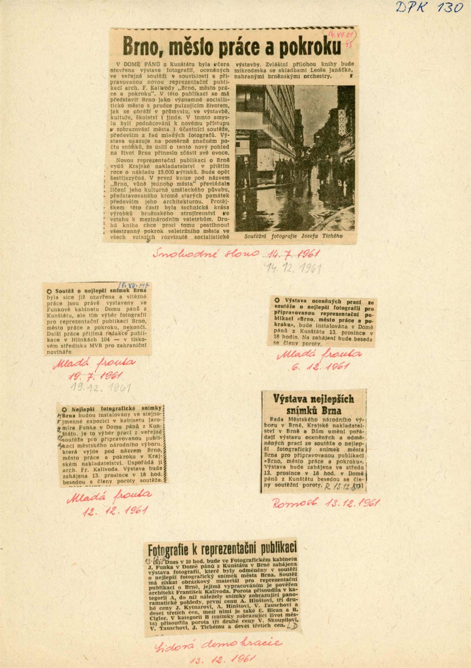 O nejlepší fotografický snímek města Brna: Dům umění města Brna / Dům pánů z Kunštátu, 27. výstava Kabinetu fotografie Jaromíra Funka, 13. 12. 1961 – 1. 1. 1962 / Katalog nebyl vydán. – pozvánka se zprávou o výsledku soutěže, 4 s., obr., DPK 130. – MZK; MG