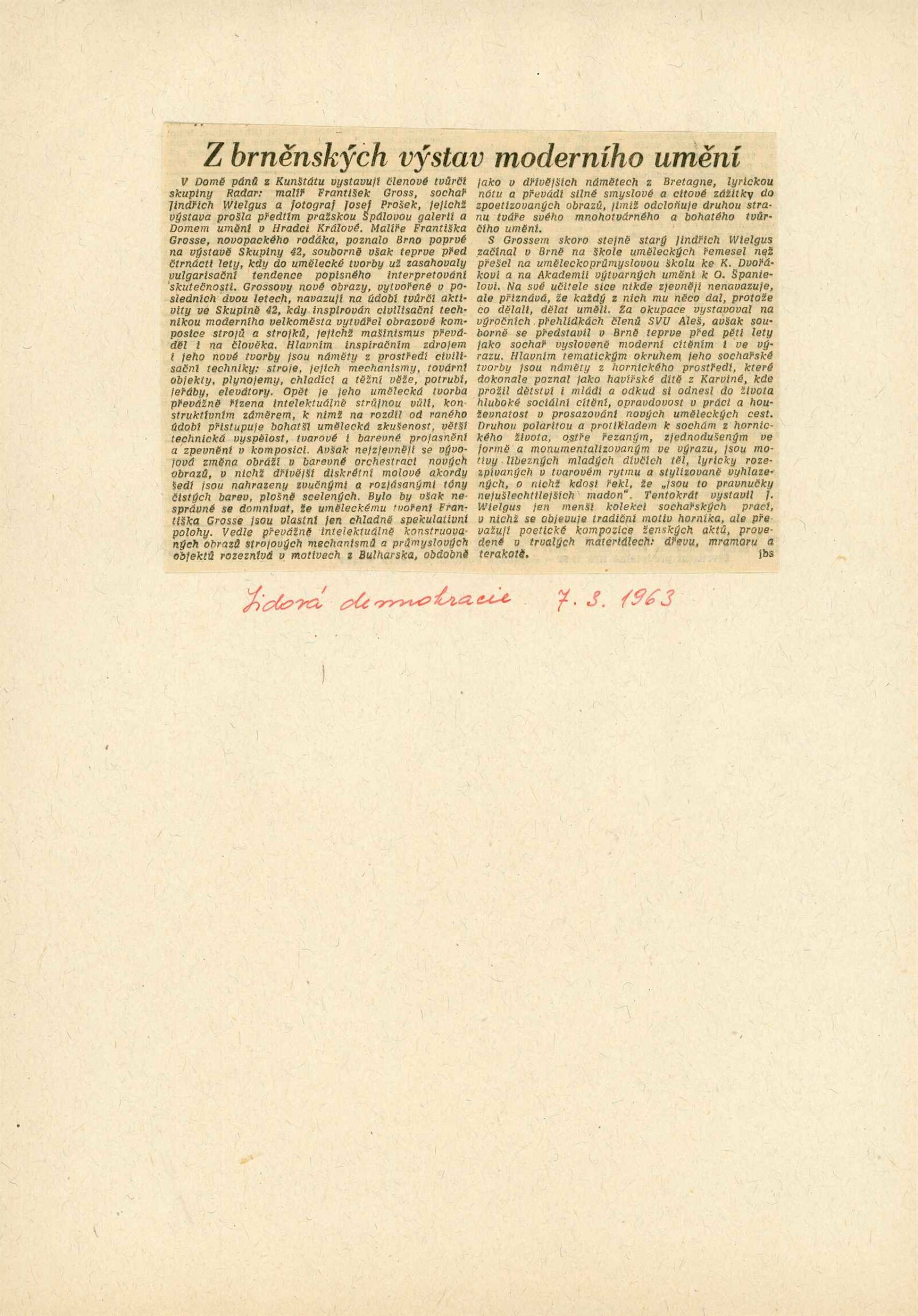 Obrazy Františka Grosse, fotografie Josefa Proška, sochy Jindřicha Wielguse: Dům umění města Brna / Dům pánů z Kunštátu, 1. patro, 10. 2. – 10. 3. 1963 / Převzatý katalog. František Gross. Obrazy. Josef Prošek. Fotografie. Jindřich Wielgus. Sochy: Galerie Václava Špály, Praha, 12. 10. – 11. 11. 1962 / Text: Jan Řezáč. – Praha: ČFVU, 1962. – 20 s., obr., portrét, životní data, DPK 178. – MZK; MG