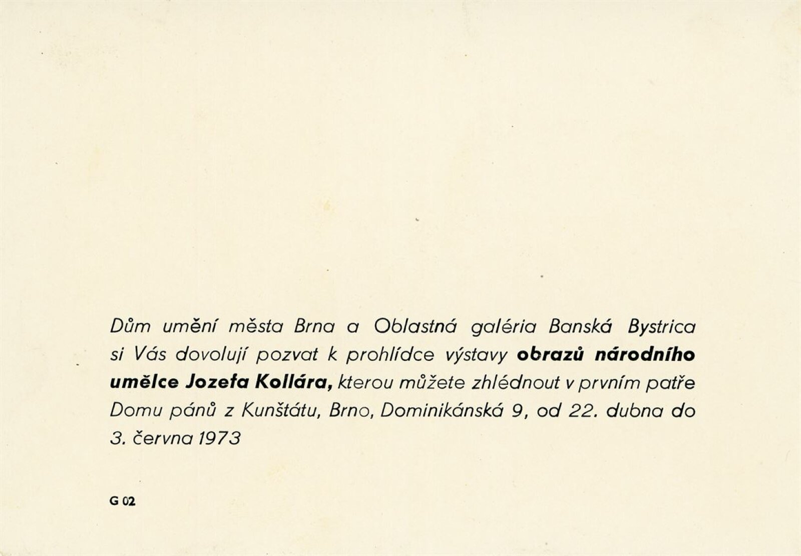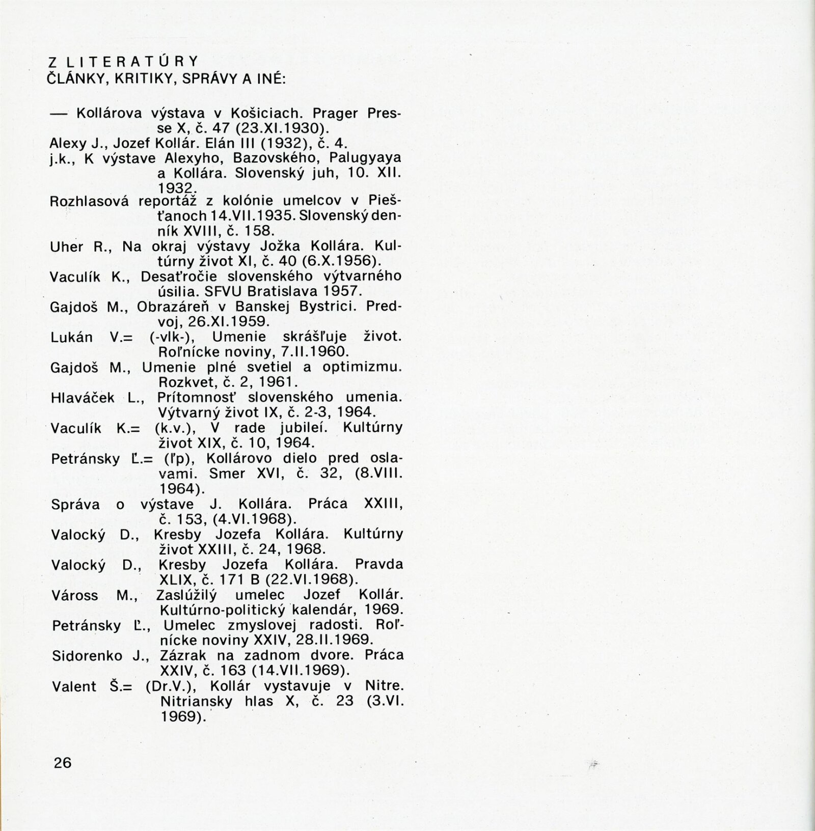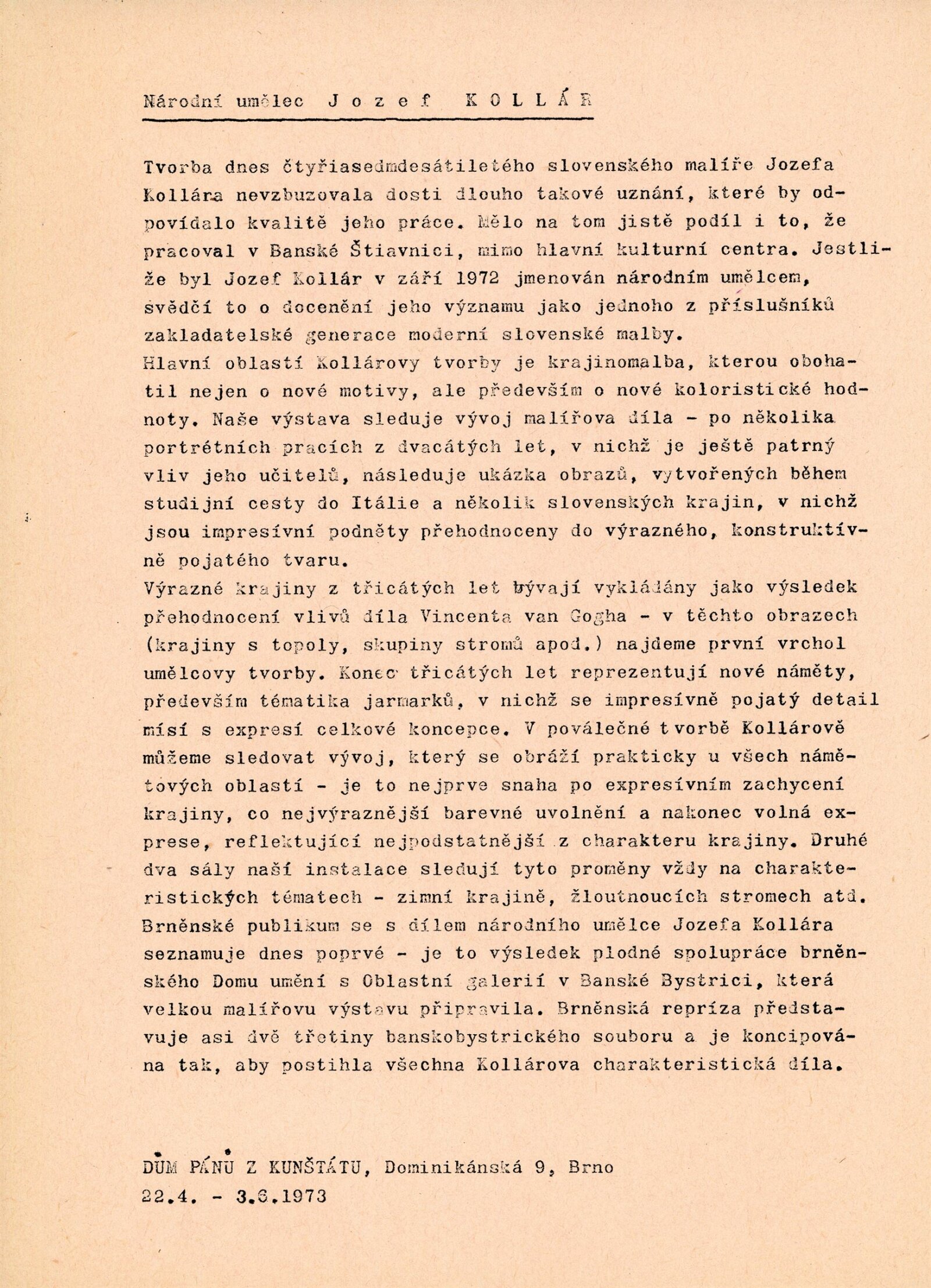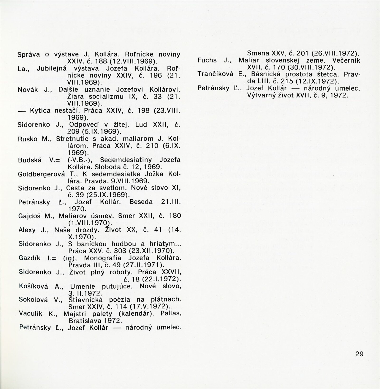 Obrazy národního umělce Jozefa Kollára: Dům umění / Dům pánů z Kunštátu, 22. 4. – 3. 6. 1973 / Převzatý katalog. Jozef Kollár. Súborné dielo: Oblastná galéria Banská Bystrica, únor–březen 1973 / Text Ľudo Petránsky. – Banská Bystrica: Oblastná galéria, 1973. – 32 s., 6 l., obr., 118 s. obr. příl., životní data, výstavy, bibliografie, DPK 537