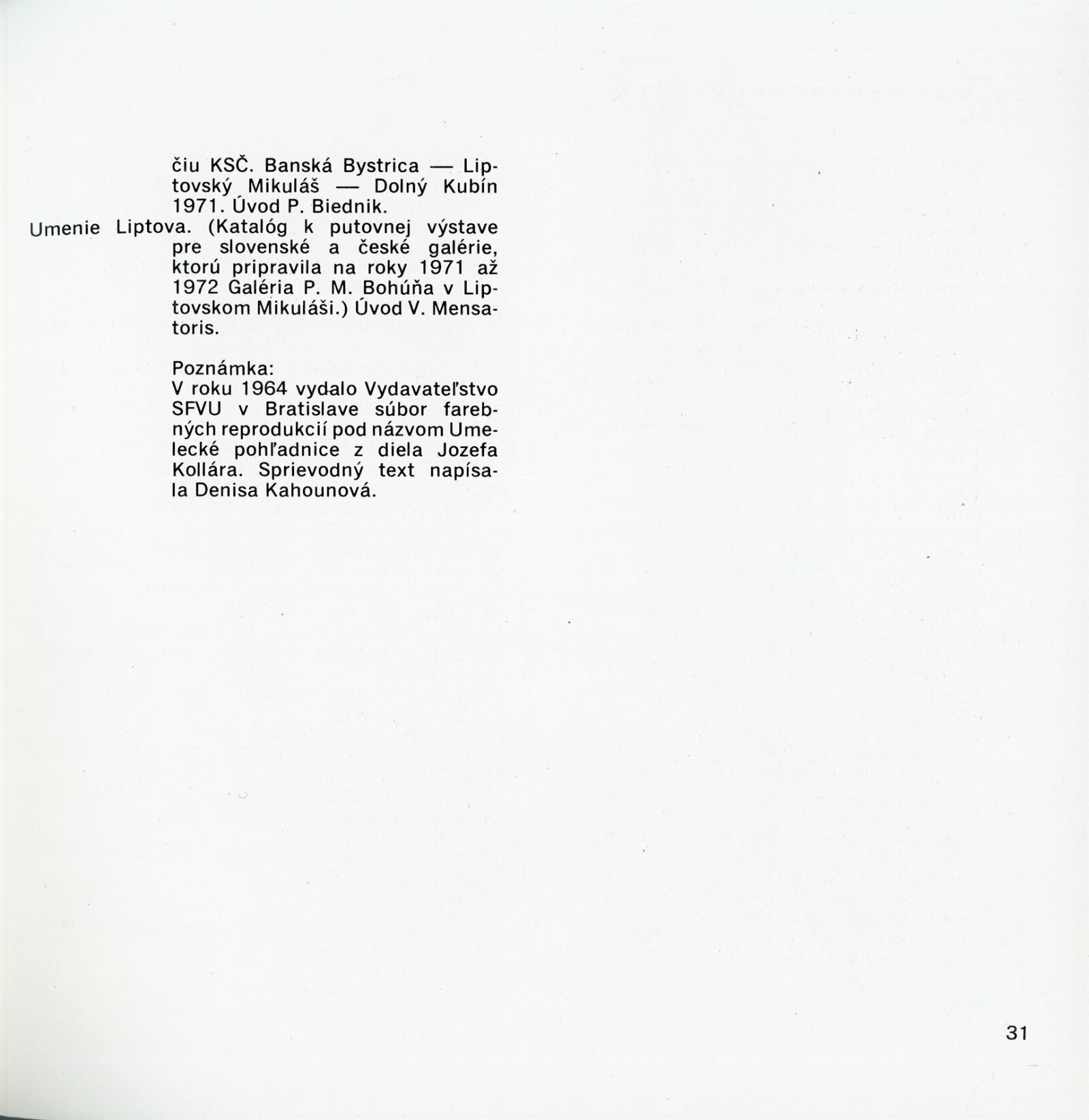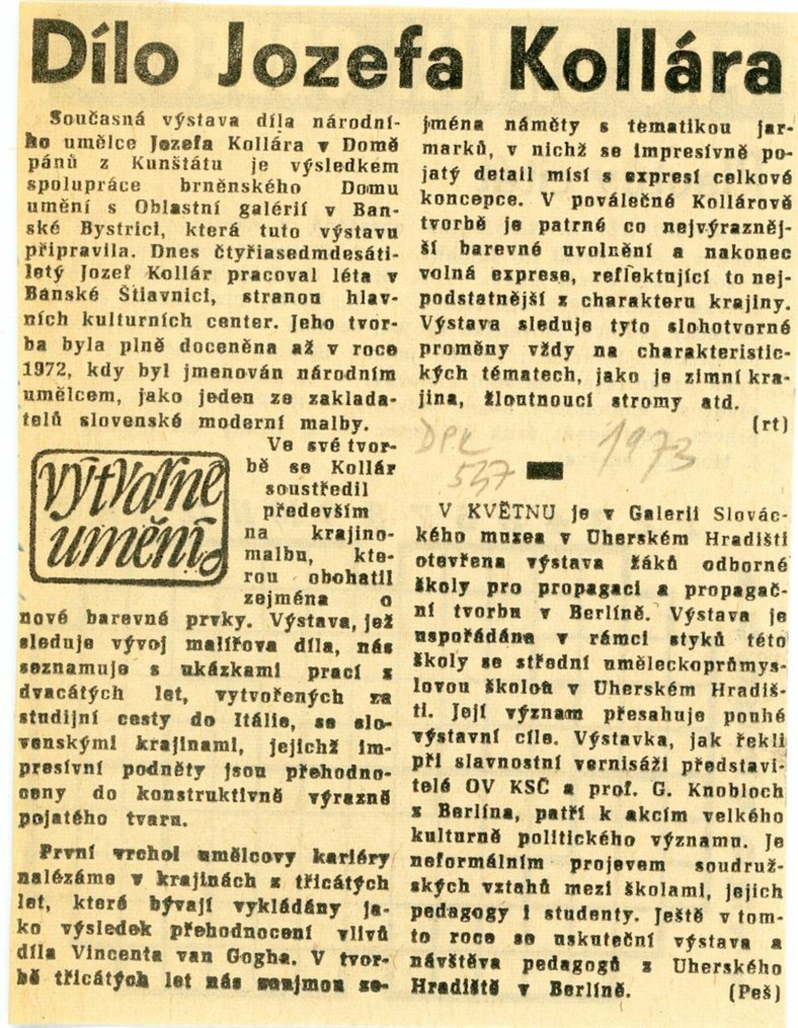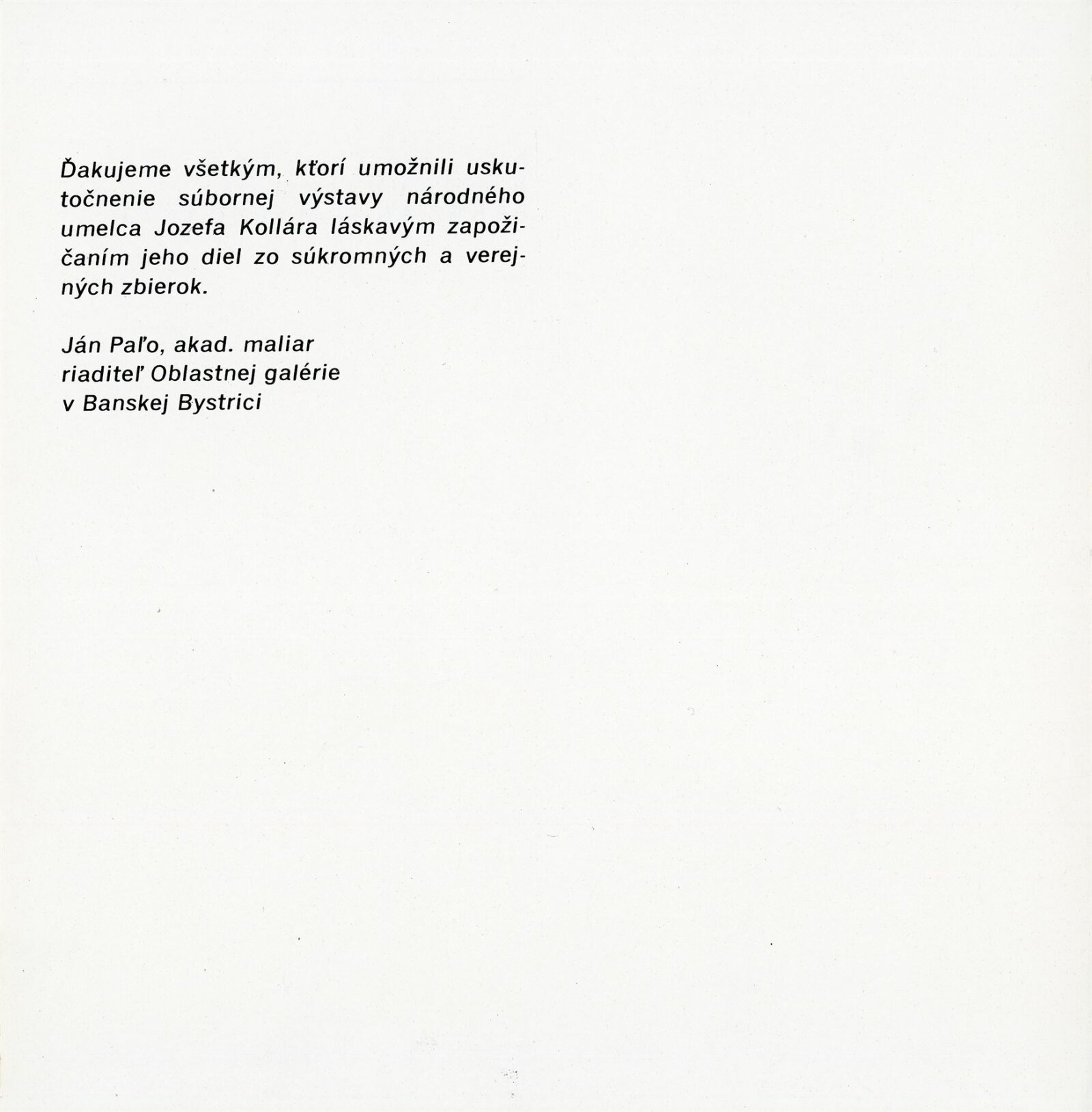 Obrazy národního umělce Jozefa Kollára: Dům umění / Dům pánů z Kunštátu, 22. 4. – 3. 6. 1973 / Převzatý katalog. Jozef Kollár. Súborné dielo: Oblastná galéria Banská Bystrica, únor–březen 1973 / Text Ľudo Petránsky. – Banská Bystrica: Oblastná galéria, 1973. – 32 s., 6 l., obr., 118 s. obr. příl., životní data, výstavy, bibliografie, DPK 537