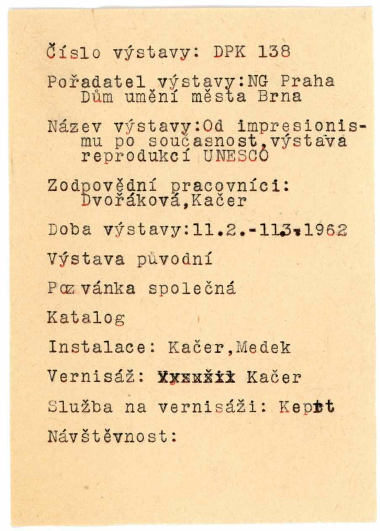 karta k výstavě, seznam vystavených prací, korespondence (převzetí výstavy – Polička, Litomyšl, Vyškov, Prešov, NG Praha, dopis o posunutí všech výst. termínů kvůli poškození výstavy)