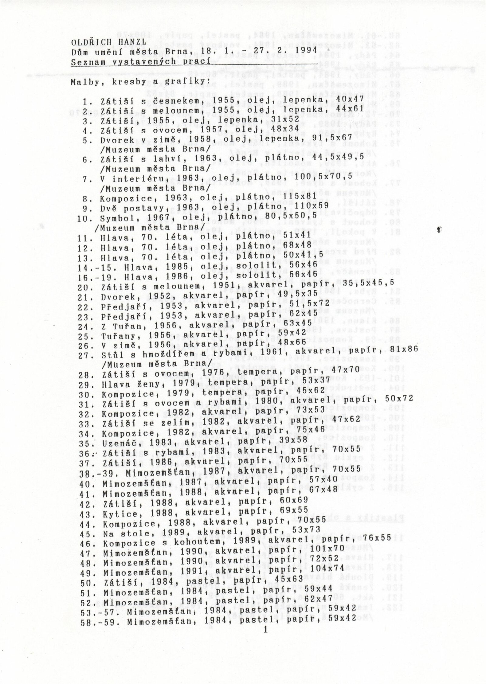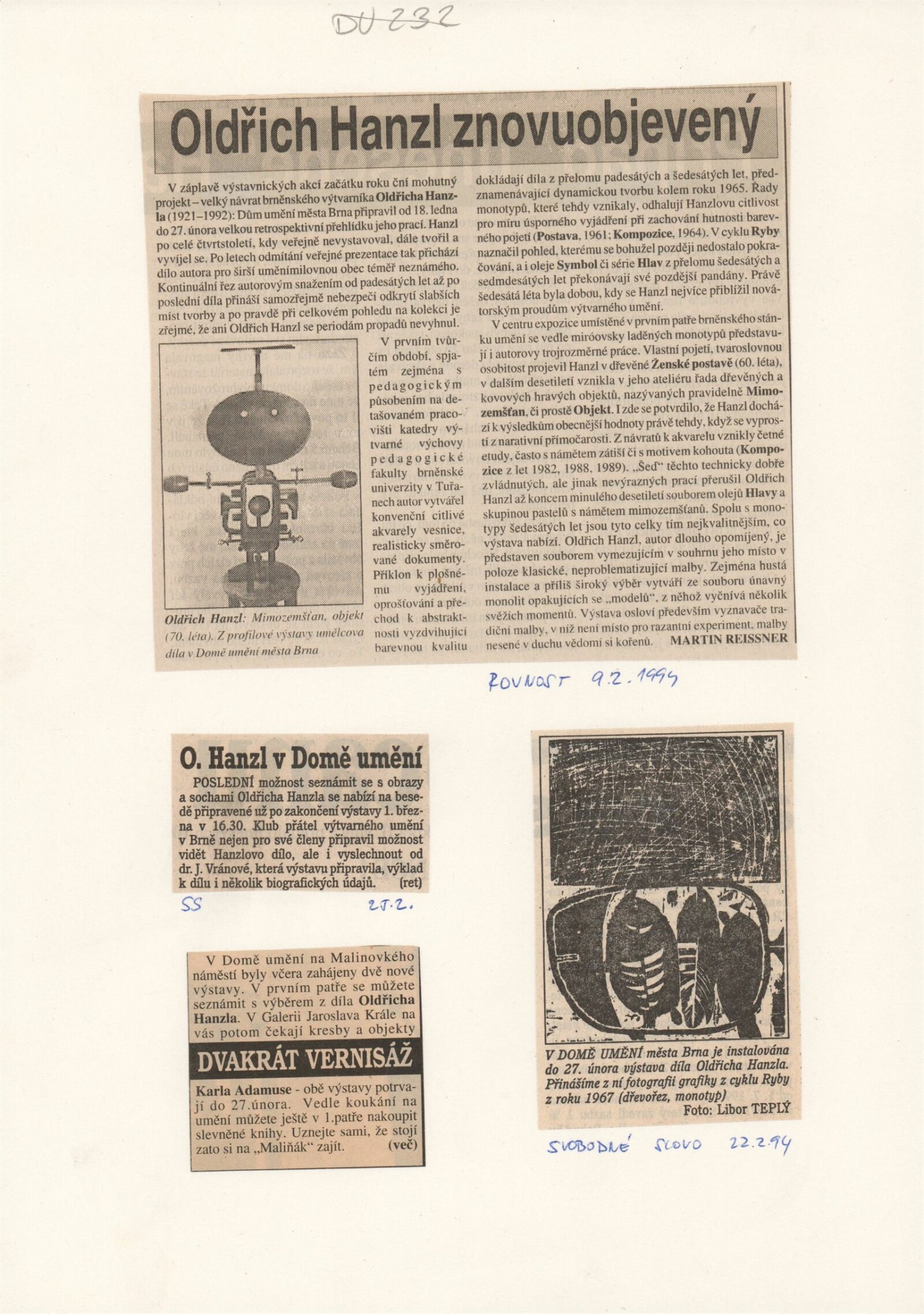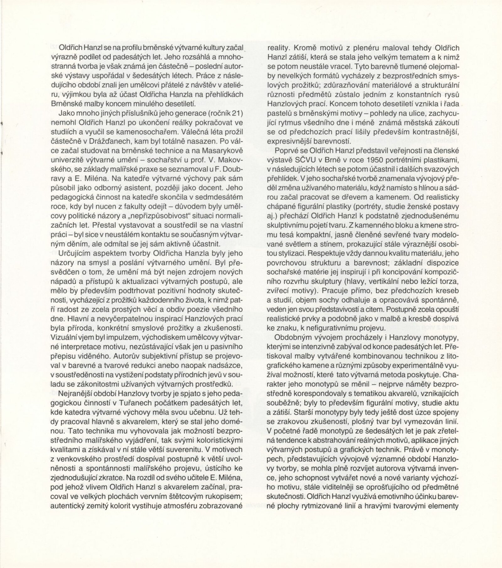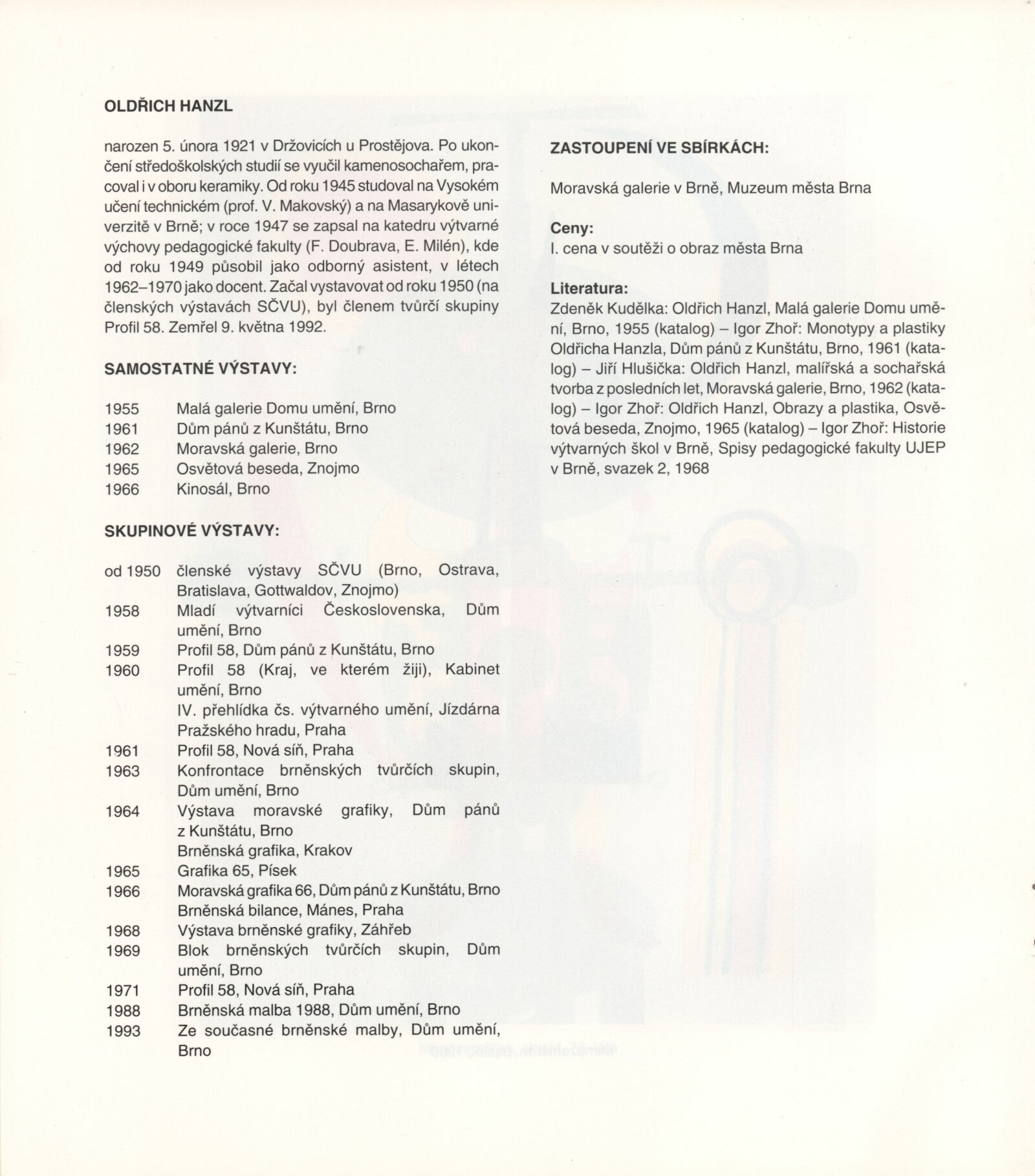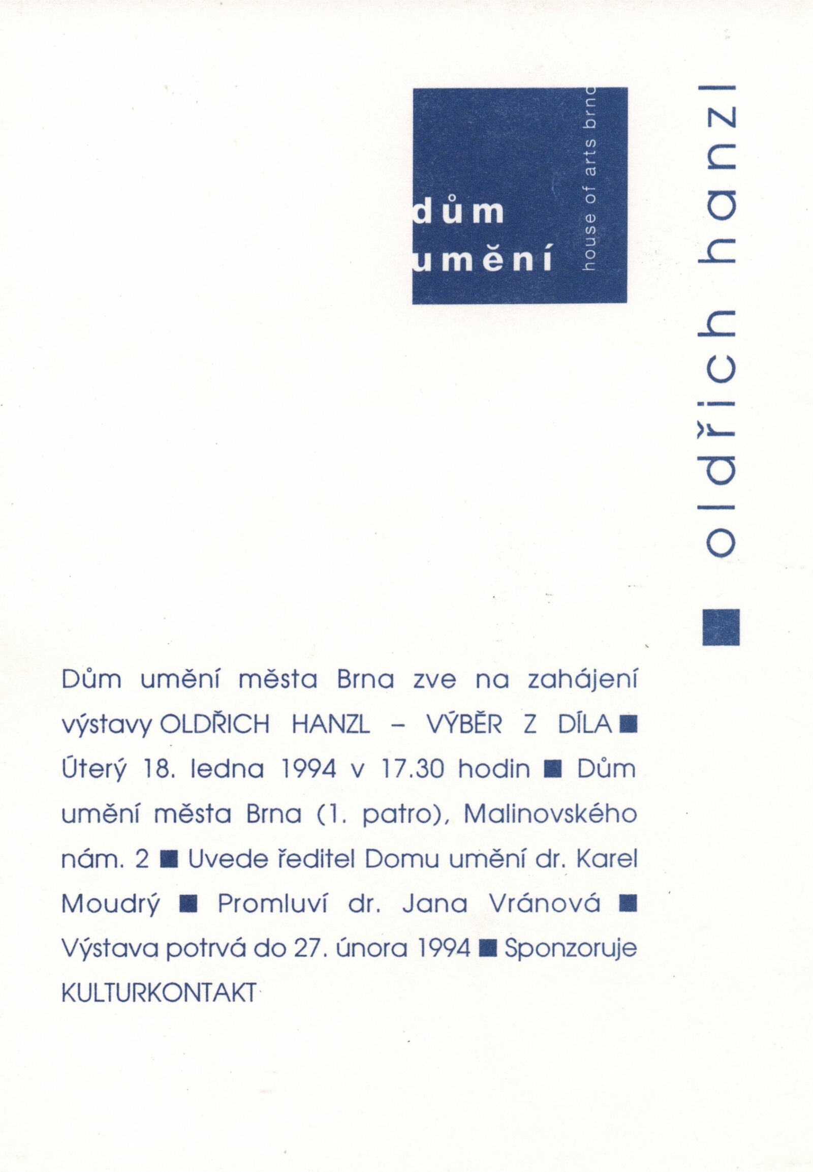 Oldřich Hanzl. Výběr z díla: Dům umění města Brna 18. 1. – 27. 2. 1994 / Text Jana Vránová. - Brno: DUmB, - [12] s., obr. Životopis, výstavy, zastoupení ve sbírkách, ceny, bibliografie DU 961; MZK