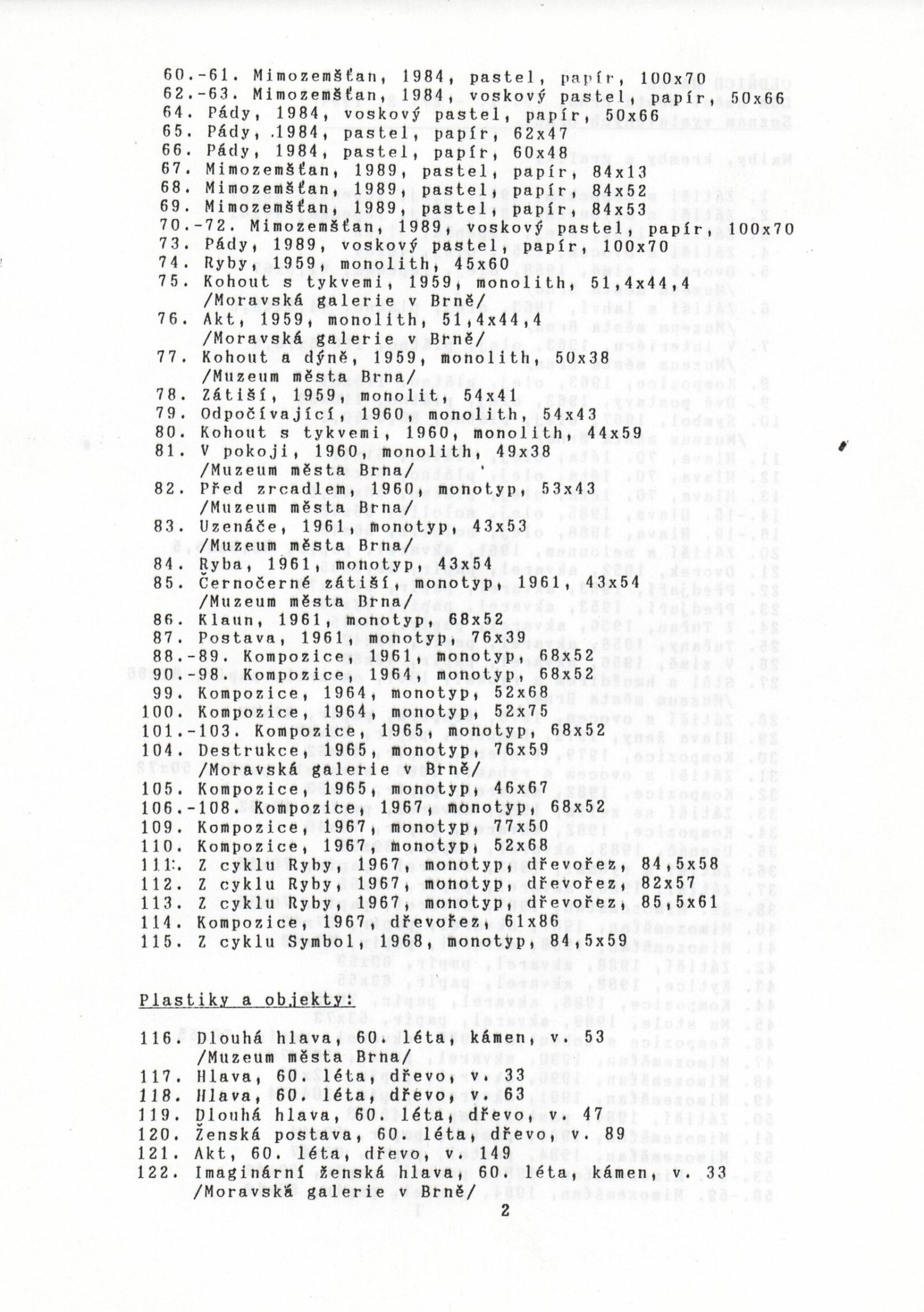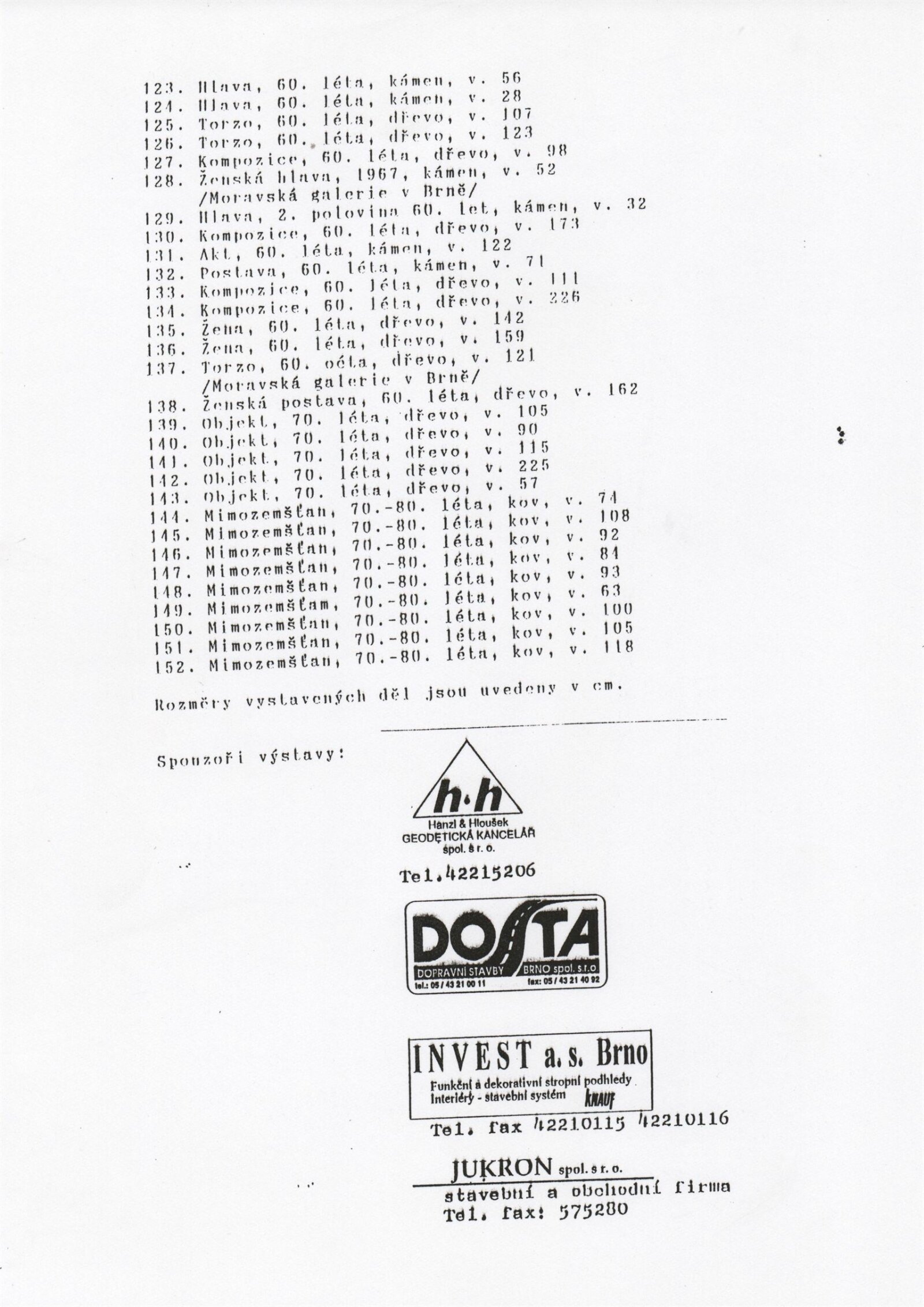 pozvánka, katalog, podklady pro katalog, fotografie děl a z vernisáže, seznam vystavených děl, texty o autorovi, korespondence, smlouvy o výpůjčce, recenze v tisku