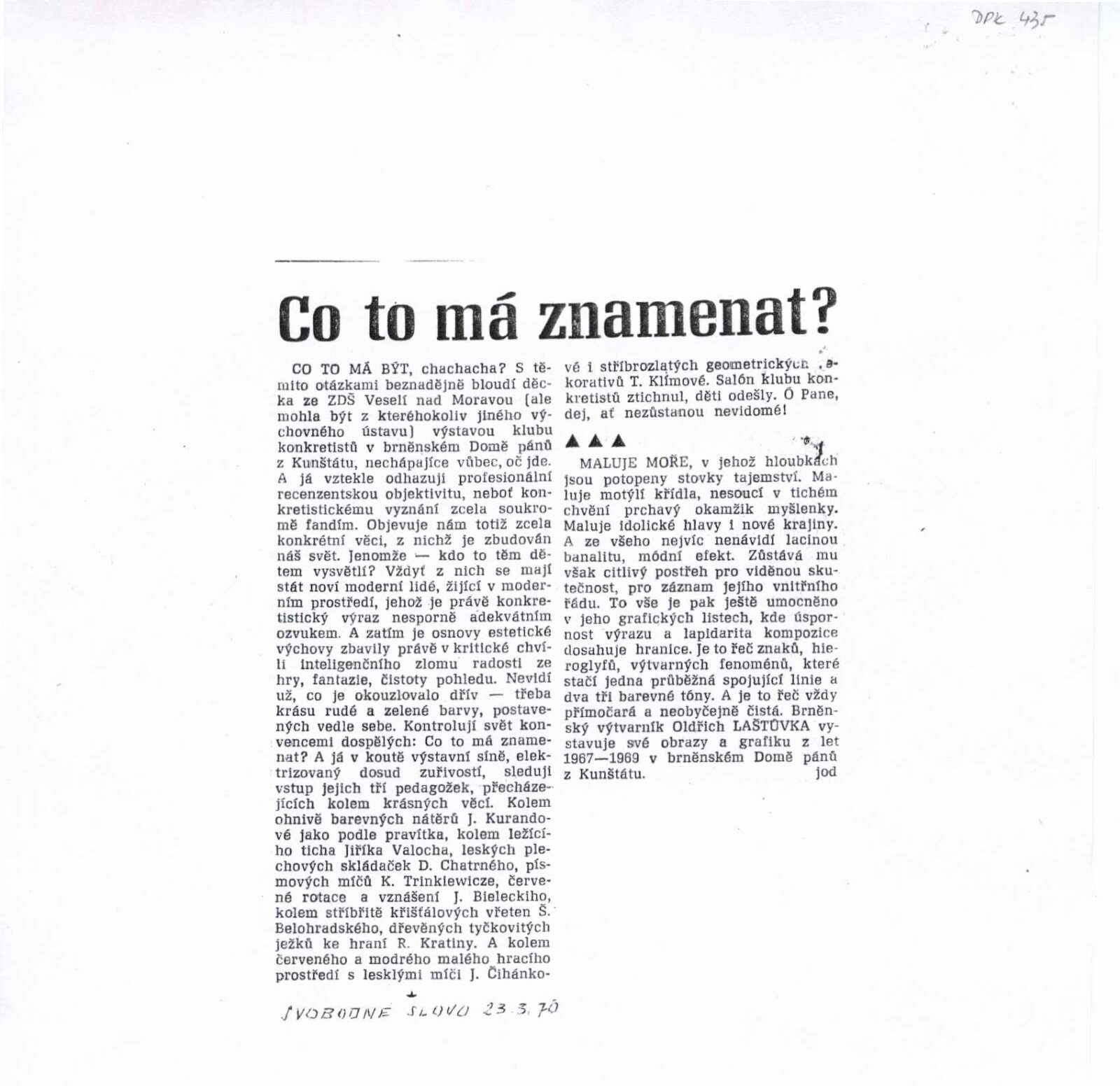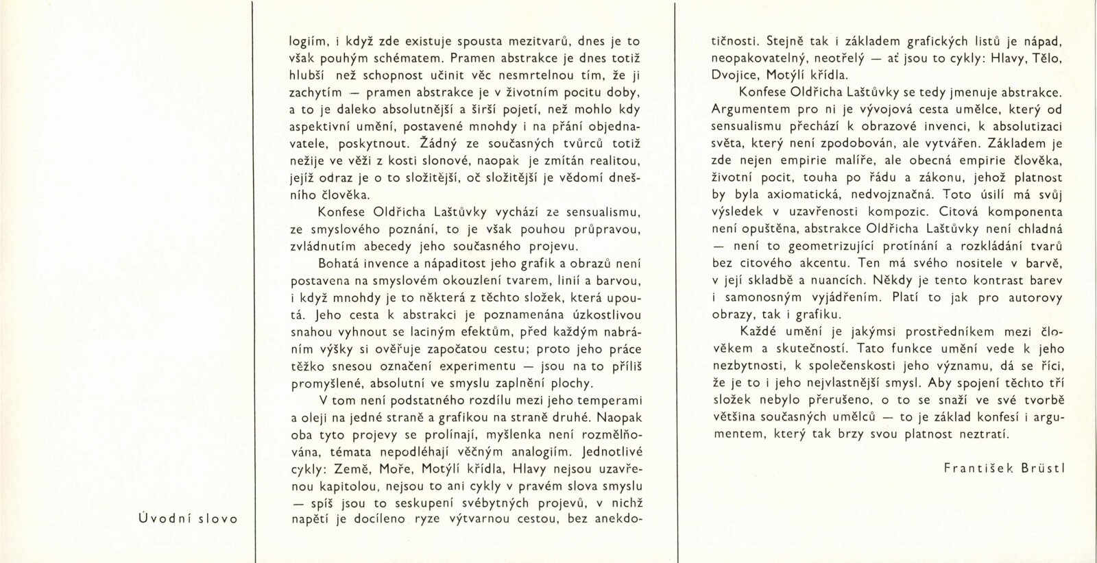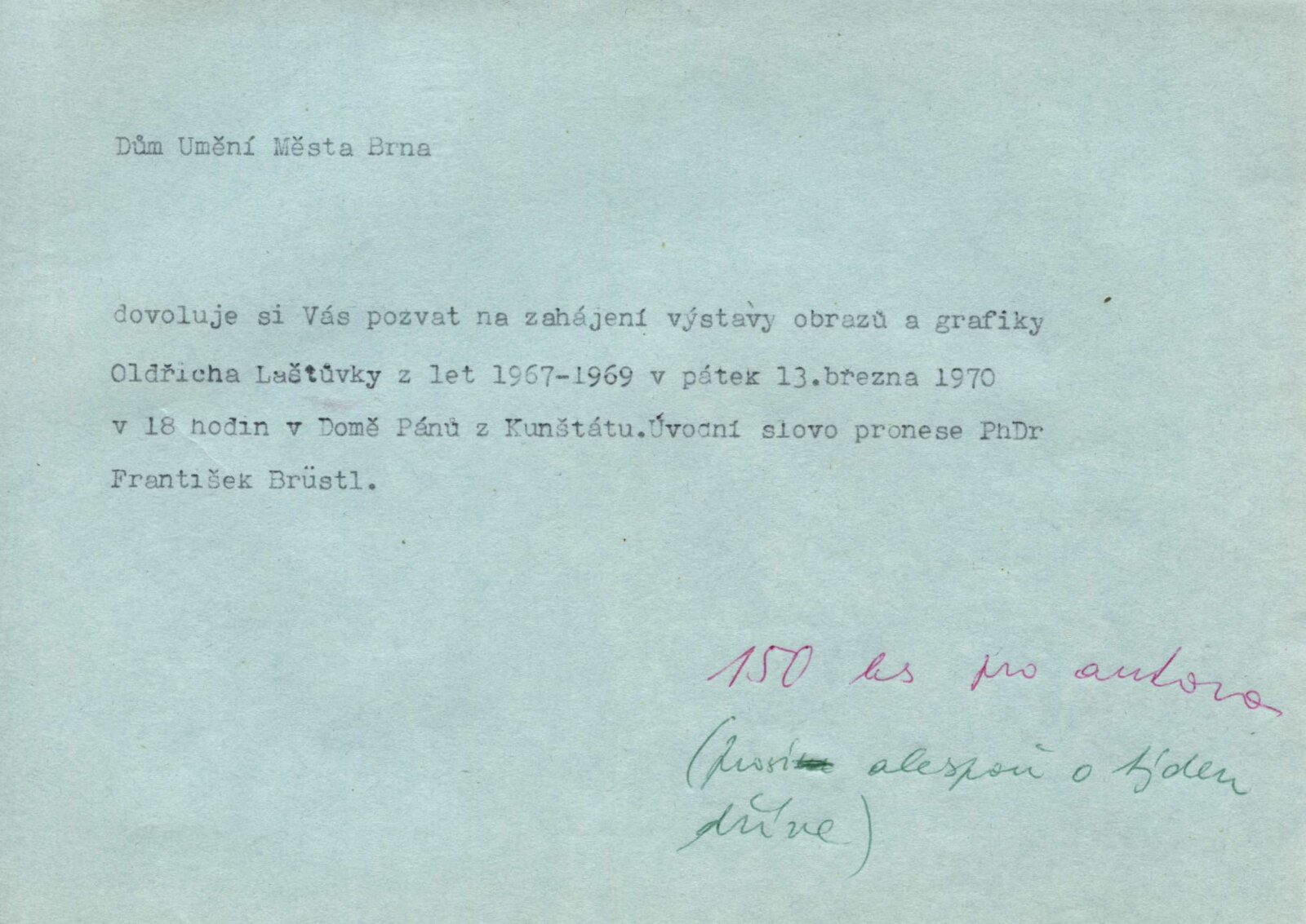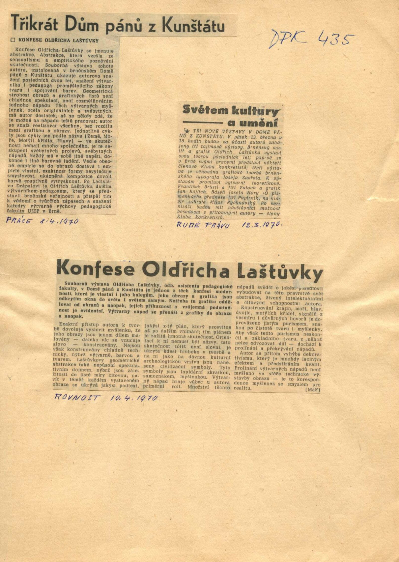 Oldřich Laštůvka. Obrazy, grafika 1967–1969: Dům umění města Brna / Dům pánů z Kunštátu, 13. 3. – 29. 3. 1970 / Text: František Brüstl. – Brno: DUmB, 1970. – 18 s., obr., životní data, DPK 435. – MZK; MG; MMB