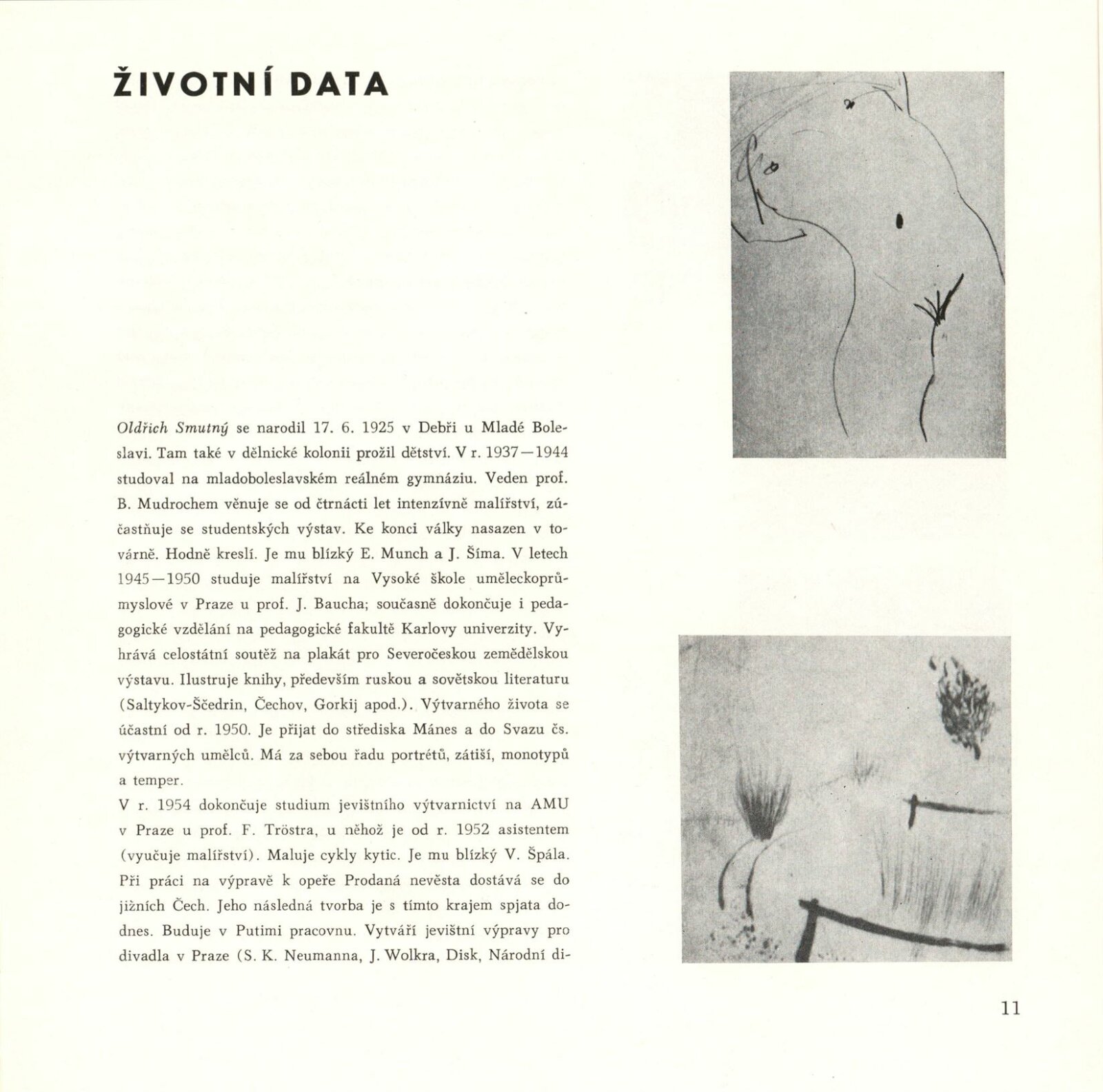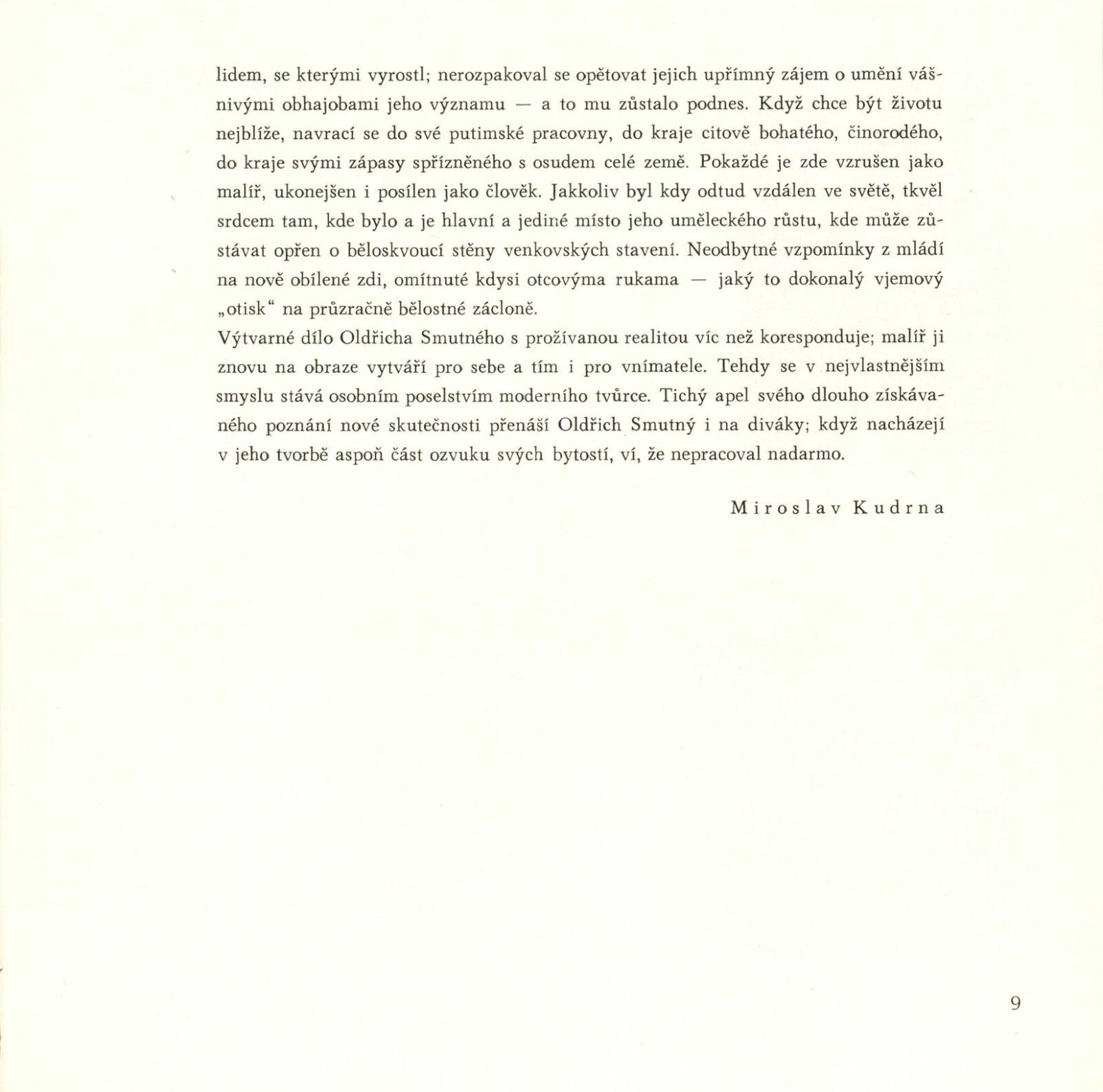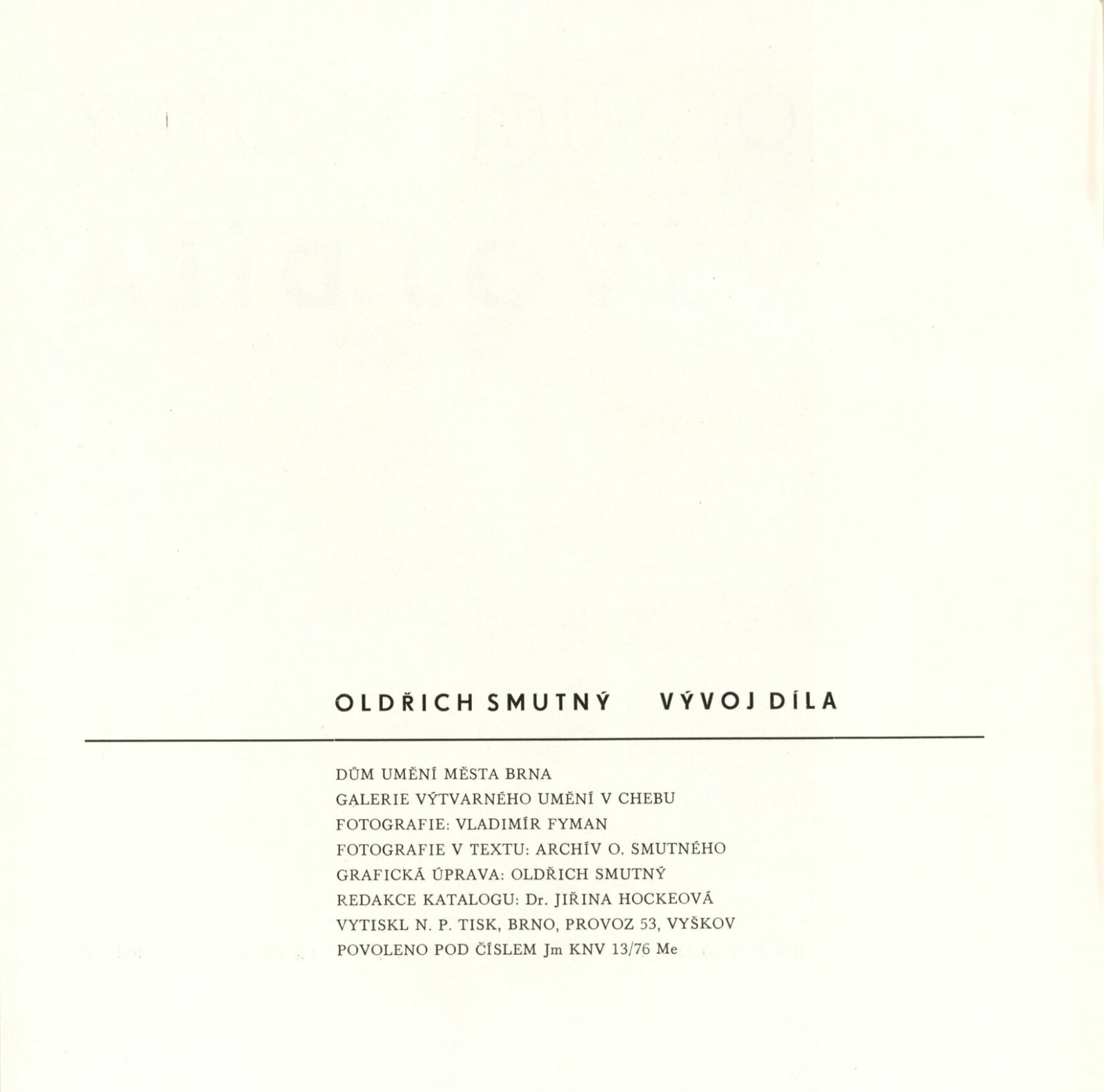 Oldřich Smutný. Vývoj díla: Dům umění / Dům pánů z Kunštátu, 25. 4. – 23. 5. 1976 / Texty: Miroslav Kudrna a autor. – Brno: DUmB, 1976. – 39 s., obr., portrét, životní data, DPK 629. – MZK; MG; MMB