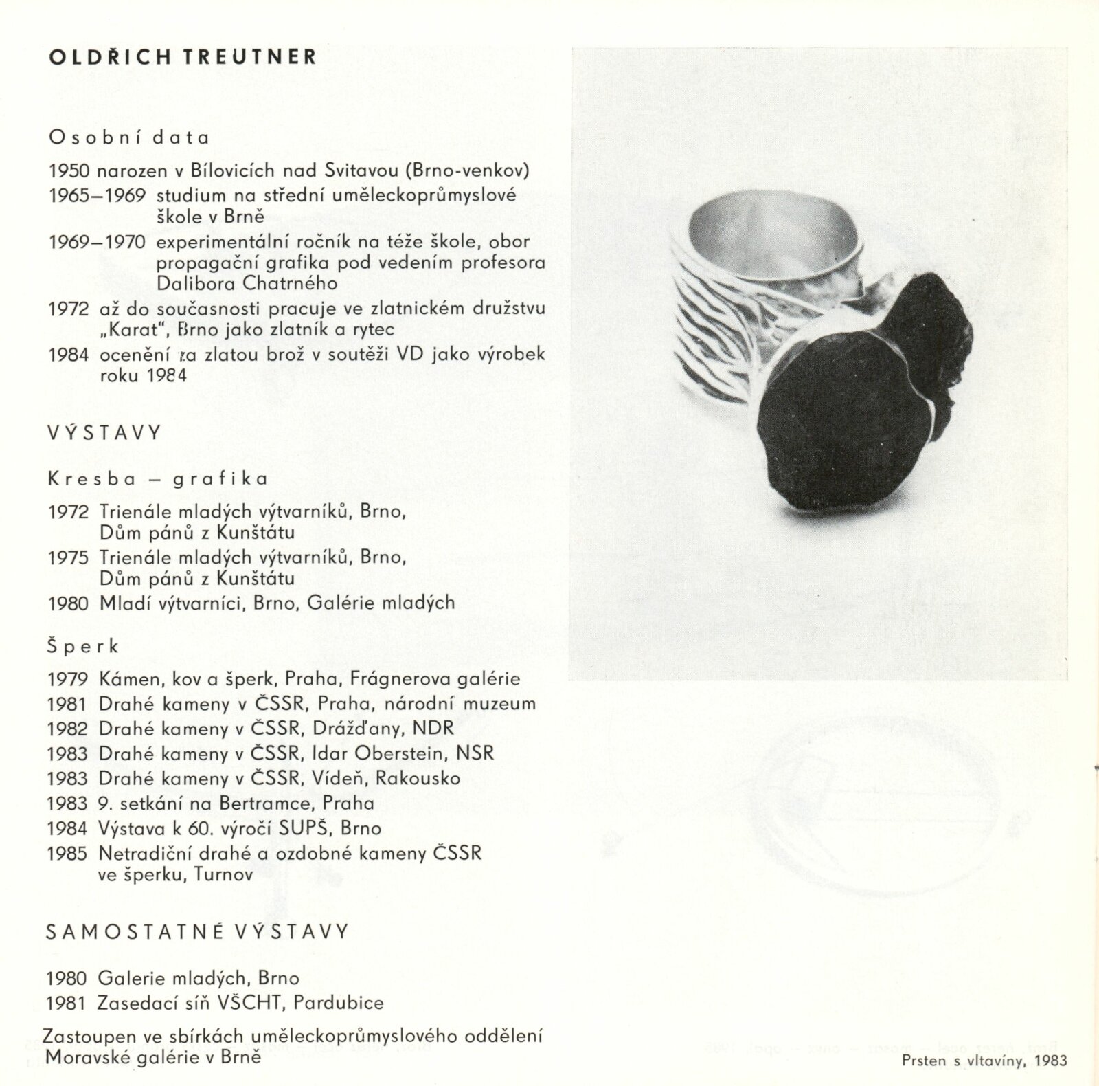 Oldřich Treutner. Šperky: Dům umění, hala, 14. 1. – 23. 2. 1986 / Text: Lea Holešovská. – Brno: DUmB, 1986. – 12 s., obr., životní data, výstavy, DU 811. – MZK; MG; MMB