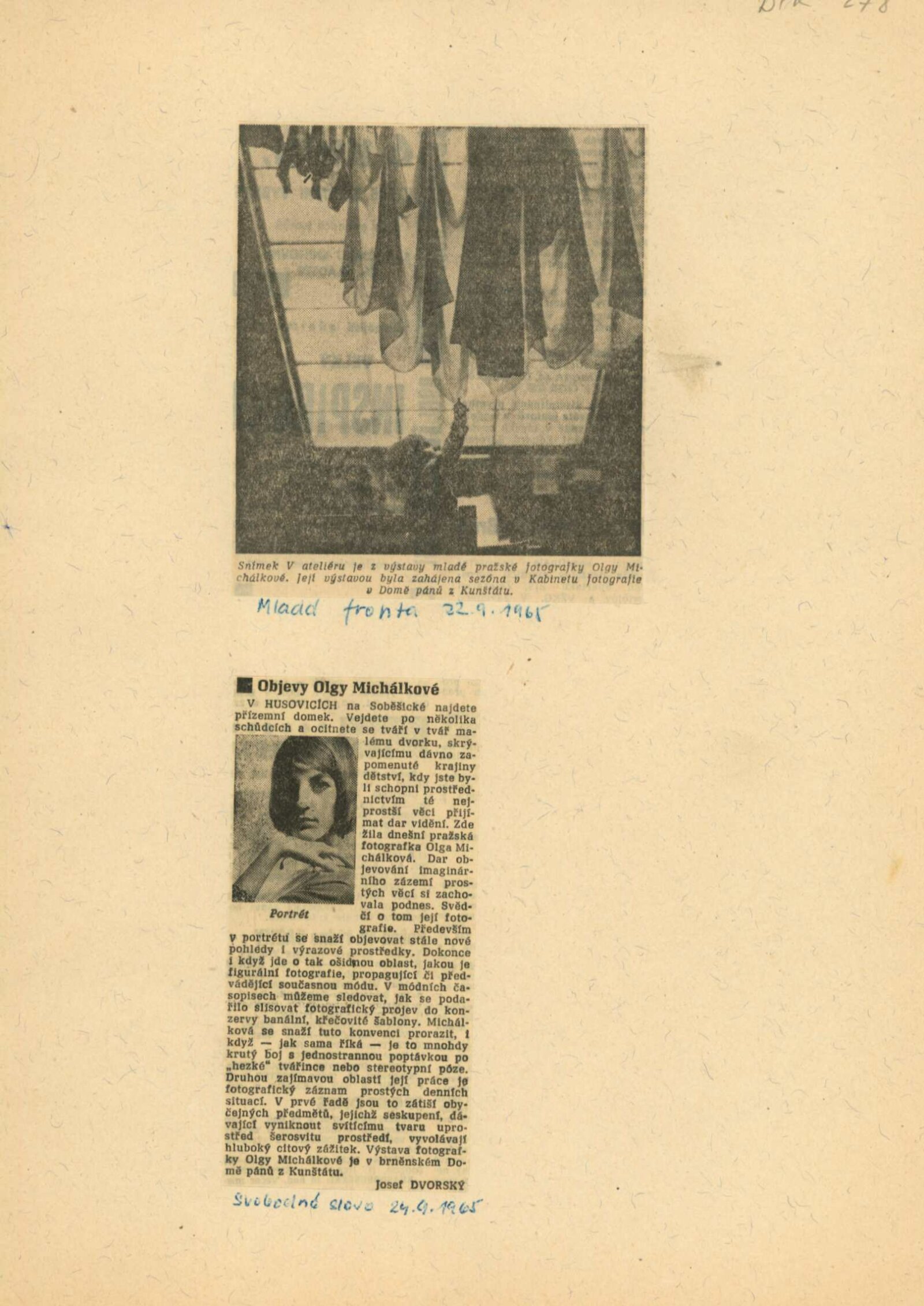 společná pozvánka DPK 277–279, leták výstav DU, korespondence (žádost o výstavu z roku 1959, příprava výstavy pro rok 1965 Olga Michálková/Nina Dvořáková), smlouva k výstavě, recenze v tisku