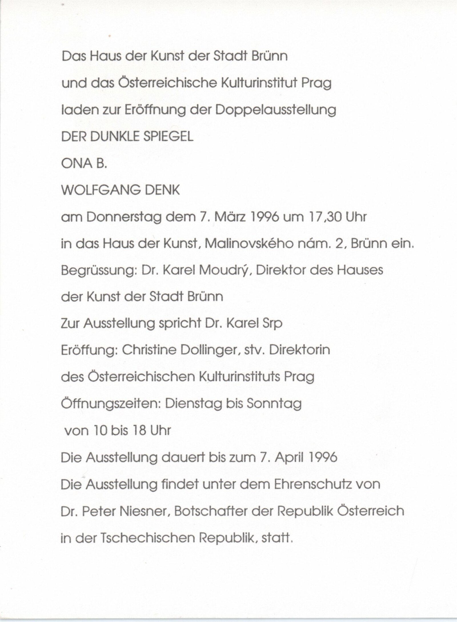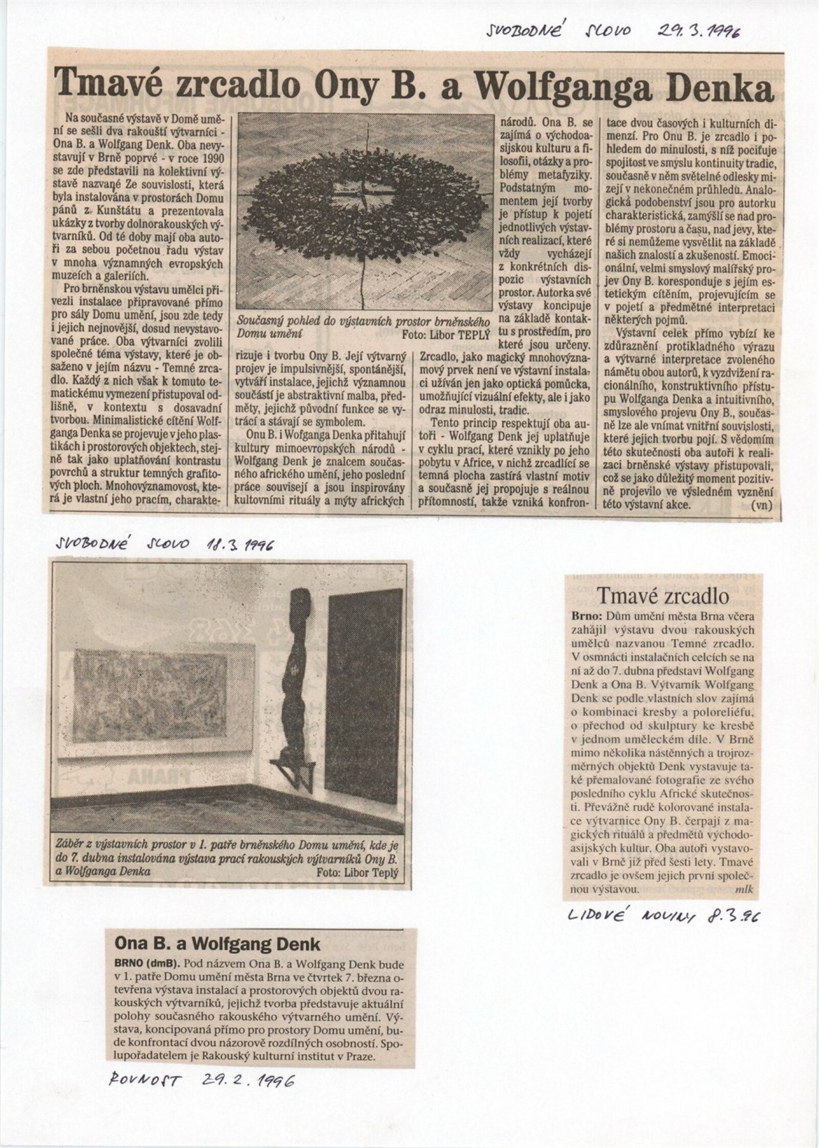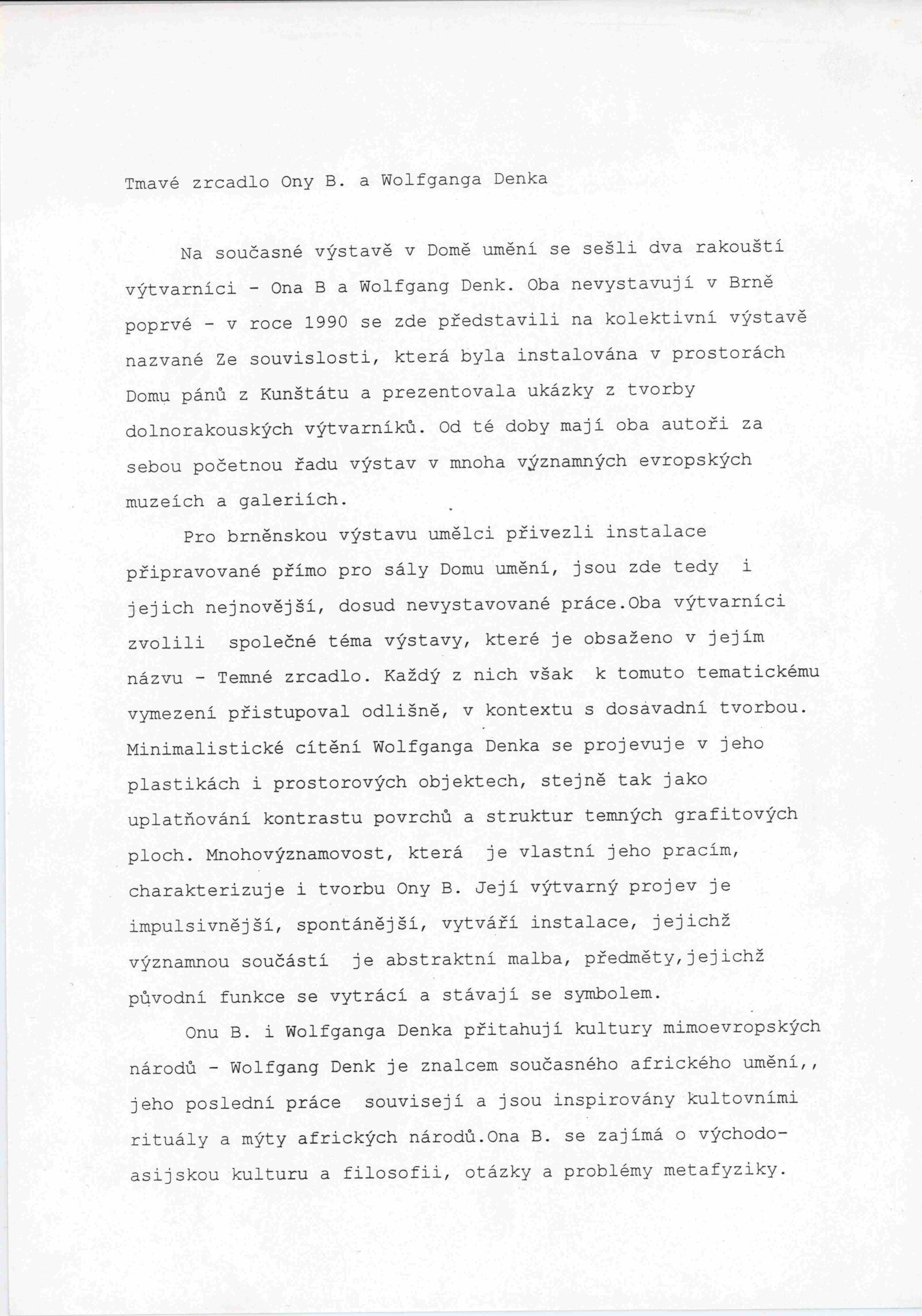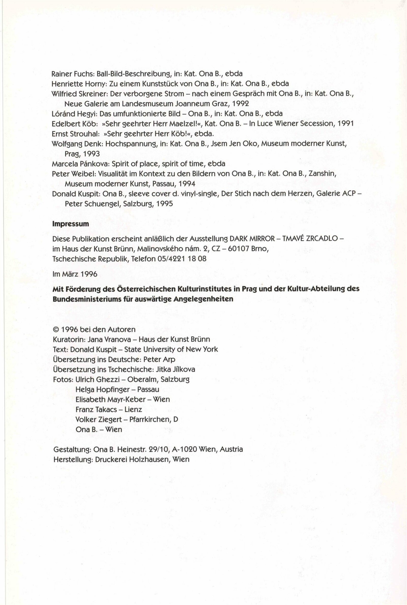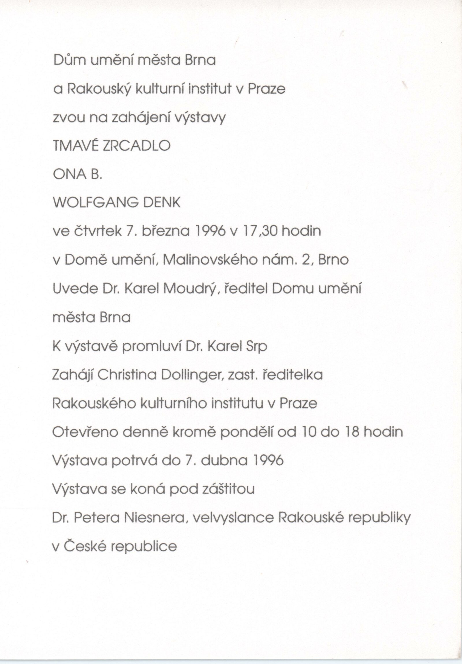 Wolfgang Denk. Tmavé zrcadlo: Dům umění města Brna 7. 3. – 7. 4. 1996. - Zöbing: Wolfgang Denk - [32] s., obr. Název též anglicky Ona B. Tmavé zrcadlo: Dům umění města Brna März 1996 / Text Donald Kuspit. - Wien: Ona B., - [32] s., obr. Bibliografie DU 1021