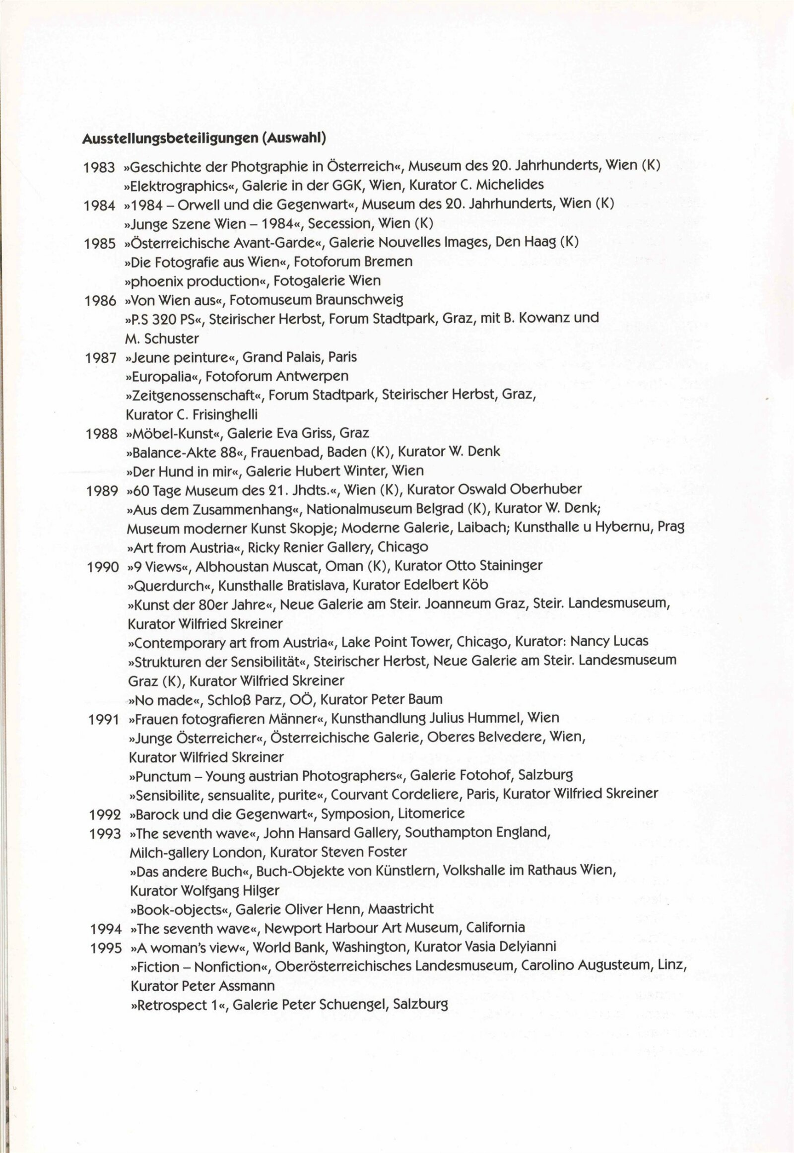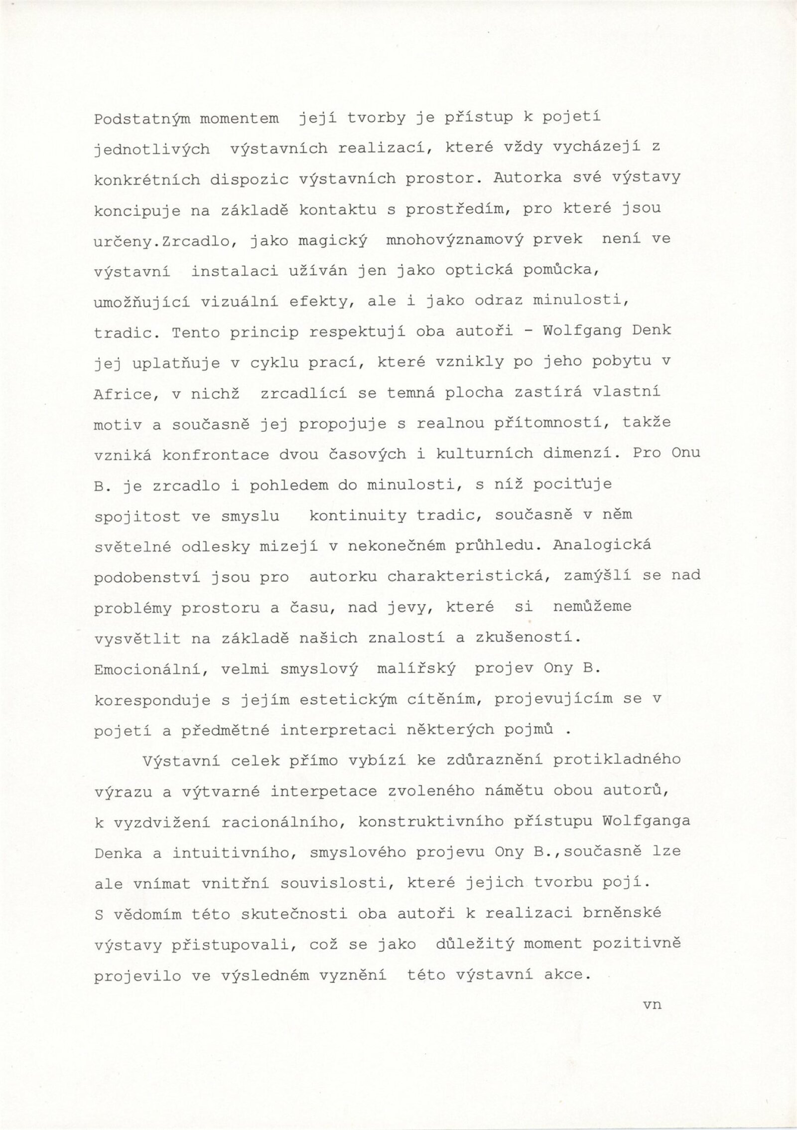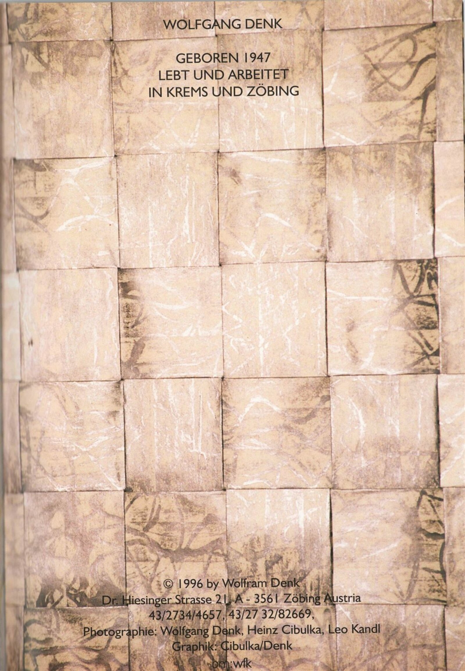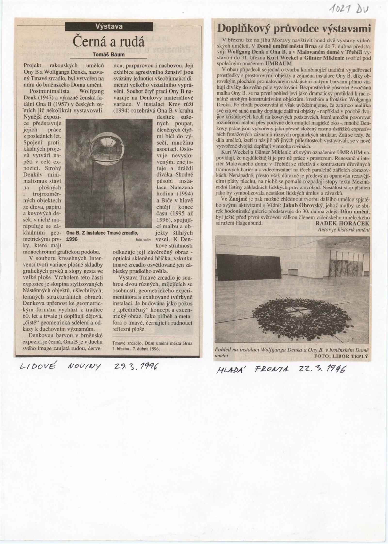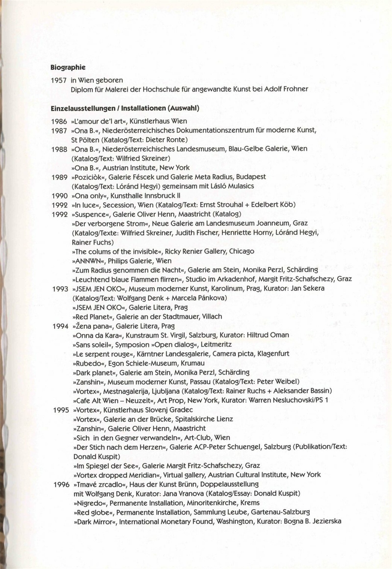 Wolfgang Denk. Tmavé zrcadlo: Dům umění města Brna 7. 3. – 7. 4. 1996. - Zöbing: Wolfgang Denk - [32] s., obr. Název též anglicky Ona B. Tmavé zrcadlo: Dům umění města Brna März 1996 / Text Donald Kuspit. - Wien: Ona B., - [32] s., obr. Bibliografie DU 1021